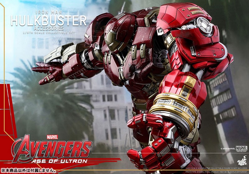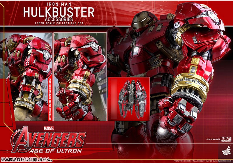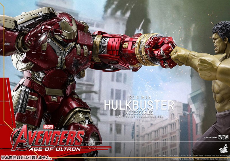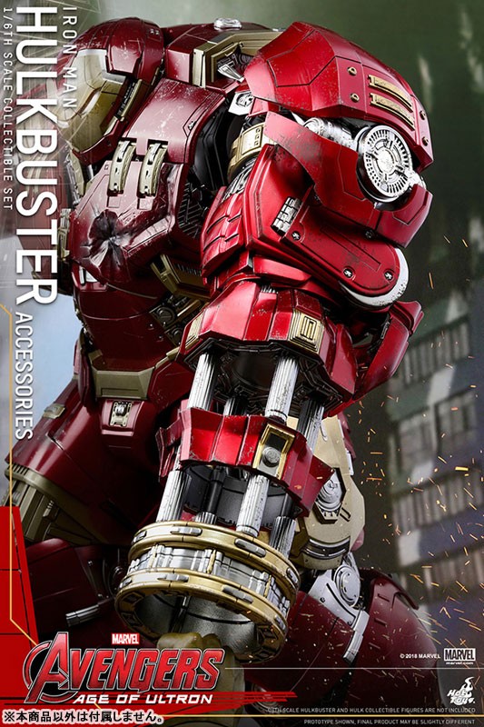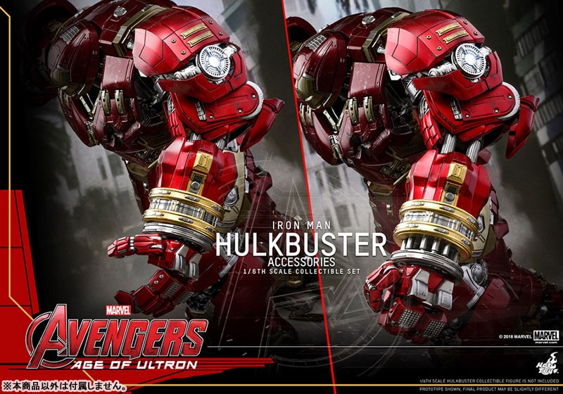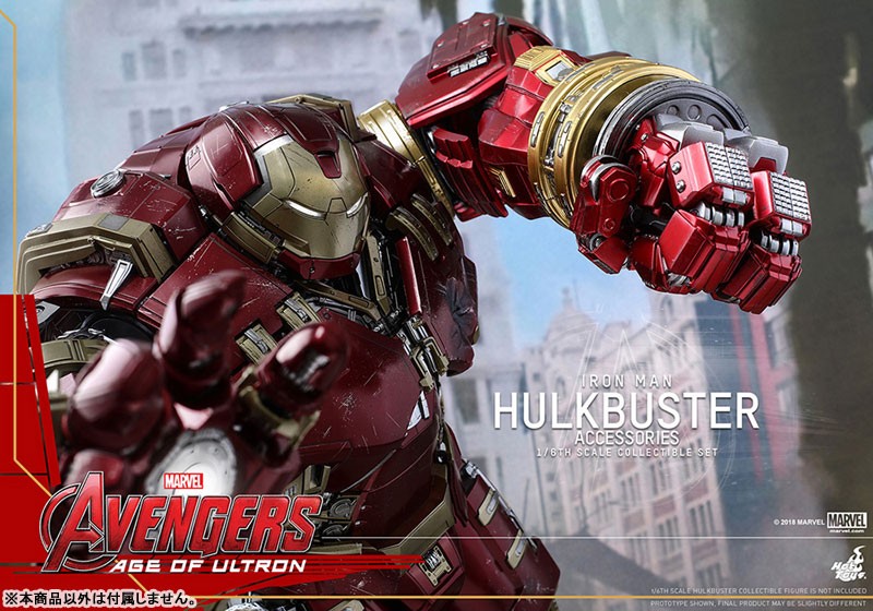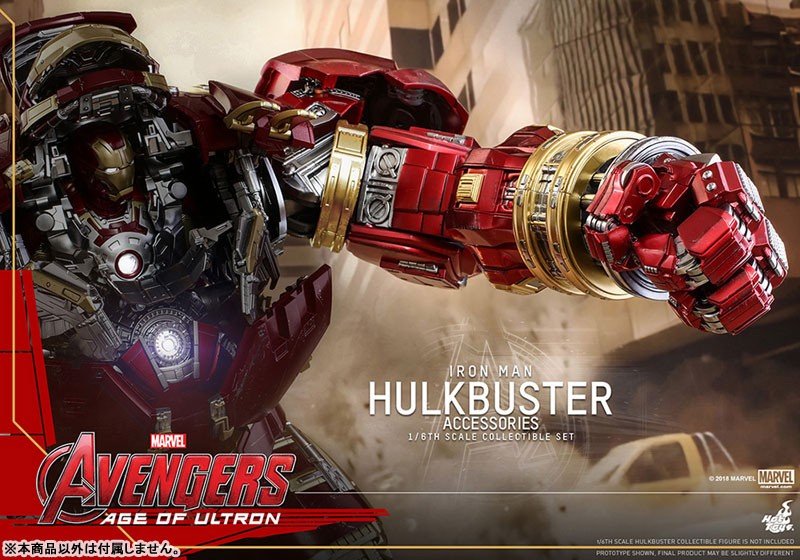 【スケール】1/6 【サイズ】ジャックハンマー・アーム:全長約35cm(伸張時:全長約41cm) / ハルクバスター・ポッド:全高約6cm 【可動ポイント】ジャックハンマー・アーム:9箇所 【使用電池】ボタン電池 【その他】ライトアップ機能付き 【セット内容一覧】 ジャックハンマー・アーム 差し替え用前腕部パーツ(拘束用) ハルクバスター・ポッドホットトイズのフィギュアをさらに楽しむことができる【ホットトイズ・アクセサリー・コレクション】より、「ムービー・マスターピース」『アベンジャーズ/エイジ・オブ・ウルトロン』ハルクバスター(別売り)をパワーアップさせる、拡張パーツセットが登場だ! ホットトイズの「ムービー・マスターピース」『アベンジャーズ/エイジ・オブ・ウルトロン』ハルクバスターをさらにパワーアップすることができる本セット。高速パンチを連打するジャックハンマー・アーム、ハルクの腕を掴んだ拘束用のパーツ、ハルクバスターを搭載していた「ベロニカ」ことハルクバスター・ポッドといった、豪華なアクセサリーが揃っている。全長約35センチのジャックハンマー・アームは、LEDライトアップ機能を搭載。さらに9箇所以上の可動を設けることで、パンチを繰り出す動作の再現度を高めているぞ。 ※【ムービー・マスターピース】ハルクバスターは別売りです。