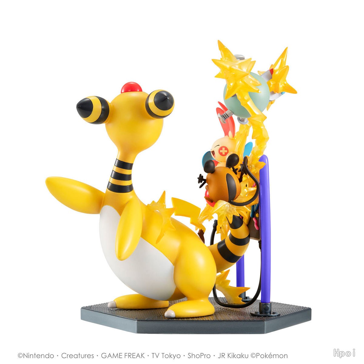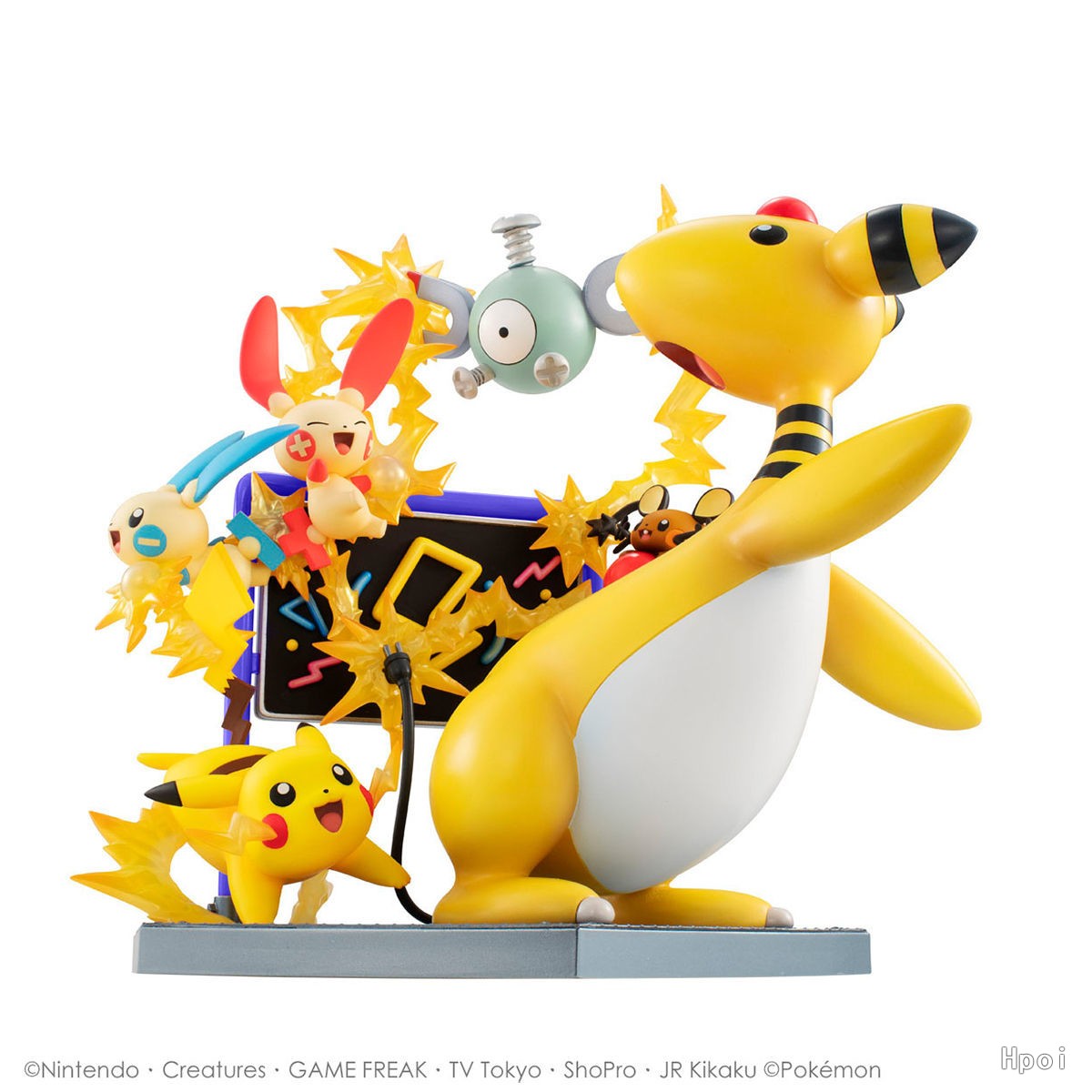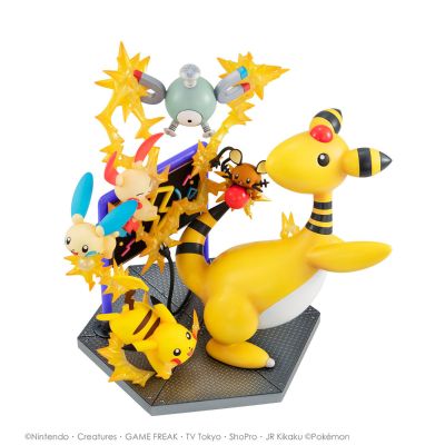 来自将宝可梦同伴们的羁绊立体化的G.E.M.EX宝可梦系列,集合了各种拥有「电属性」的宝可梦的手办闪亮登场!每只宝可梦都在放电,让在它们中间的霓虹光管发光的造型,简直是只有「电属性」才能表现出来的设计。可以欣赏到宝可梦们充满活力的可爱造型。氛围感十足的立体底座同样值得注目。不论从哪个角度去看都充满看点,是一款让人称心满意的大分量手办。和过往发售的其他系列并列在一起,进一步扩展宝可梦的世界吧!
