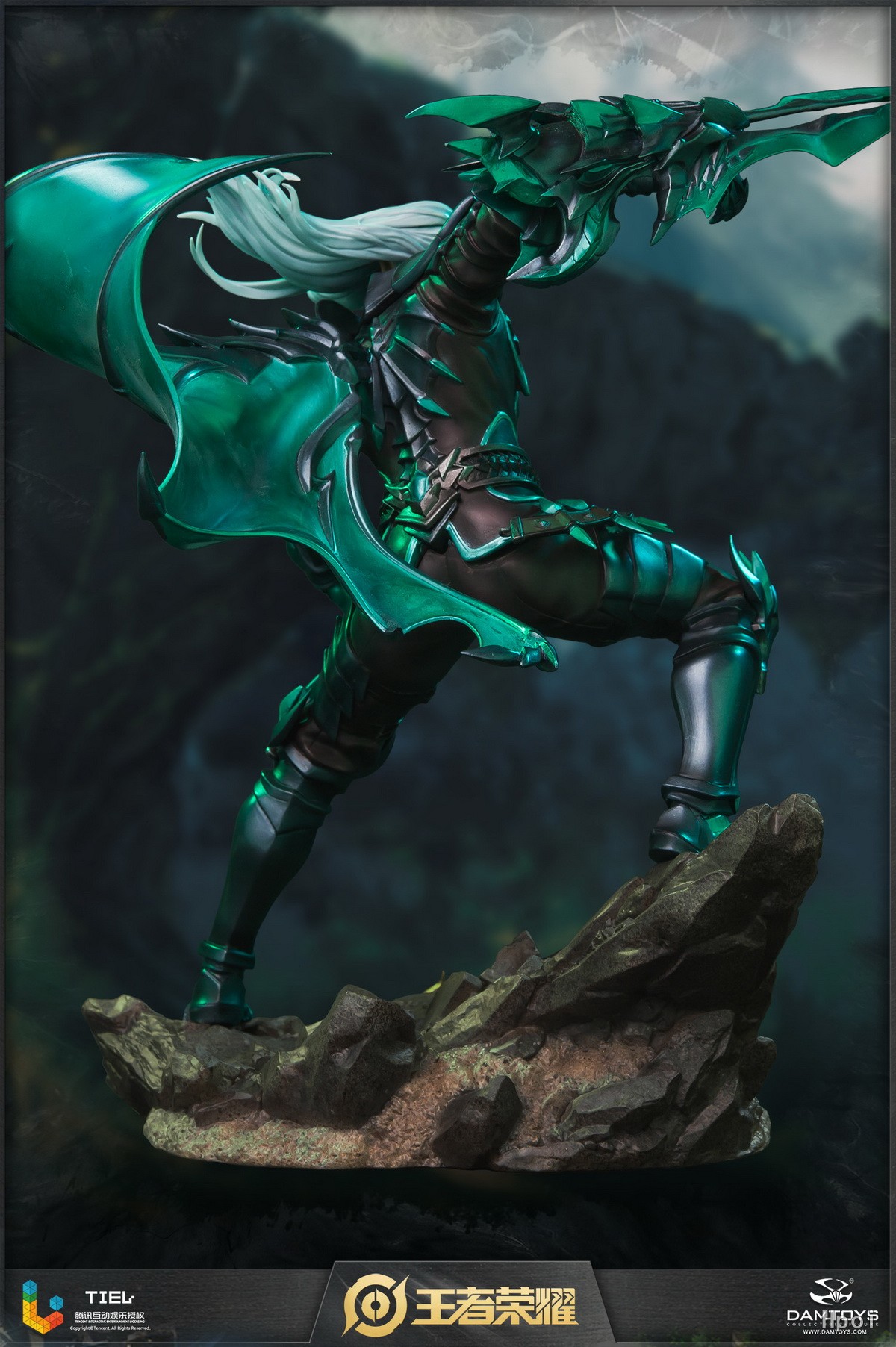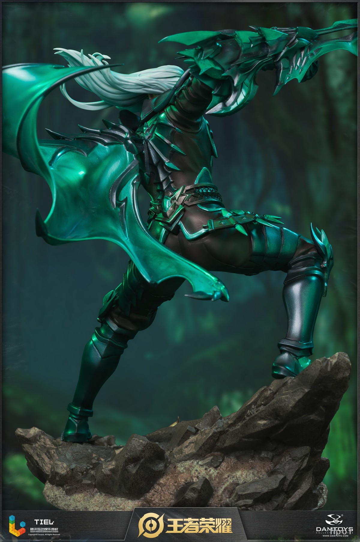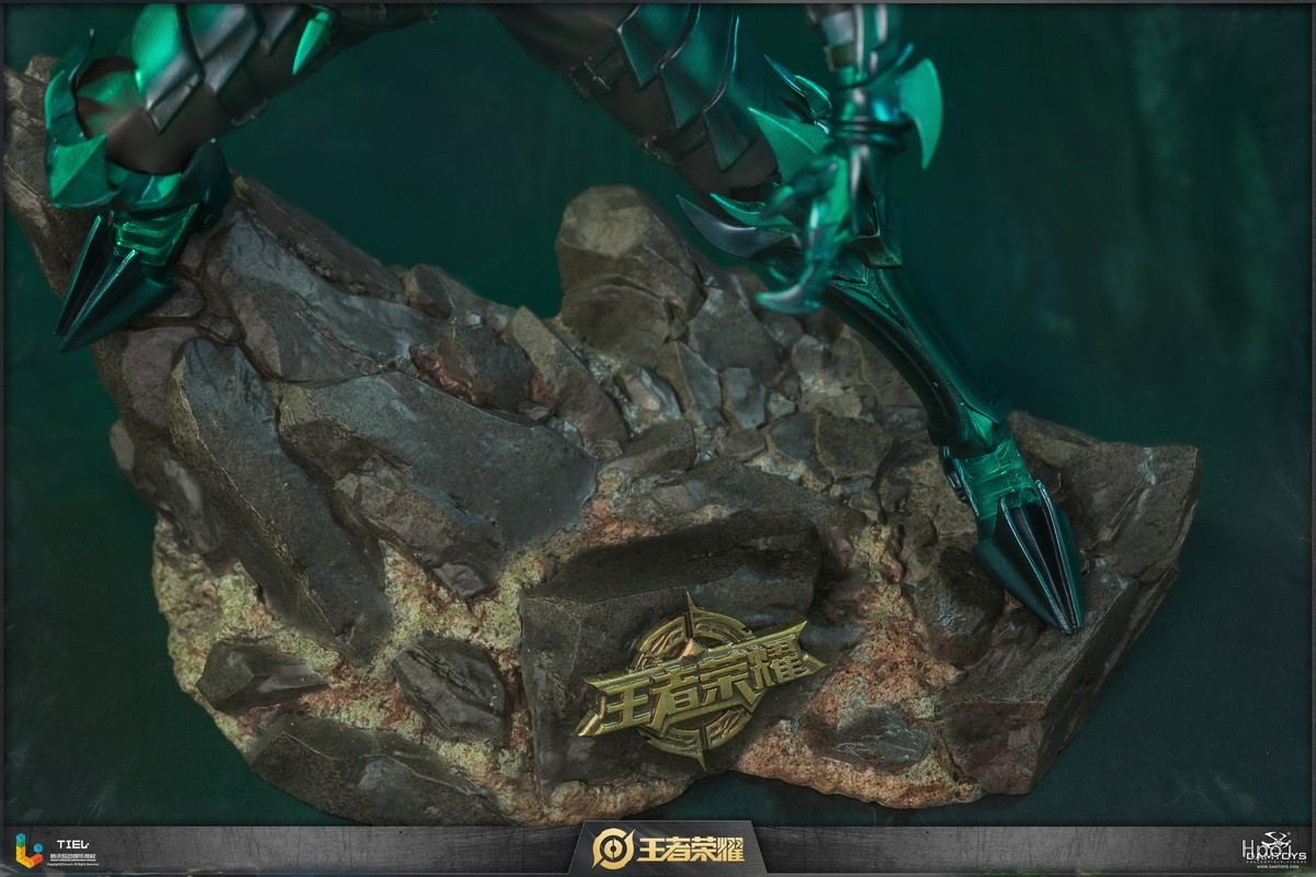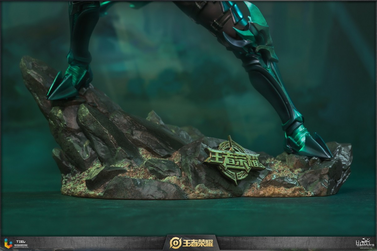 雕像展现了兰陵王跃起劈砍的瞬间。斗篷划出优雅弧线,飘逸的银发飞舞,将刺客的敏捷身姿表现地淋漓尽致。