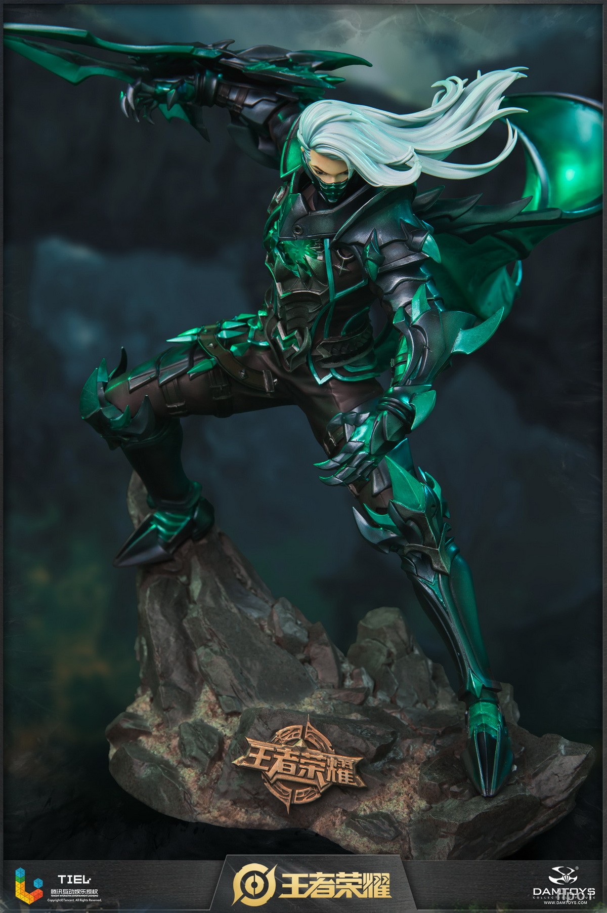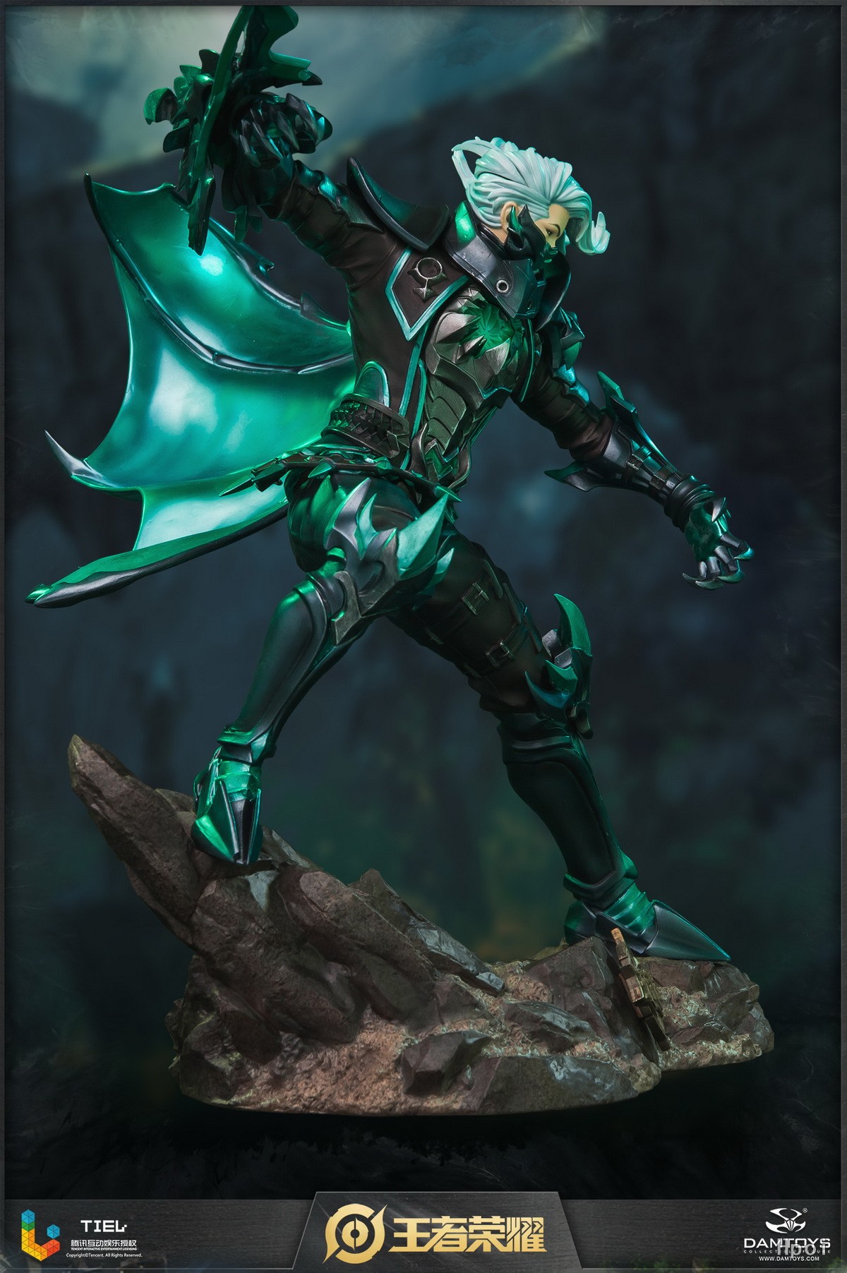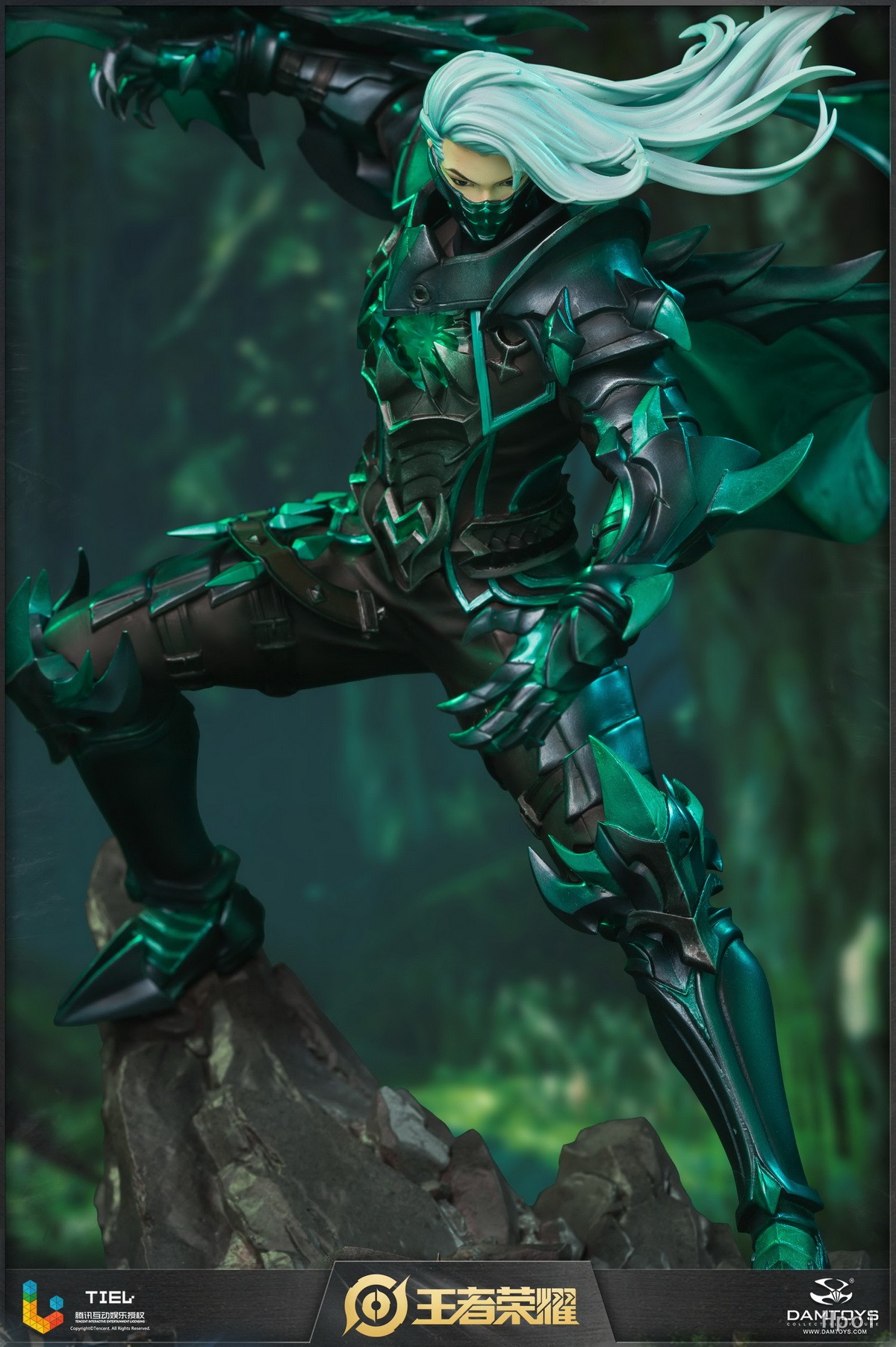 雕像展现了兰陵王跃起劈砍的瞬间。斗篷划出优雅弧线,飘逸的银发飞舞,将刺客的敏捷身姿表现地淋漓尽致。