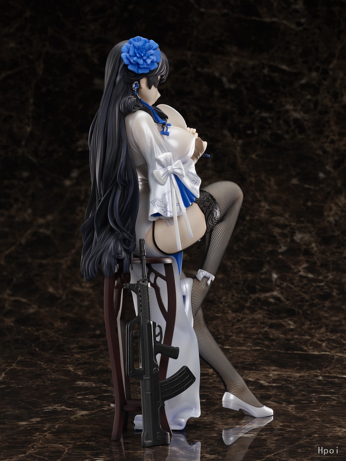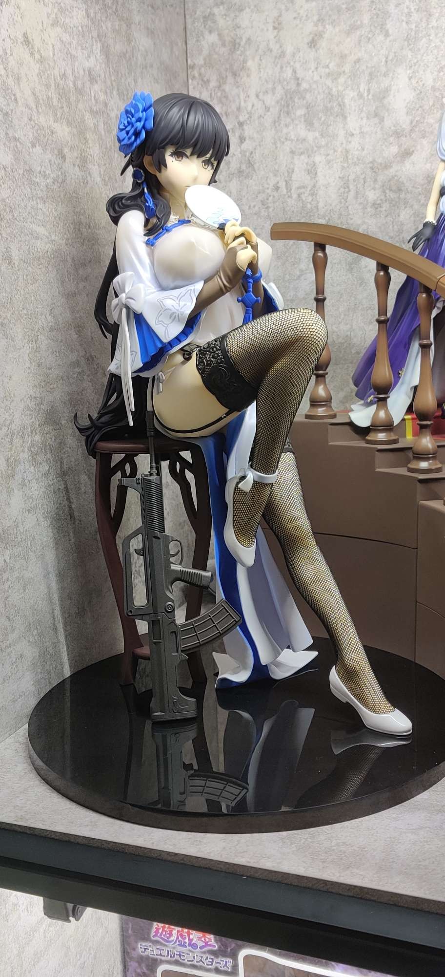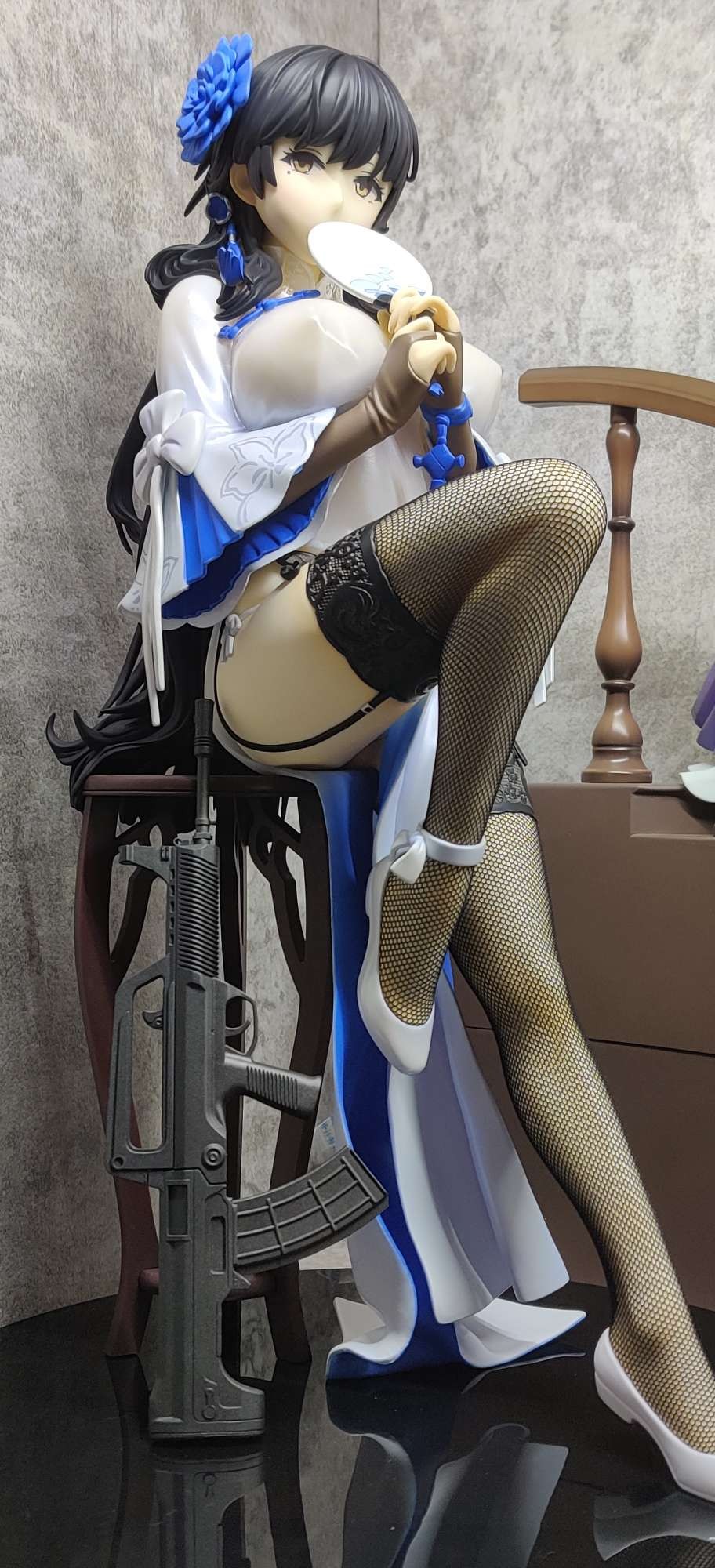 出自《少女前線》,「95式」化身為1/4比例模型!將期間限定「新春慶典主題裝扮」中登場的「玉玲瓏」旗袍姿態製成模型。彷彿快撐破衣服的傲人身材、稍微裸露的大腿。除了衣袖與吊帶襪的圖樣,網襪採用布製,如實呈現插圖模樣。隨身攜帶的「95式自動步槍」也以相同比例呈現。此外,還附有擺飾用的椅子。將這款充滿誘人魅力的戰術人形迎接至各位指揮官的身邊吧!
