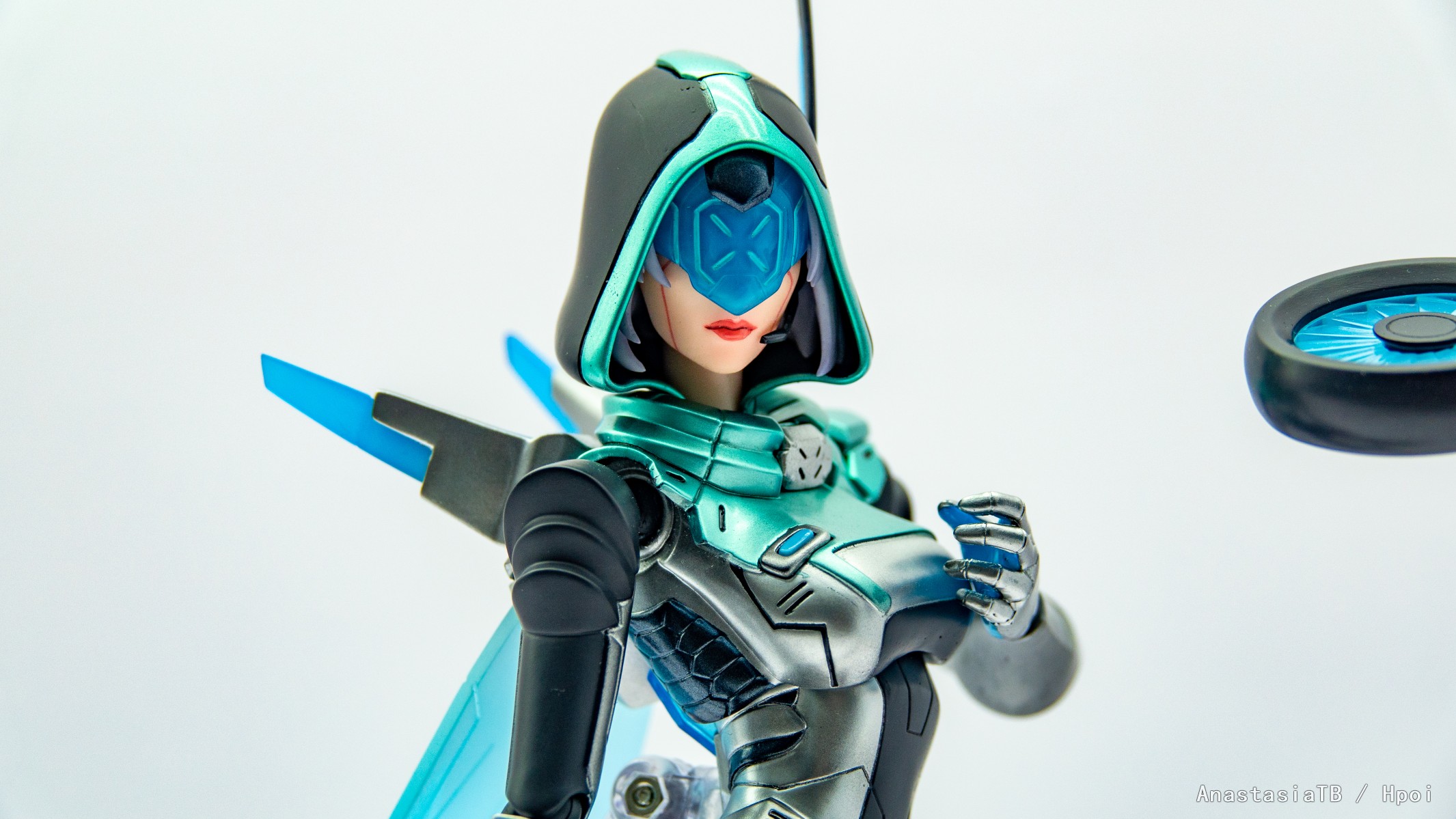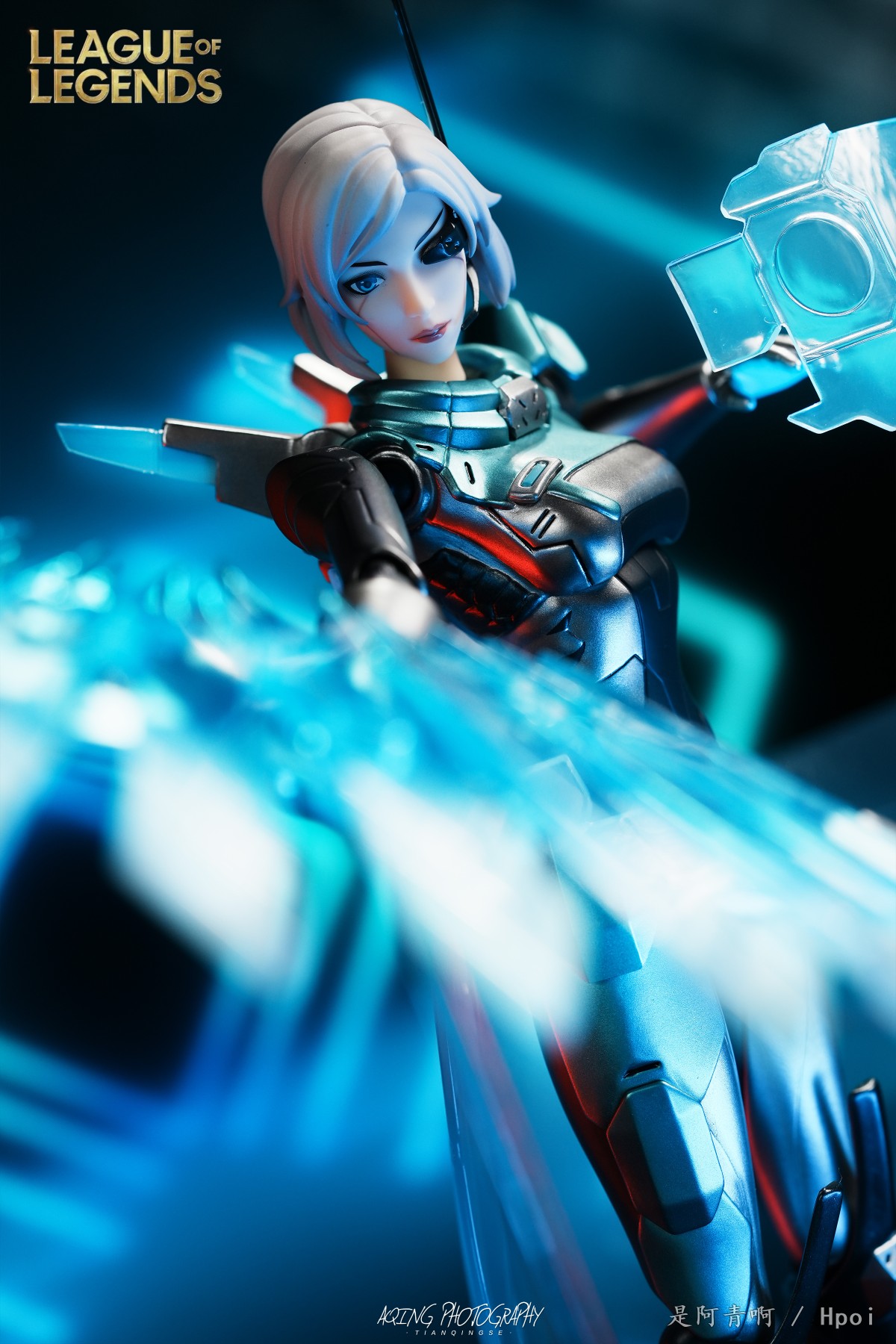 【源计划:联合 艾希】采用了大量金属色涂装,1/8的大比例使得手办的刻画可以更为细致,无论面部的纹路、战斗服的分色、弓箭的机械感亦或各种技能特效的细节,都得以精致还原。艾希的头部面罩及背部特别采用了可发光设计,幽蓝色的光芒搭配上金属漆的质感,科幻感十足。大量的荧光色特效件,覆盖了游戏内英雄的大部分技能,附带的圆型地台可与各种特效件自由组合摆放,完美还原游戏中各种华丽的战斗场面。除此以外,我们还为艾希配备了不戴头罩的头部替换件、可拆卸披风及数个手部造型替换件。