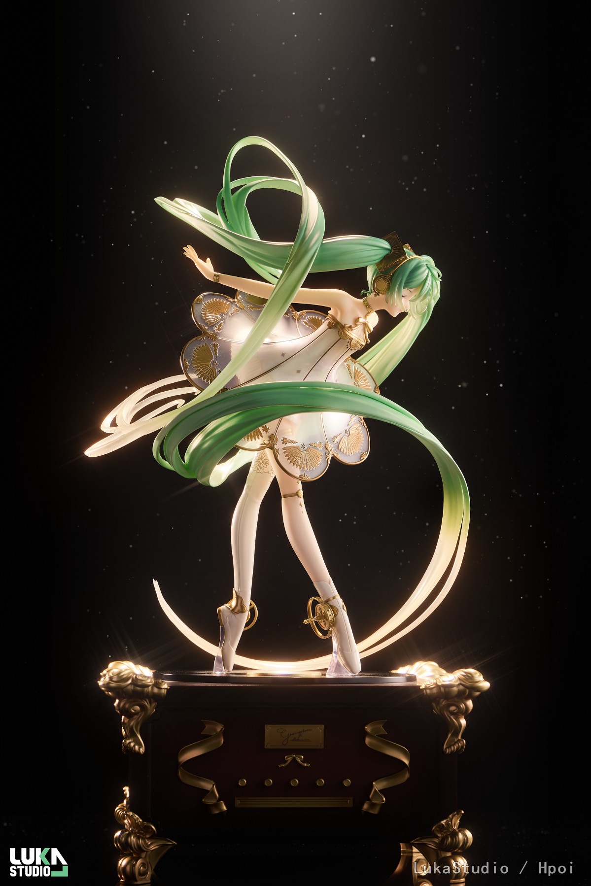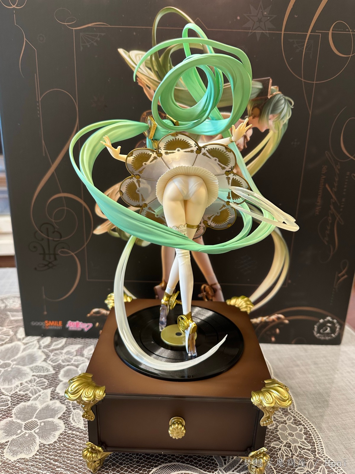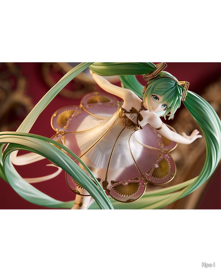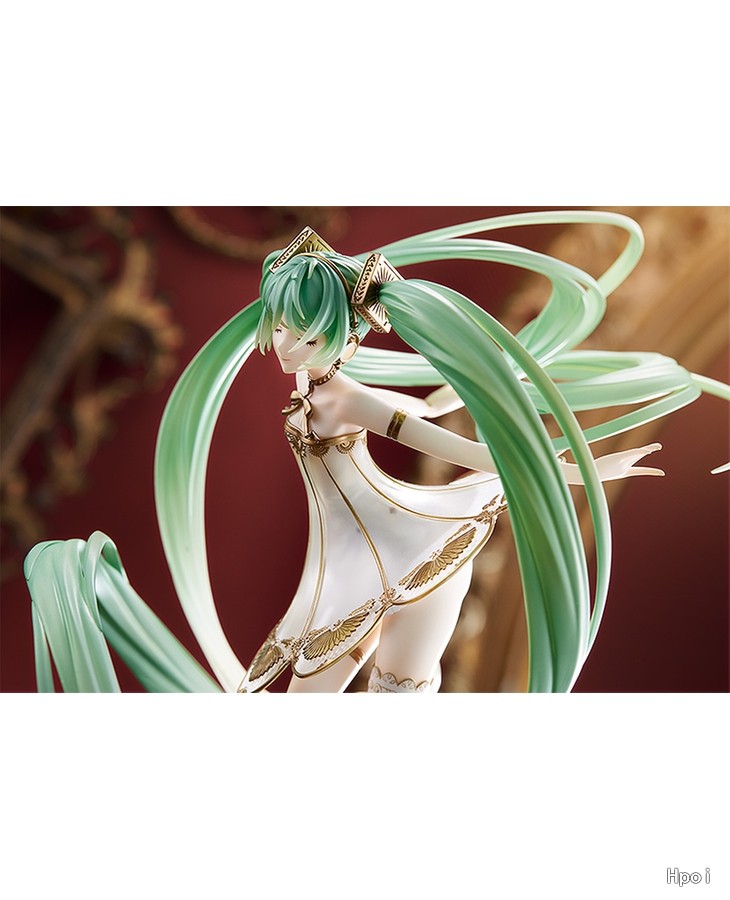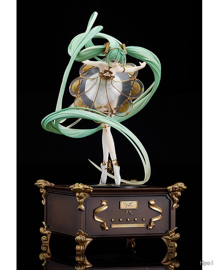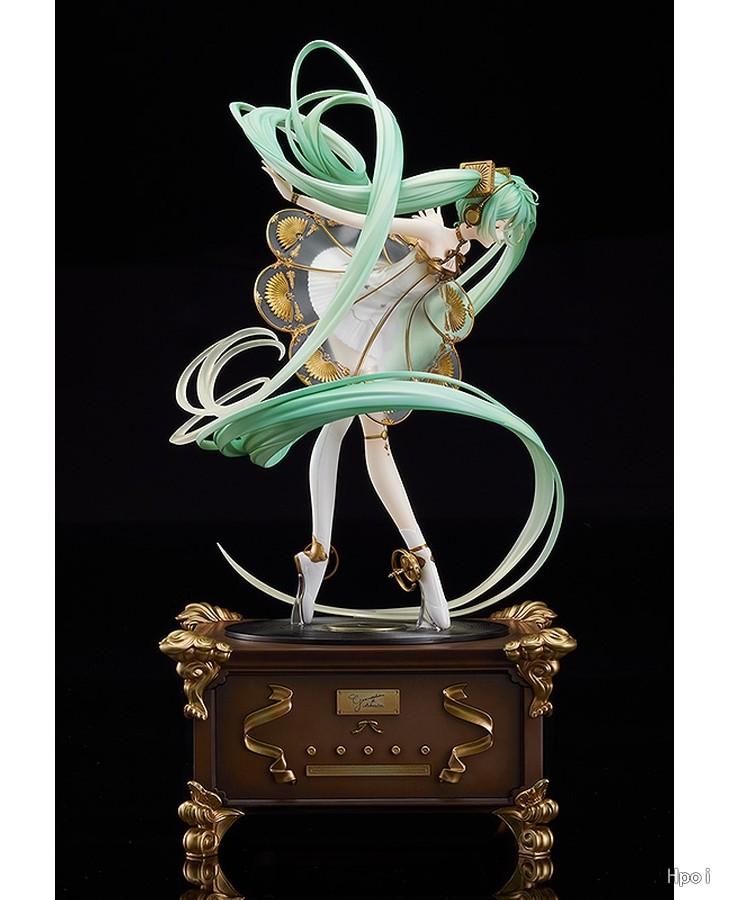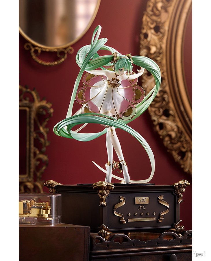 出自《Character Vocal系列01初音未来》,「初音未来」以交响音乐会「初音未来交响乐2020〜5th Anniversary〜」的主视觉造型化身为比例模型!将绘师Rella所绘制梦幻美丽的视觉图,保持原有形象制成模型。以留声机为构想的礼服采用透明零件,以及施加珍珠与金色涂装细致表现。为附表情零件「闭眼脸」与温柔微笑「笑脸」的豪华样式。细致的头发流动与手脚姿态等,充满魅力的造型是一大看点。台座部分为抽屉式可收纳小物,所以能收起内附的八音盒。快来把初音未来交响乐特别的比例模型带回家吧!