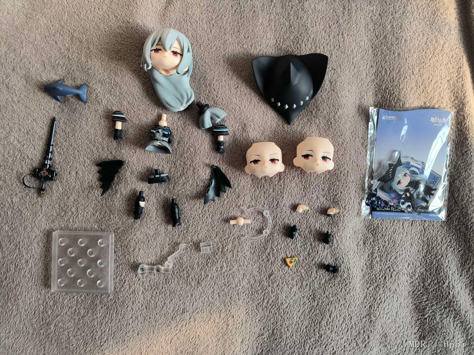 出自超人气手机游戏《明日方舟》,赏金猎人「斯卡蒂」化身为黏土人登场!替换用表情零件有「普通脸」、余裕的「战斗脸」,以及享受美食的「期待脸」三种。配件有武器「源石剑」、绝招「涌潮悲歌」的特效片、斯卡蒂喜欢的「比萨」与「虎鲸」,以及可自由脱戴的「帽子」,能赏玩重现各种场景!将神秘的「斯卡蒂」带回家吧。