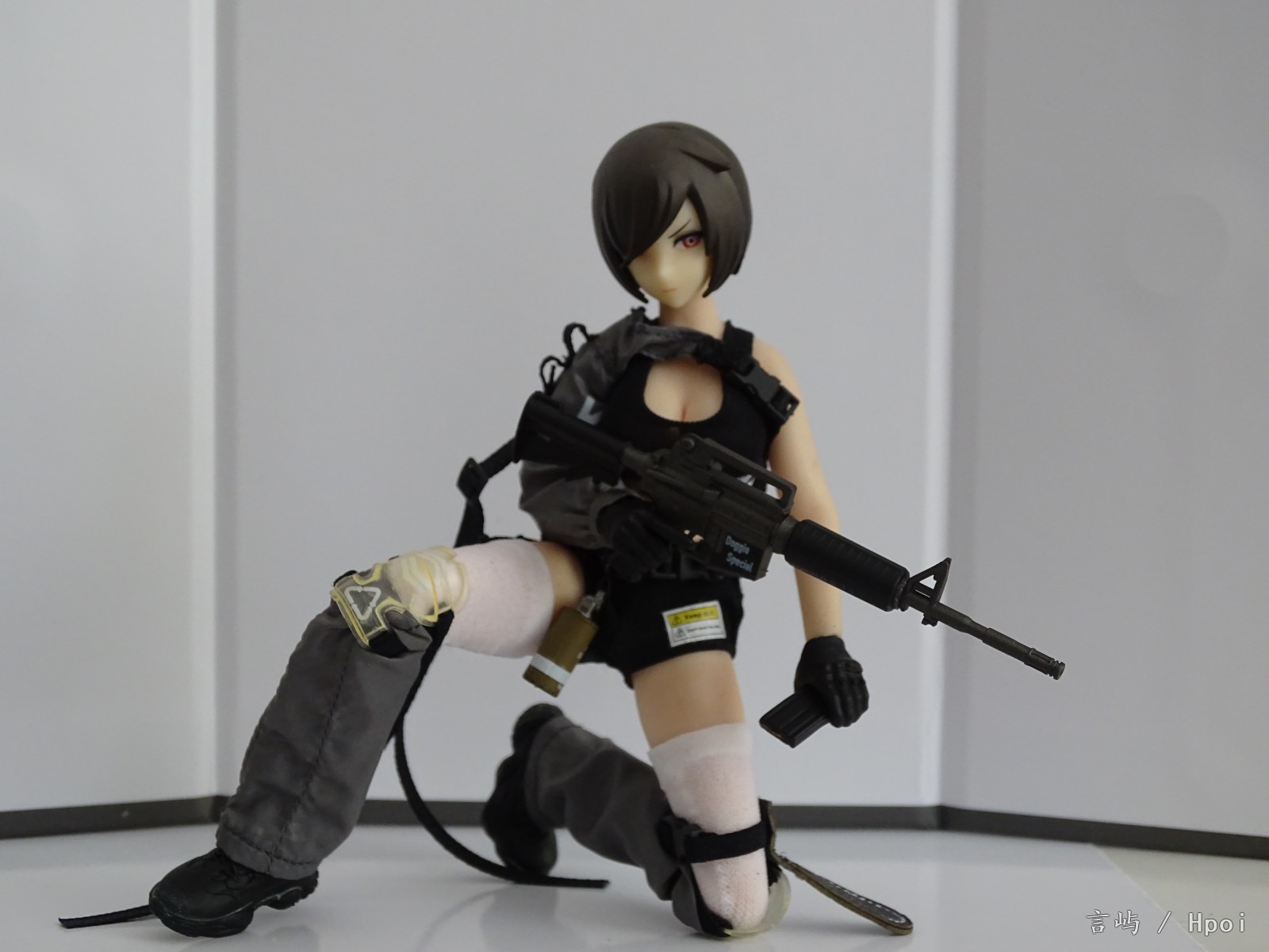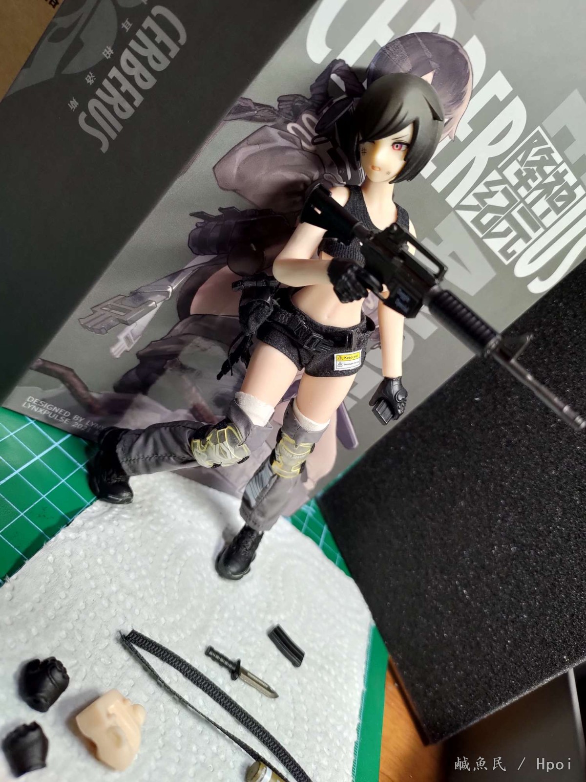 配置清单:头雕*1二次元包胶可动素体*1可替换表情脸*3可替换手型*6站立鞋子*2蹲姿鞋子*2黑色弹力背心*1黑色短裤*1白色长袜*2透明战术披风*1战术护膝*2腿套*2袖套*1腰包*1TSSⅡ型“猎踪犬”战术头盔*1M4步槍*1M4步槍弹匣弹匣*1弹匣快拔套*1匕首*1皮质匕首套*1烟雾弹*1防弹插板*3