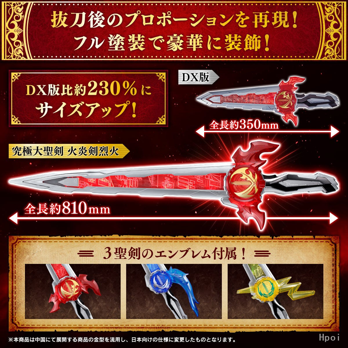 究极大圣剑 火炎剑烈火…H約810mm×W約215mm×D約70mm水势剑流水徽章…H約240mm×W約155mm×D約40mm雷鸣剑黄雷徽章…H約180mm×W約285mm×D約40mm