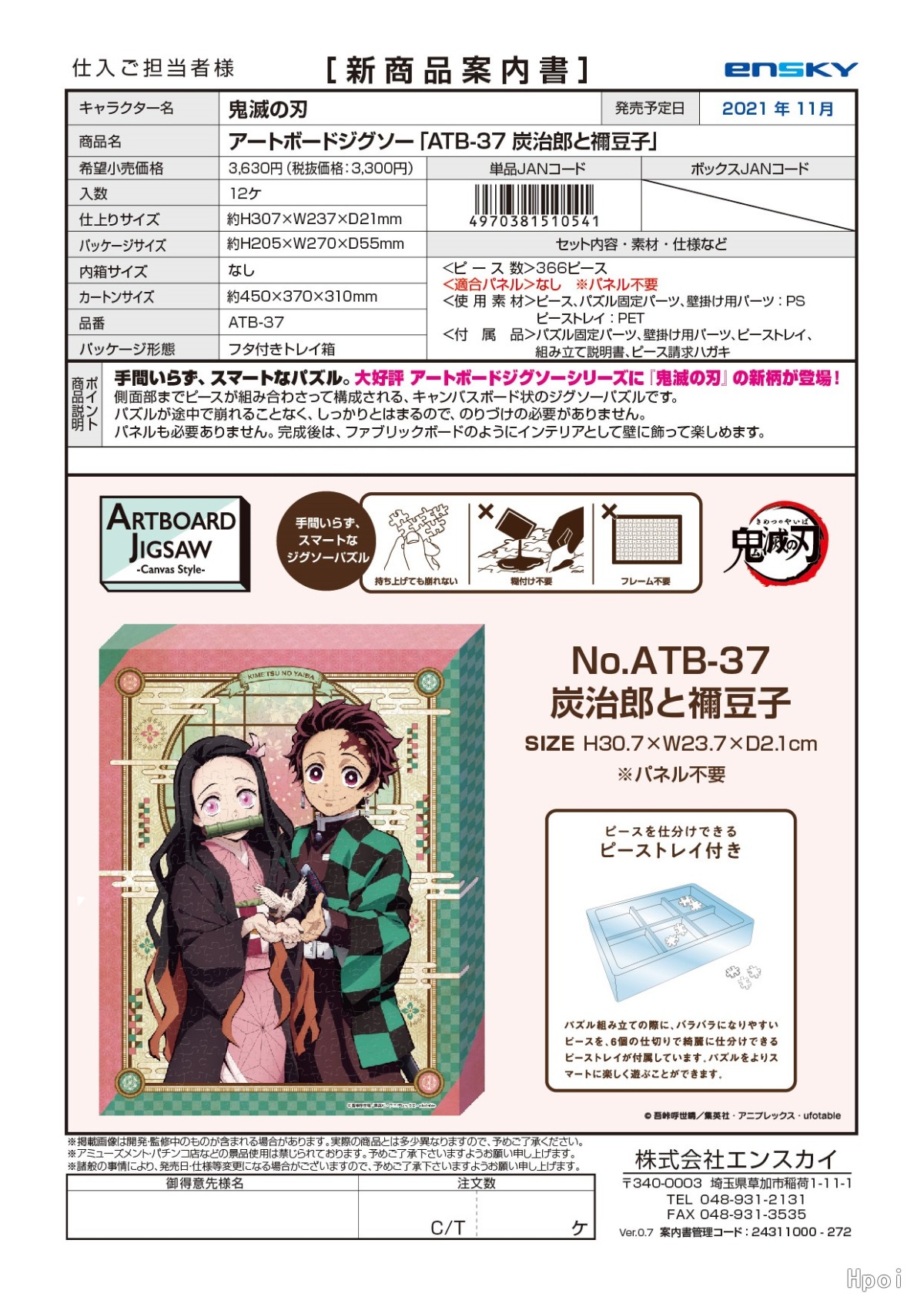 ジグソーパズル アートボードジグソー 鬼滅の刃 炭治郎と禰豆子 366ピース (ATB-37)