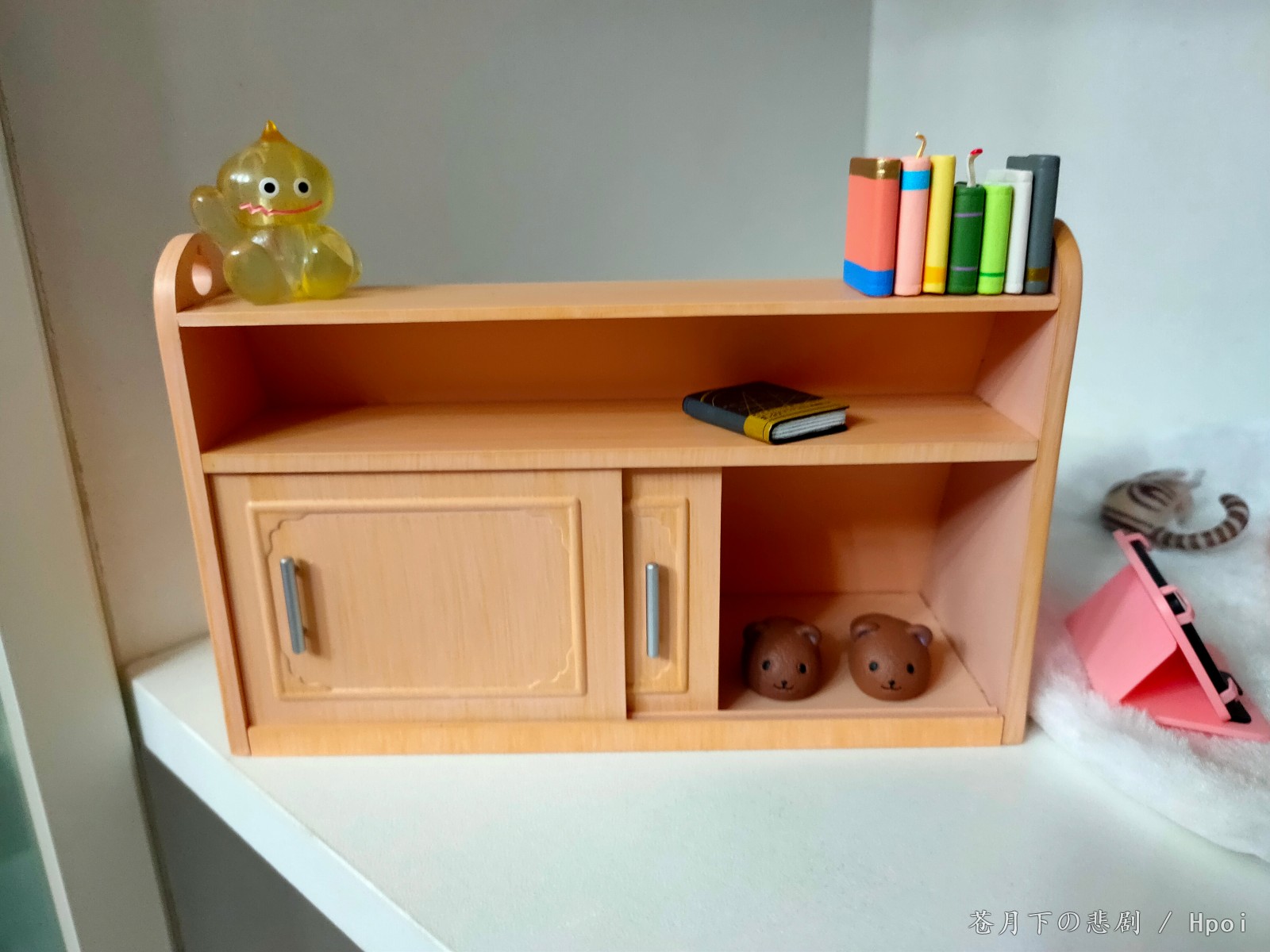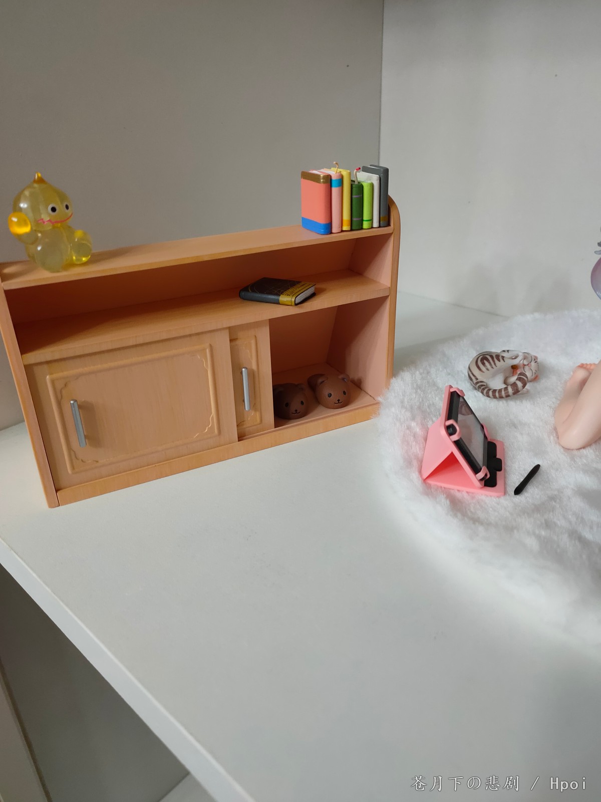 配置:少女角色*1,柜子*1,宠物猫*1,书籍,史莱姆摆件,游戏机*1,(地毯*1)