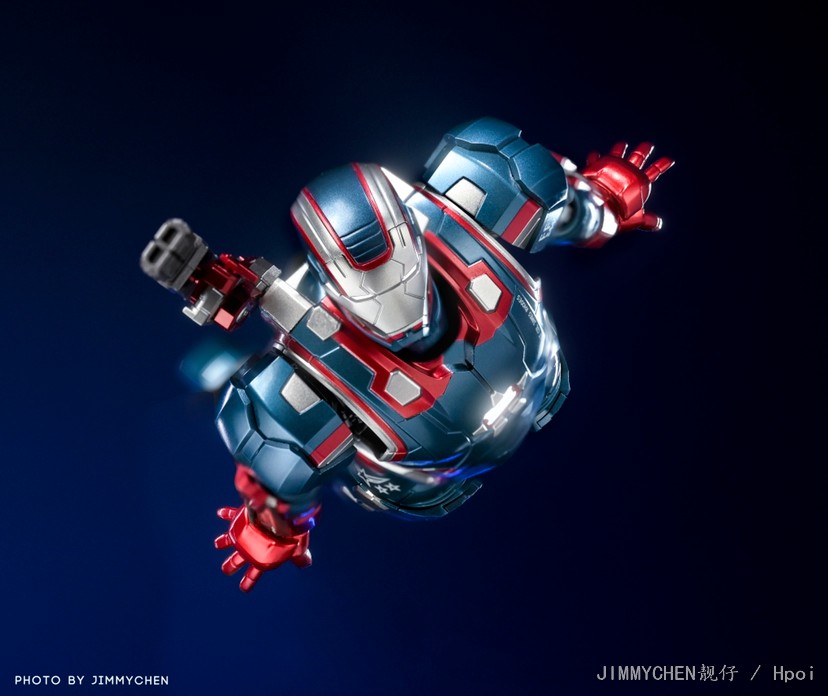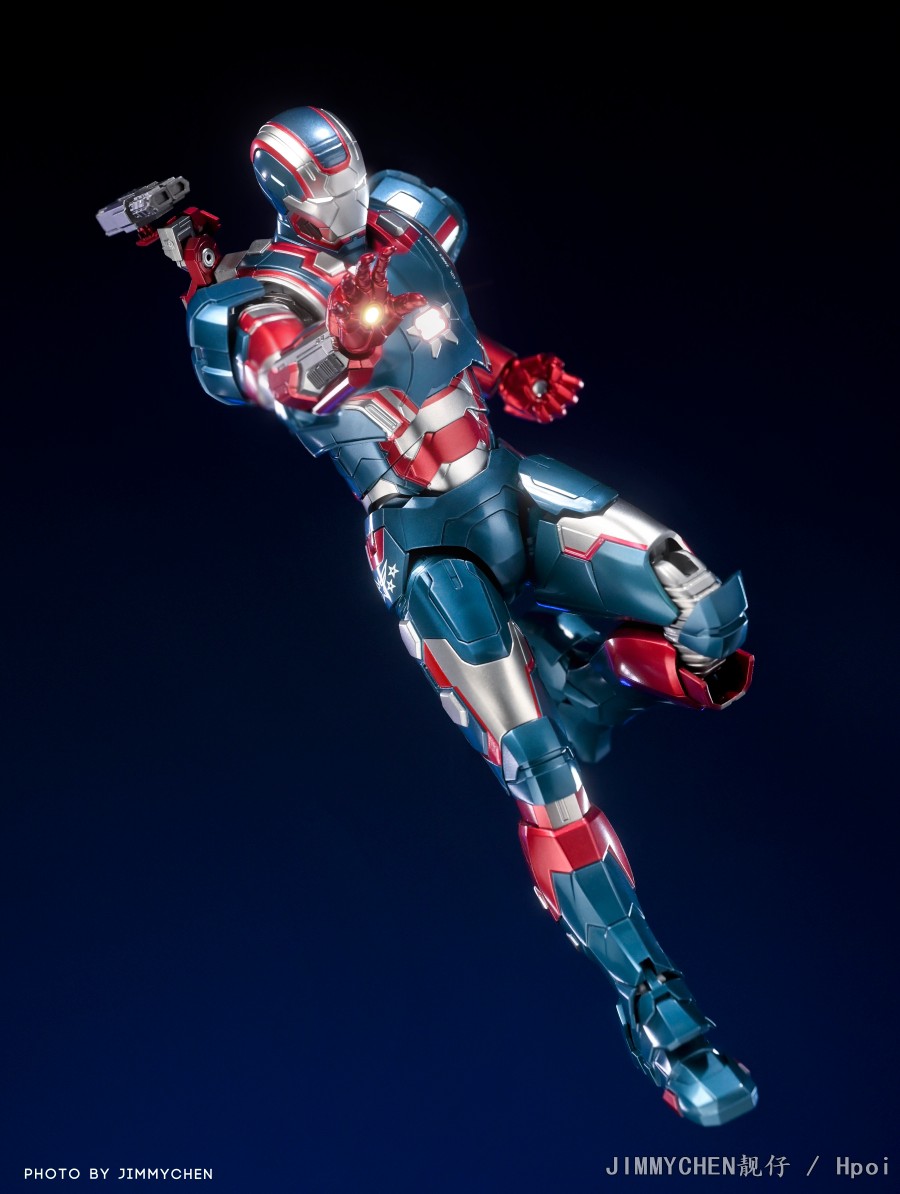 DLX钢铁爱国者可动素体身高约6.9英寸高 (约17.5厘米),拥有48个可动关节,内藏合金骨架。经典的蓝色和红色盔甲设计装上配件后栩栩如生,背挂式加农炮可旋转以做出不同的过肩姿势。此外,微型加农炮可固定在双前臂上,脚上则可装上飞行效果摆出飞行中的姿势。DLX钢铁爱国者的胸部和眼睛具有照明功能,套装还包括多对可互换的手和一个 DLX 动作支架。