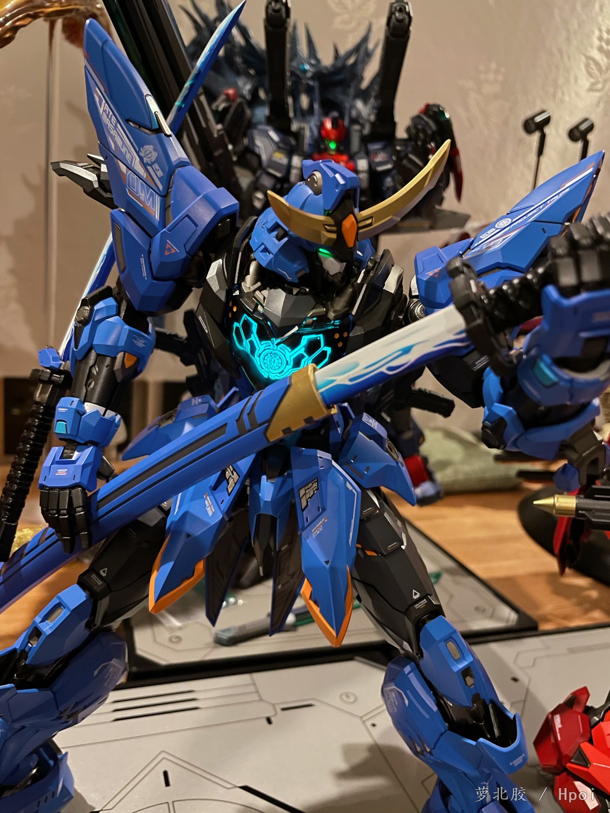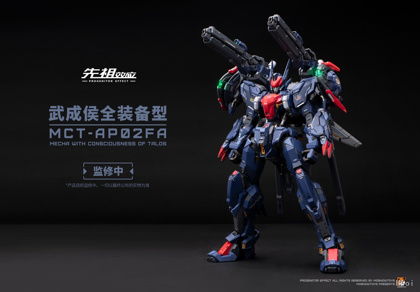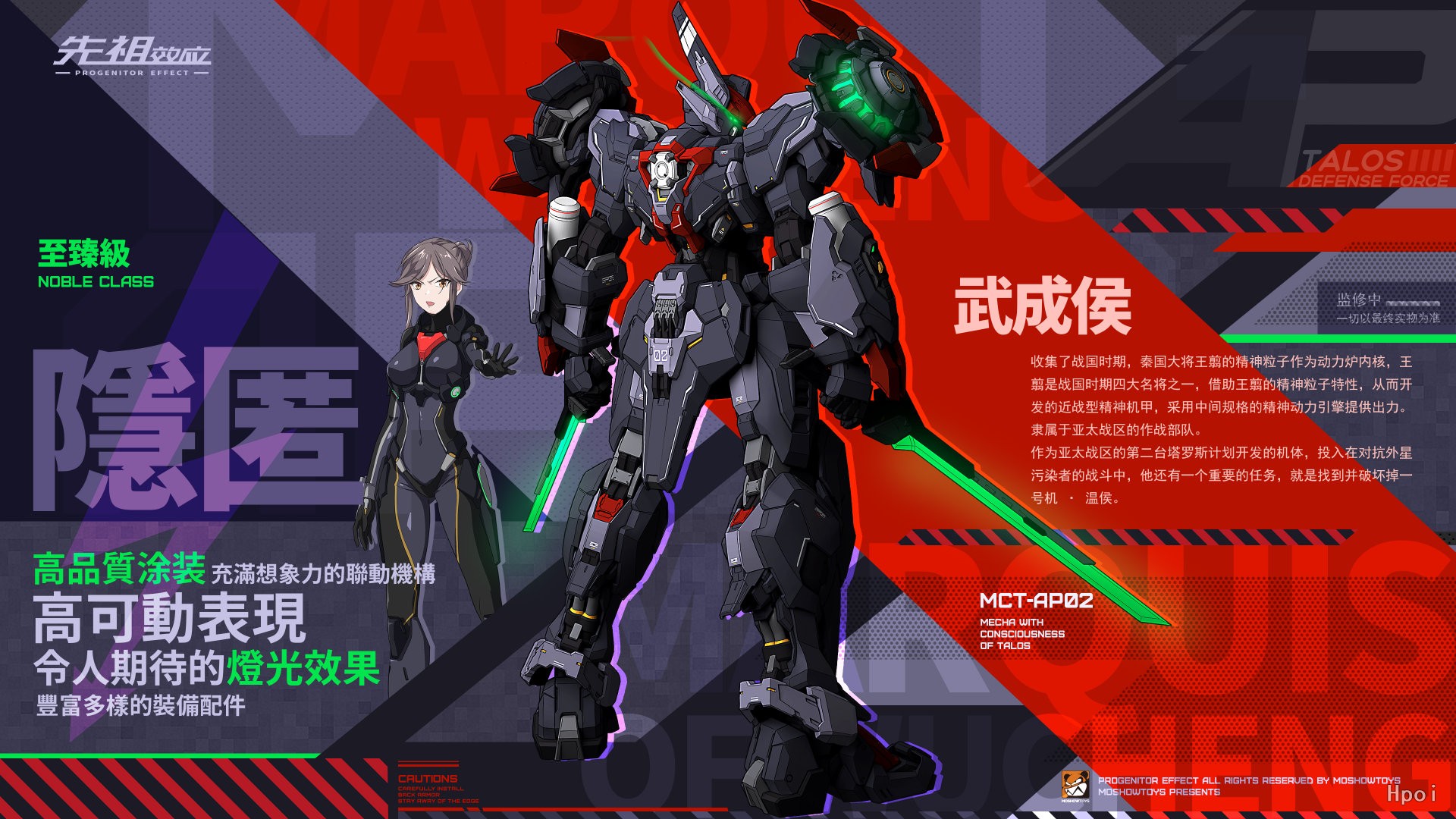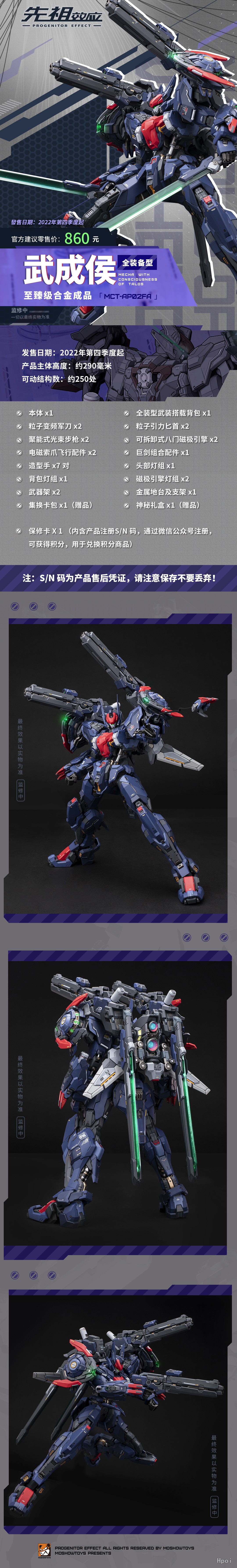至臻级·武成侯全装备型秉持了至臻级高超的工艺涂装水准,首次为机甲配备了飞行背包作为装备扩充,可搭载两把对[粒子变频军刀]以及[聚能式光束步枪],通过背包链接件增加了武器可动范围,将武器搭载到机甲肩膀上更具进攻性与可玩性!除了头部的发光灯组,机甲肩膀处的磁极引擎内部也配备了发光灯组,拥有多种发光模式可随意切换。本体+背包可动结构数约250处,最大限度的增加了产品的可动性与可动范围,一定会给广大玩家带来更加优秀的把玩体验和惊喜!
