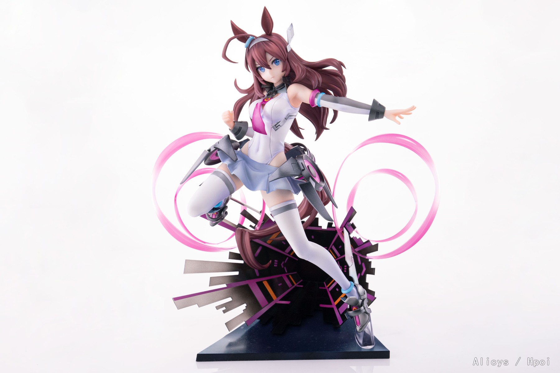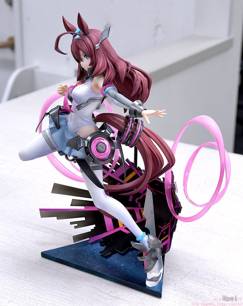 出自遊戲《賽馬娘Pretty Derby》,「美浦波旁」化身為1/7比例模型。以原創動作來表現身穿[MB-19890425]決勝服施展固有技能的形象,並製成模型。為重現科幻風格決勝服的獨特材質,而施加精確且細緻的漸層塗裝,淋漓盡致地呈現出人稱“改造人”的精緻體態,觀賞者能以各種角度鑑賞。另外,凸顯她機械風格裝備的彈射器形象台座,還有背後的特效零件皆採用透明材料製作。將看似面無表情卻心懷炙熱意志而持續奔馳的「美浦波旁」帶回家吧。