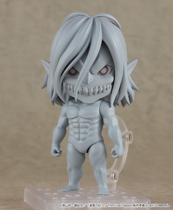 出自電視動畫《進擊的巨人》,主角「艾連‧葉卡」以九大巨人之一的「進擊的巨人」姿態化身為黏土人登場!替換用表情零件有「普通臉」與「戰鬥臉」兩種。特色的巨人身體也細緻重現,可還原劇中印象深刻的場景。配件有能和巨人擺飾的「建築物」、小型的「萊納」,以及能賞玩硬質化狀態的「硬質化手臂零件」。雖然是巨人但是小巧可愛?將他帶回家以黏土人享受《進擊的巨人》的世界吧。