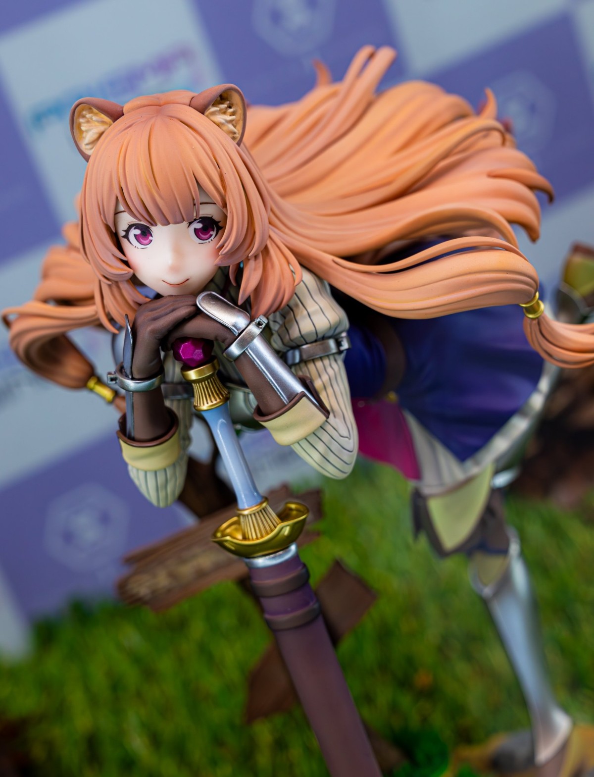 忽闪忽闪的大眼睛远望前方,浣熊种特有的毛茸茸的耳朵,一头随风散开的褐色秀发也如原作中一样。精心的涂装和造型将细腻白皙的肌肤和蓬松的毛发完美呈现。服饰上的褶皱,以及保护四肢的护具也制作得非常有质感。用于支撑身体的魔法剑也同样被高细节的完成。