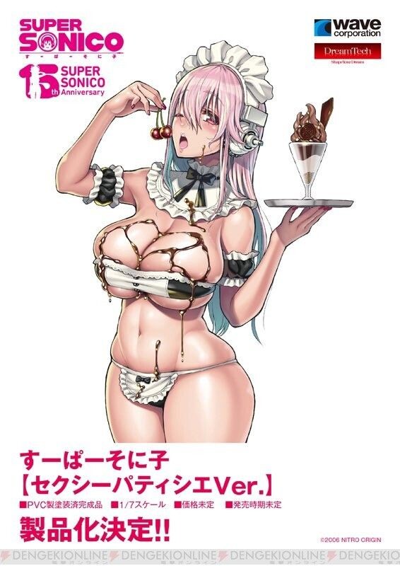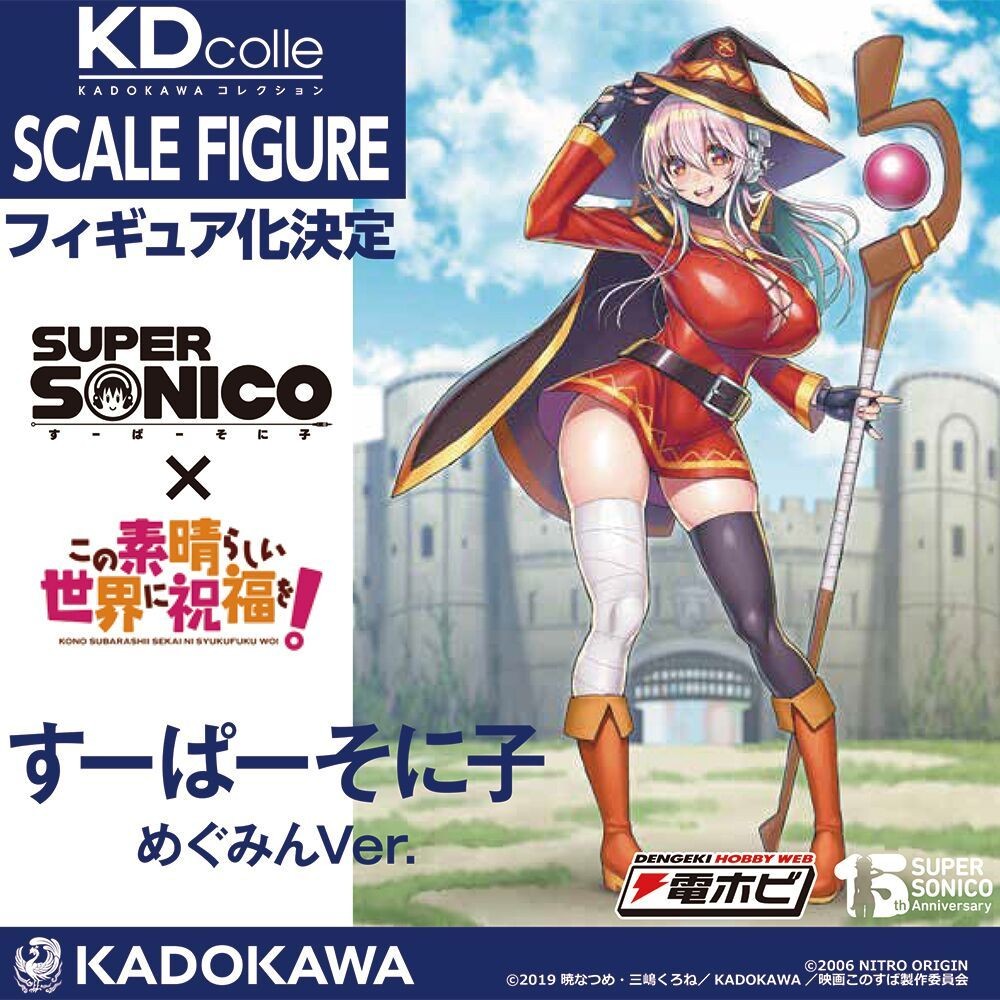 Nitroplus的演唱會吉祥物女孩「超級索尼子」與動畫《為美好的世界獻上祝福!》聯名合作!超級索尼子身穿惠惠的服裝,化身為1/7比例模型登場。本次以津路參汰老師特別繪製的插畫為主題製成模型。衣服幾乎要被撐破的姿態,呈現出曼妙身材的豐腴肉感,讓模型索尼子的魅力大大升級。帽子可自由拆卸。另附替換用表情零件與胸部零件,可重現她因衣襟敞開而慌張的情境。能賞玩索尼子擺出可愛姿勢的模樣,或冒冒失失的一面。