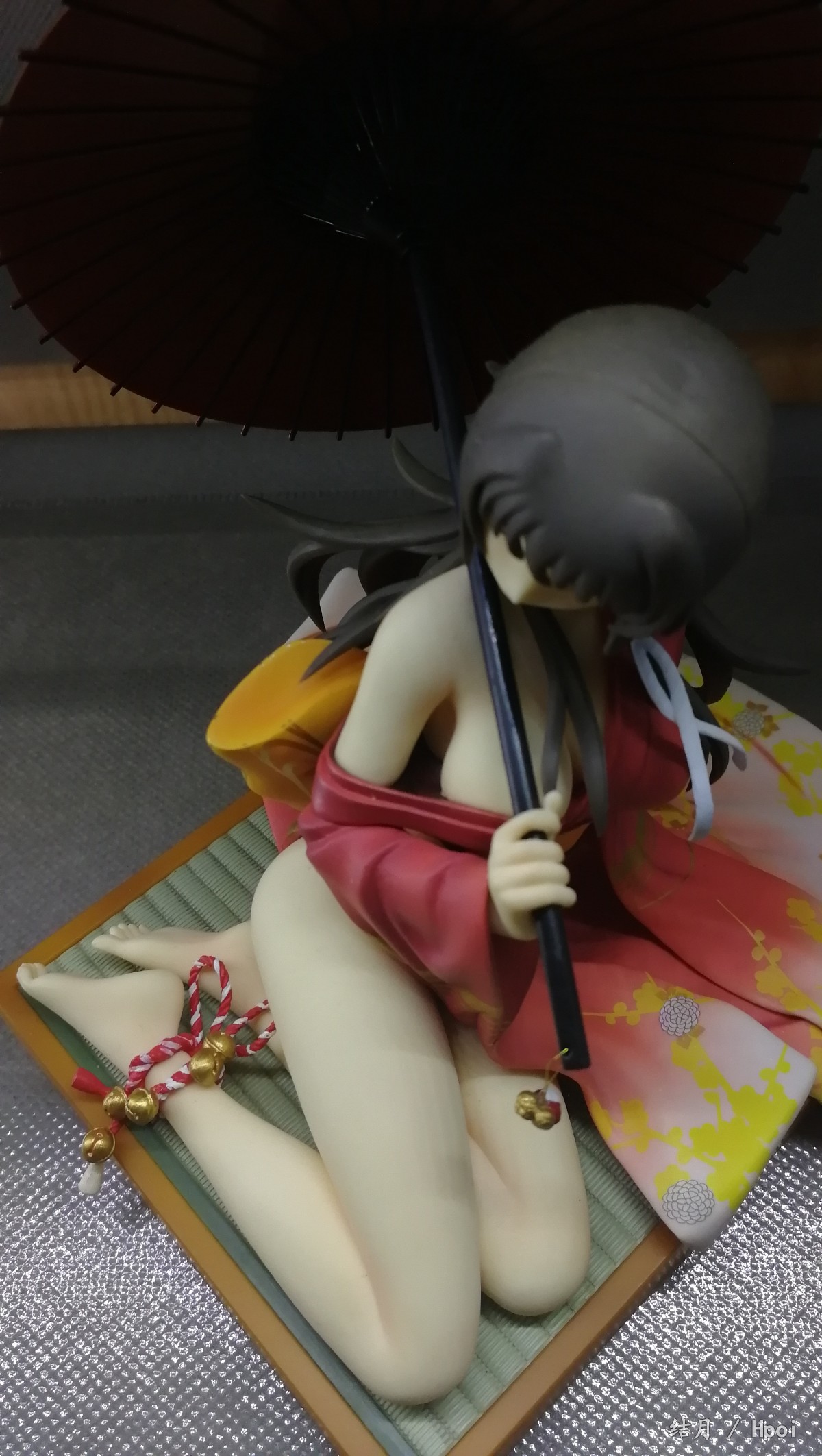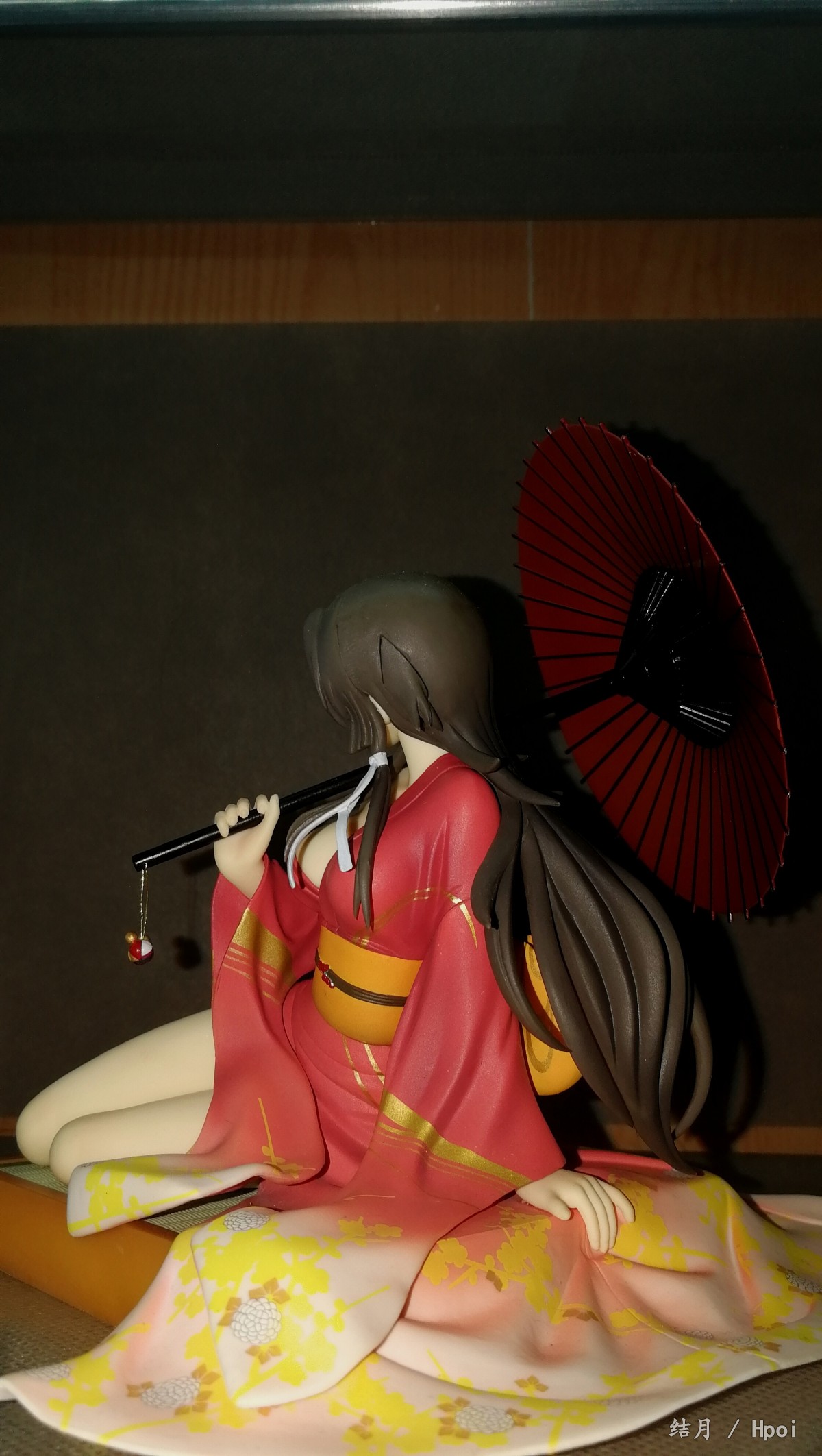 足首に捲かれた飾り紐や和の風情漂う傘などの小物も細部まで制作。