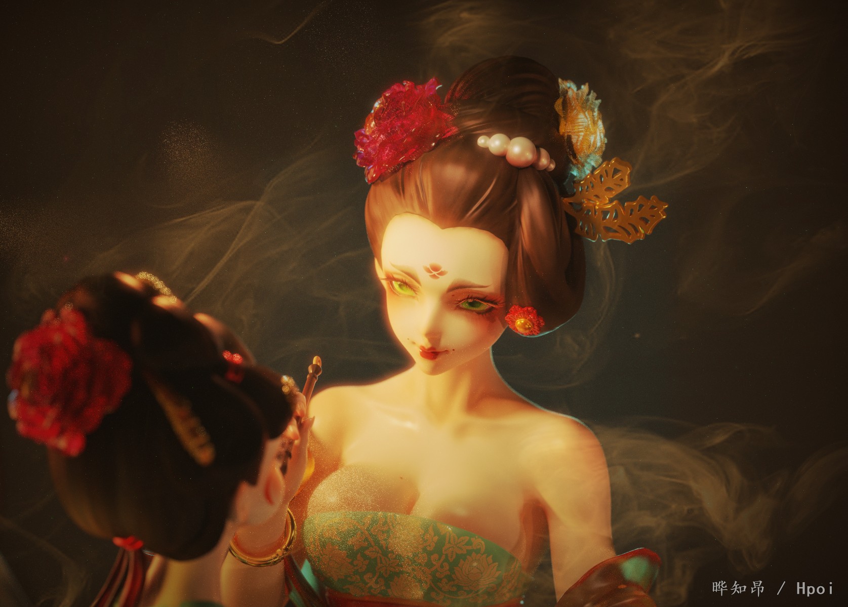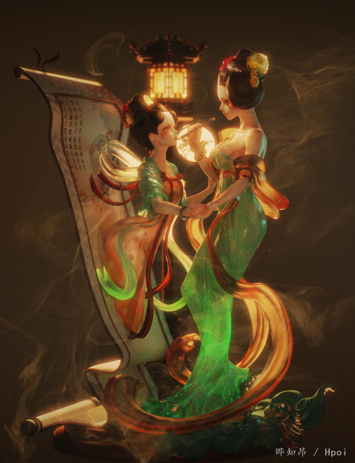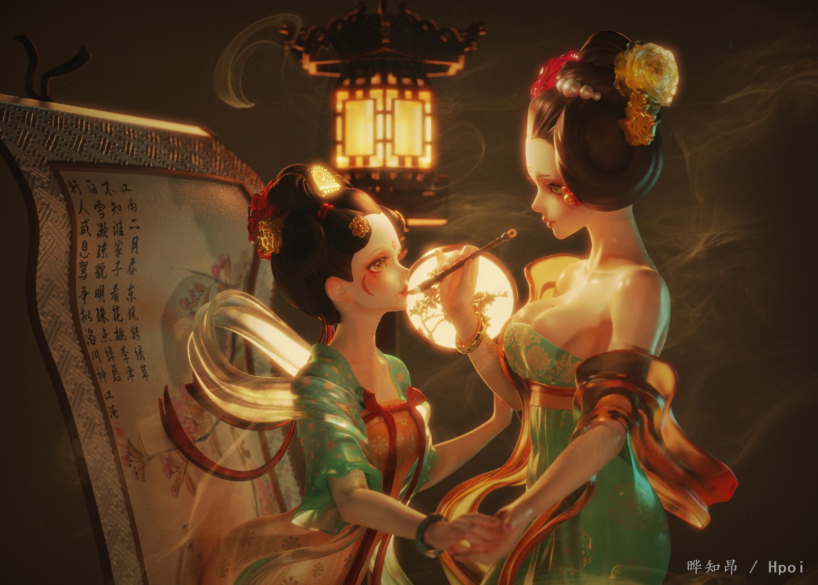 本作品名为《点绛唇》,唐妆女子深夜灯下执笔,想要为画中女孩点唇,不料一阵青烟之中,女孩自画中飘出,笔正点在唐装小女孩的嘴唇之上。小女孩一脸诧异,樱唇微张。而唐妆女子面带微笑,像是故意将画中小女孩拉出来一般。能保证完成品与草图描画一致,望通过,万分感谢!