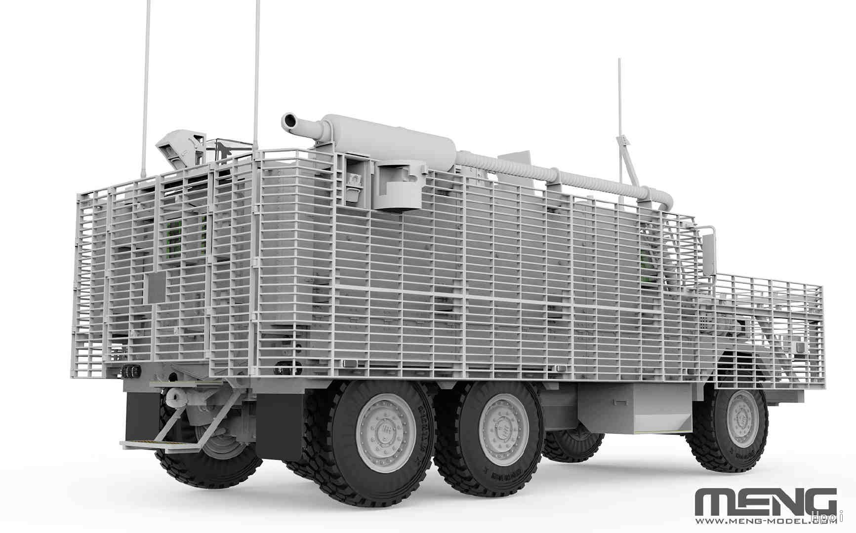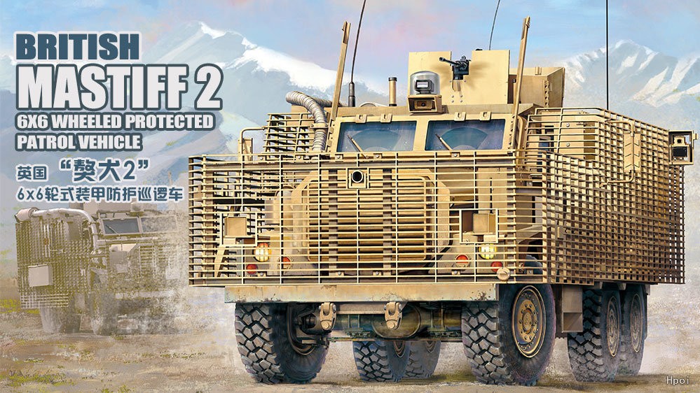 MENG推出的1/35比例英国“獒犬2”6x6轮式装甲防护巡逻车,模型完成后全长233毫米,宽114毫米。套件包含两种涂装方案。
