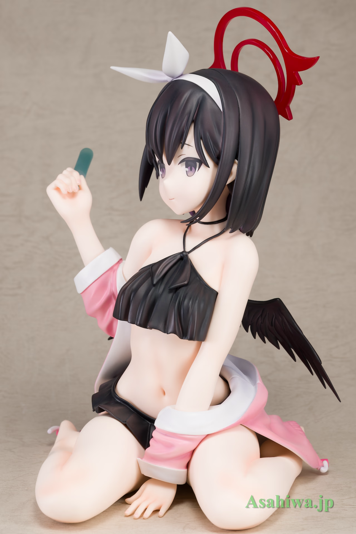 出自《蔚藍檔案 Blue Archive》,三一綜合學園正義實現委員會的真白化身為1/4比例模型登場!服裝以作品中活動「夏空的心願清單」的超人氣泳裝造型製成模型。單手拿著冰棒向老師(玩家)搭話,截取記憶深刻回憶大廳的一景。頭上的光環、背後的翅膀,以及可愛粉紅色的連帽上衣也依照設定重現。將她迎接至老師的身邊吧。