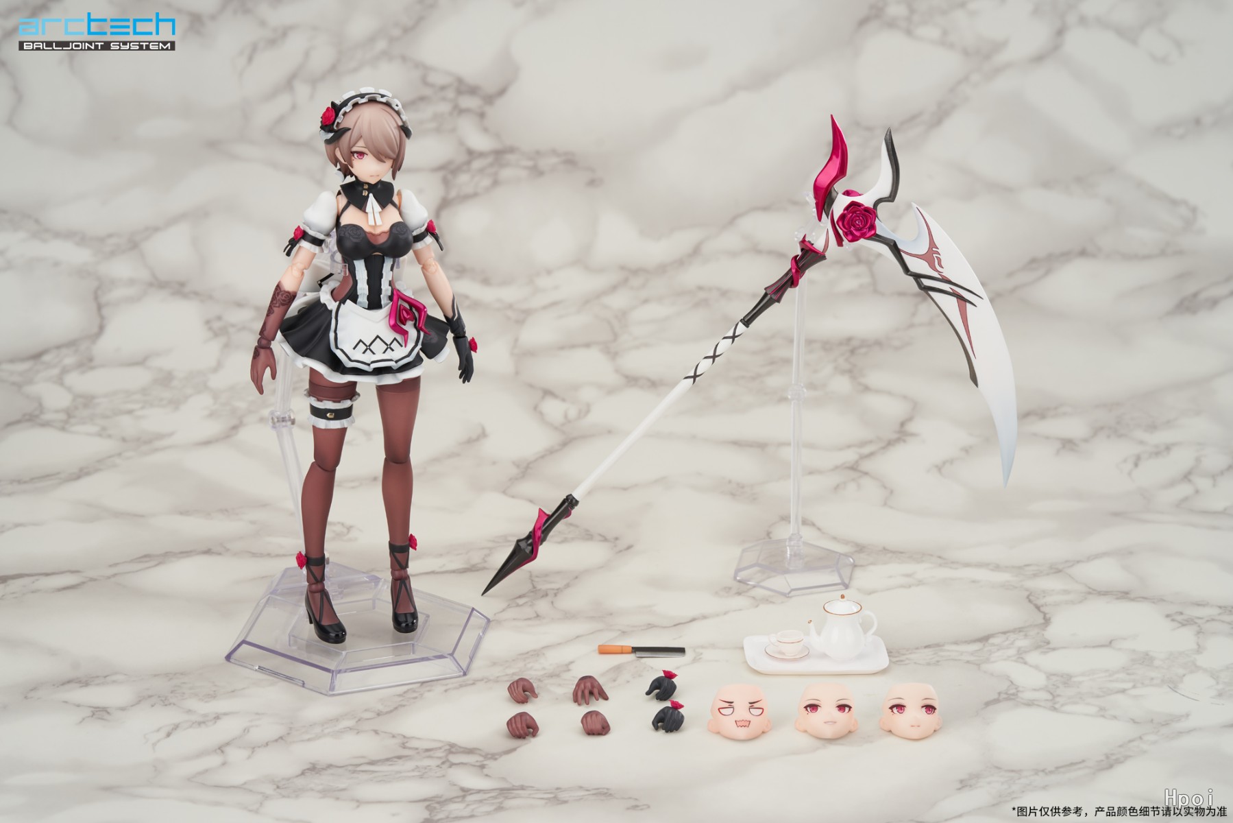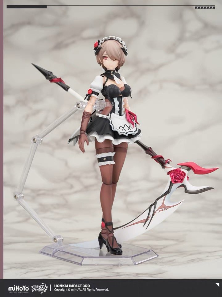 【丽塔·黯蔷薇】全身共17处可动关节,3种替换脸型,8只替换手型。除此之外特别提供有武器「阿芙洛狄忒」、可动地台支架以及【红茶套装】、【菜刀】等丰富配件。武器「阿芙洛狄忒」亦被细致还原,搭配专属手型可还原握持武器战斗姿态,亦可放置于专属武器支架以供观赏。