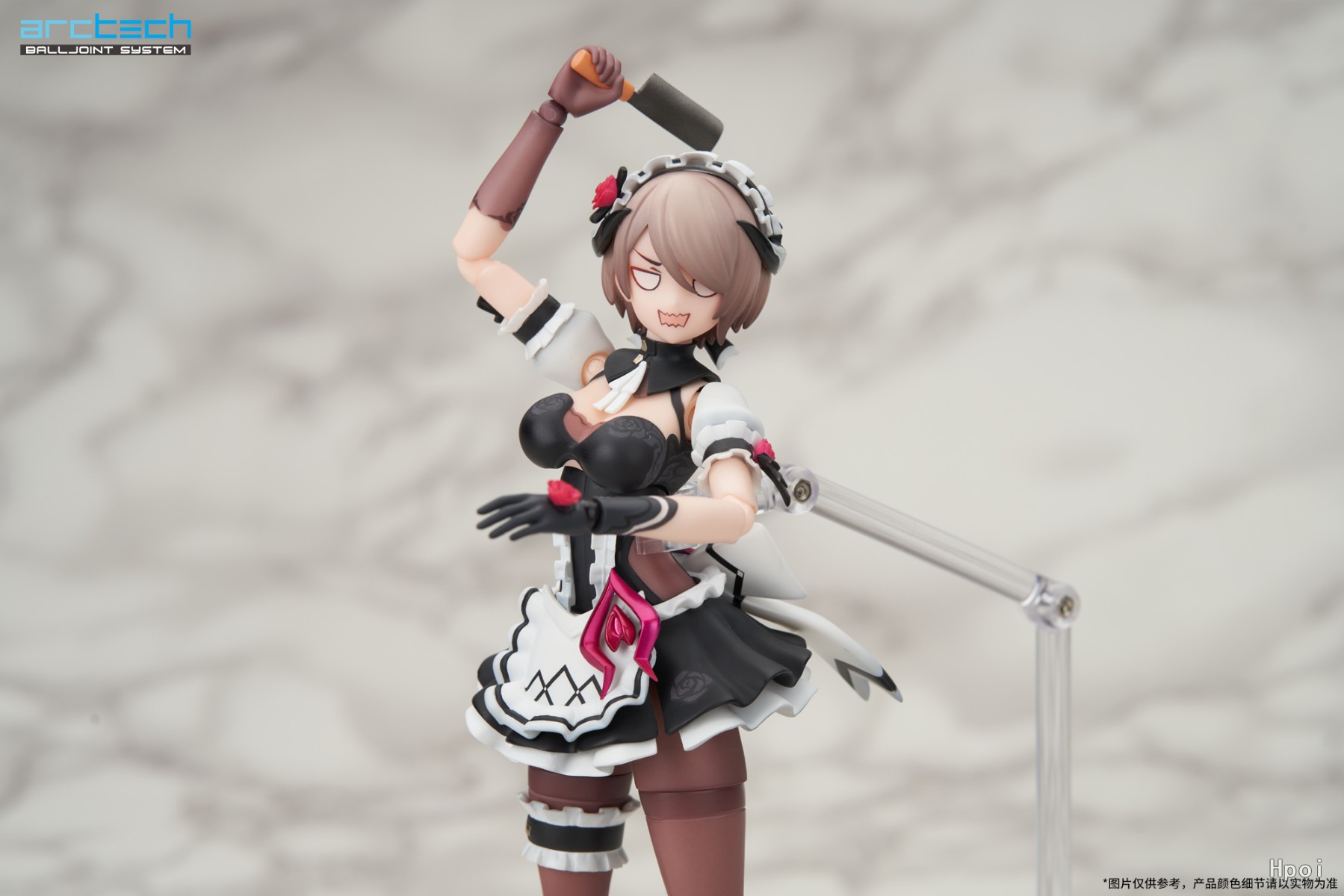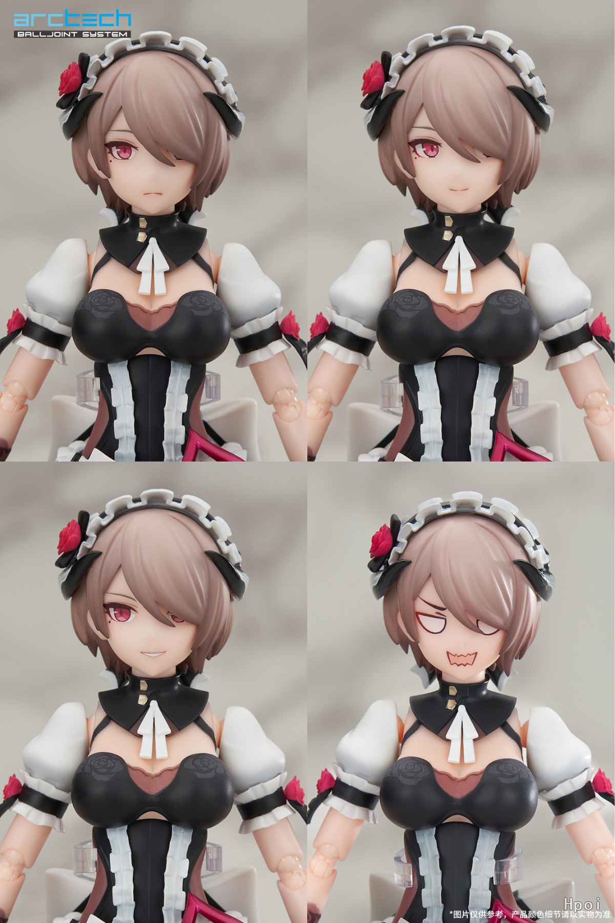 「丽塔·黯蔷薇」的造型及涂装细节延续ARCTECH系列一贯的高标准。优雅身姿,血色眼眸,手套上蕾丝纹样、蔷薇配饰皆精心还原,玫红色零件采用特殊涂装工艺呈现炫目金属质感。双层裙摆采用软质材料,腿部均加入平转关节,保持精美造型的同时便于还原出更多角色动态。