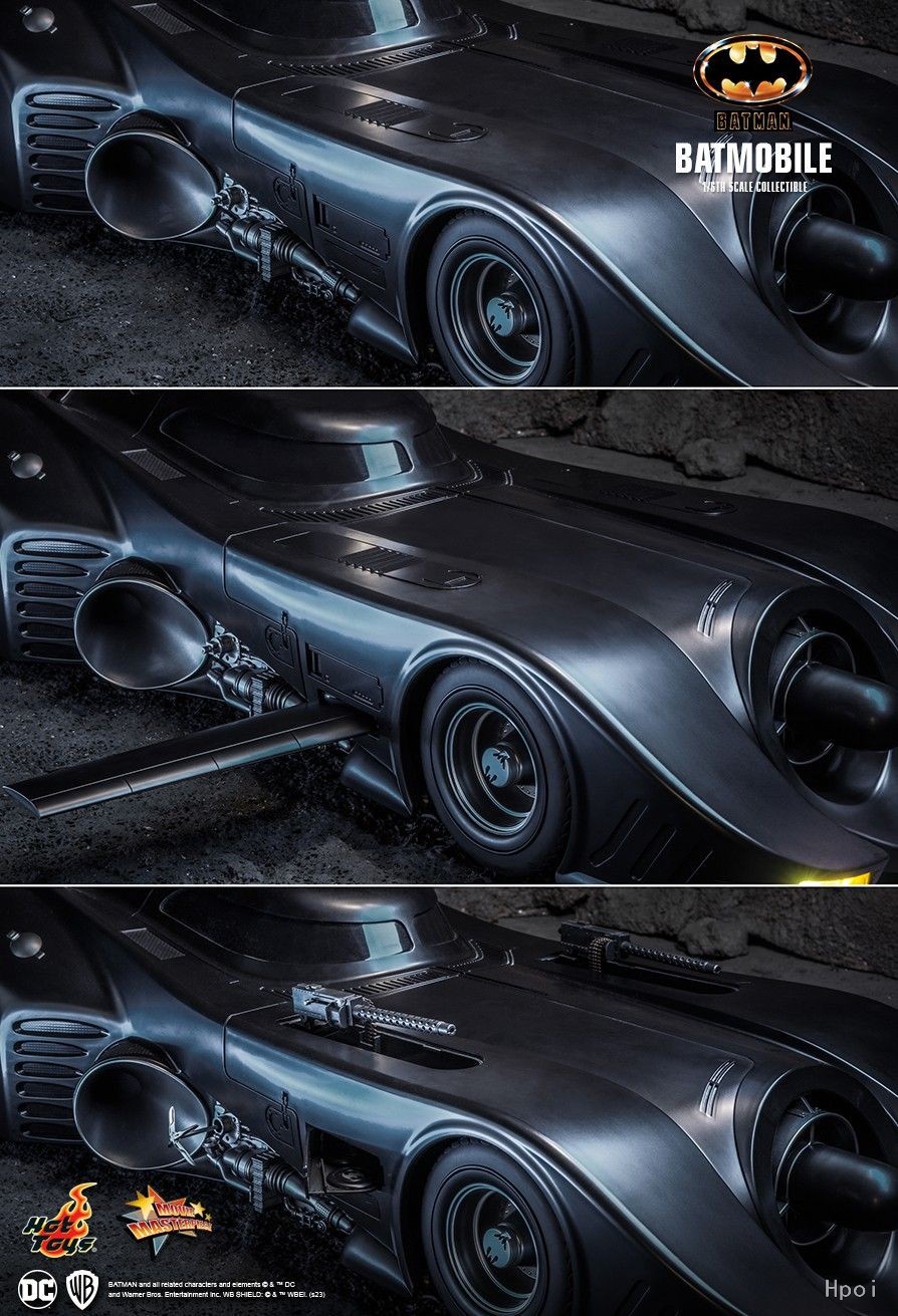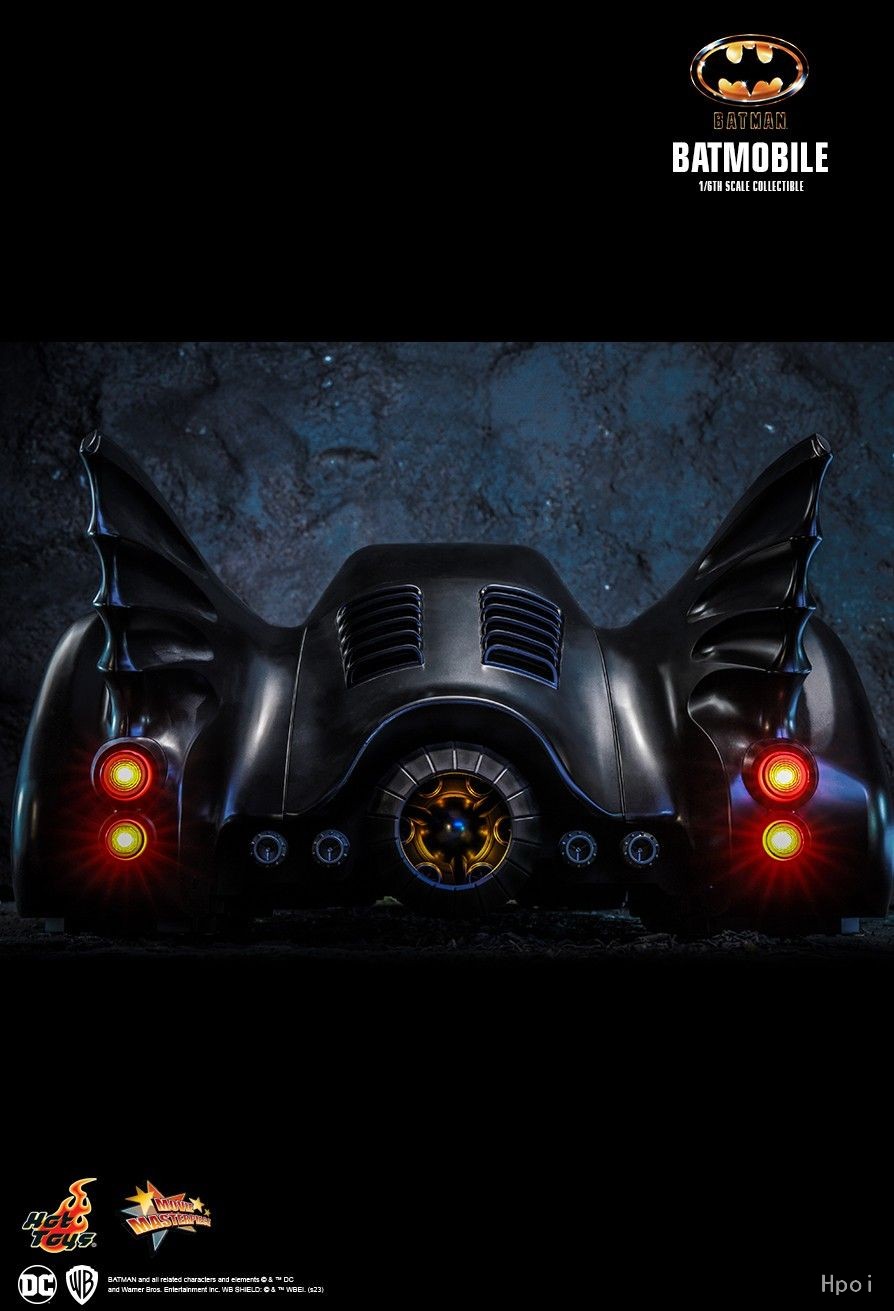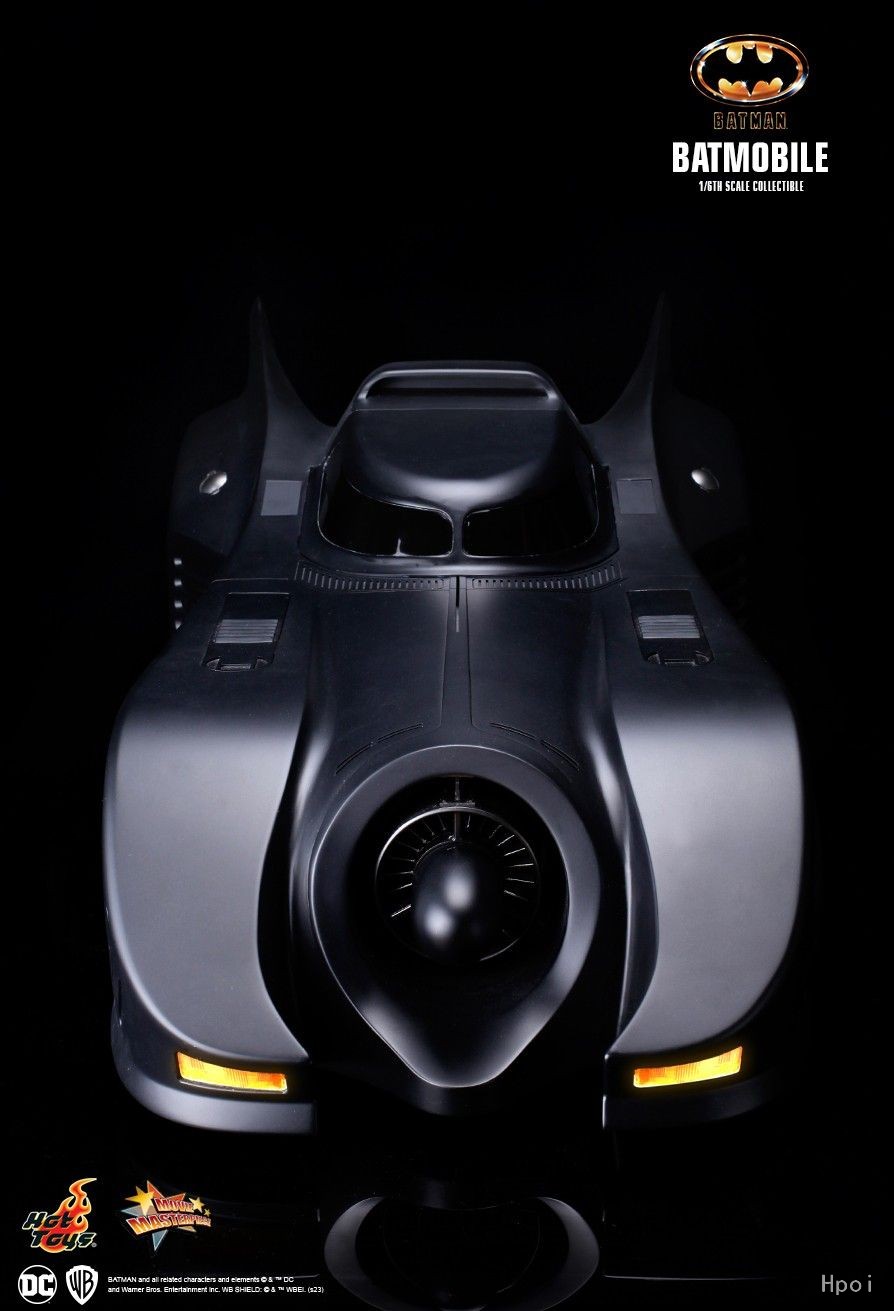 Hot Toys参考电影原作《蝙蝠侠(1989)》的外观设计,以高精确比例打造呈流线型的全黑色蝙蝠车!蝙蝠车高约25cm、宽40cm、长100cm,车头设有涡轮式入风口,车体后方搭配蝙蝠侧翼设计;而驾驶舱顶盖则为万众期待的滑动式设计,开启后可展示驾驶座位及仪表盘的精密细节!