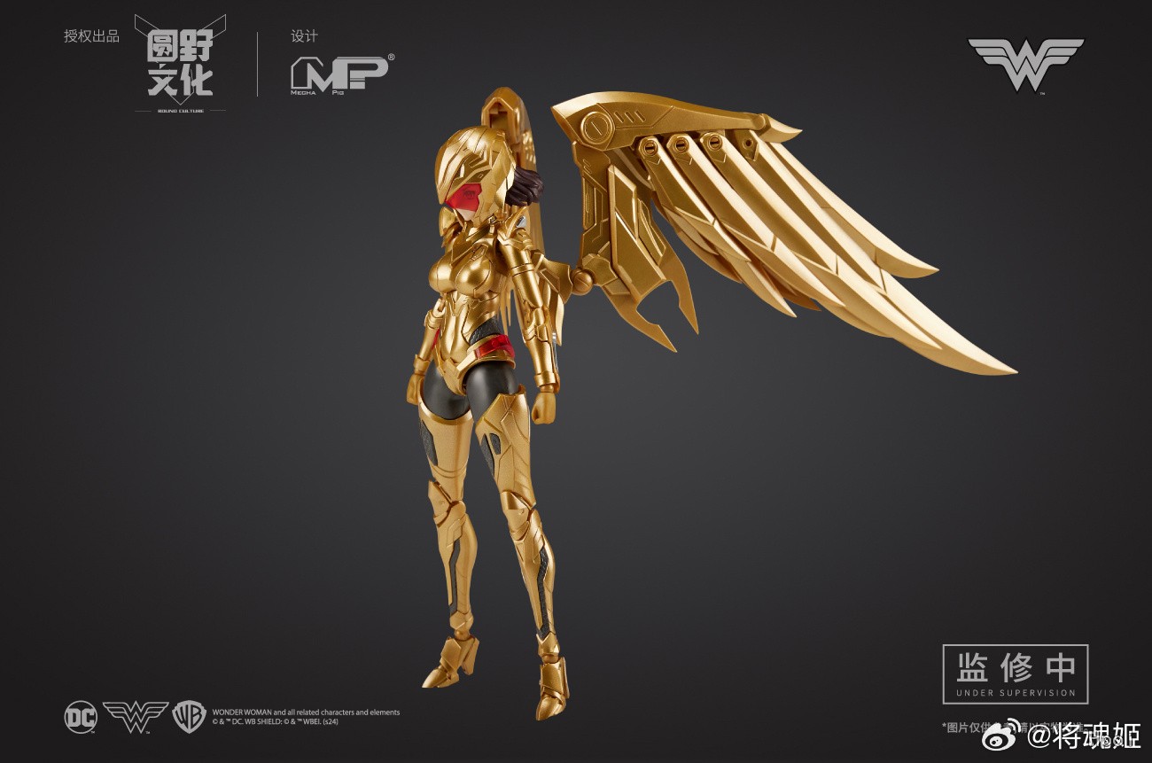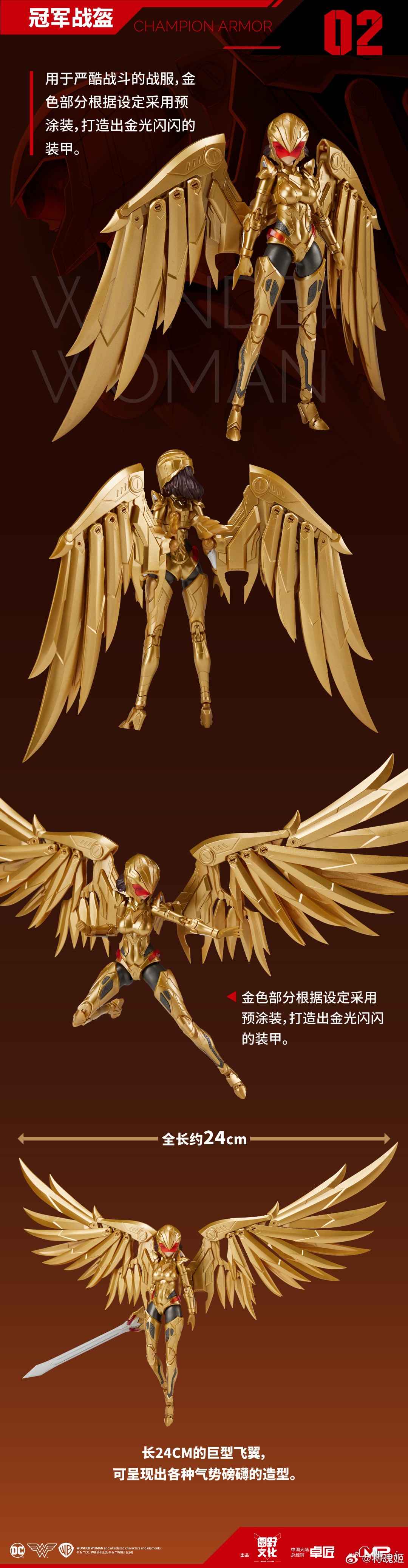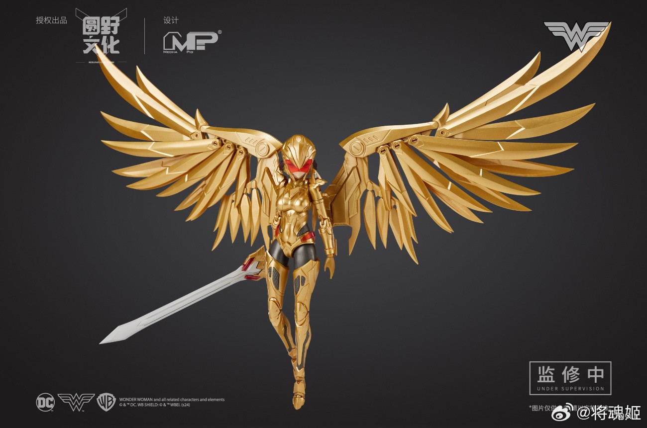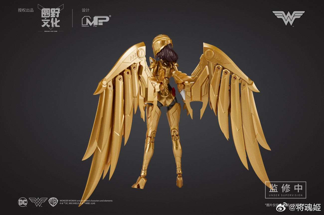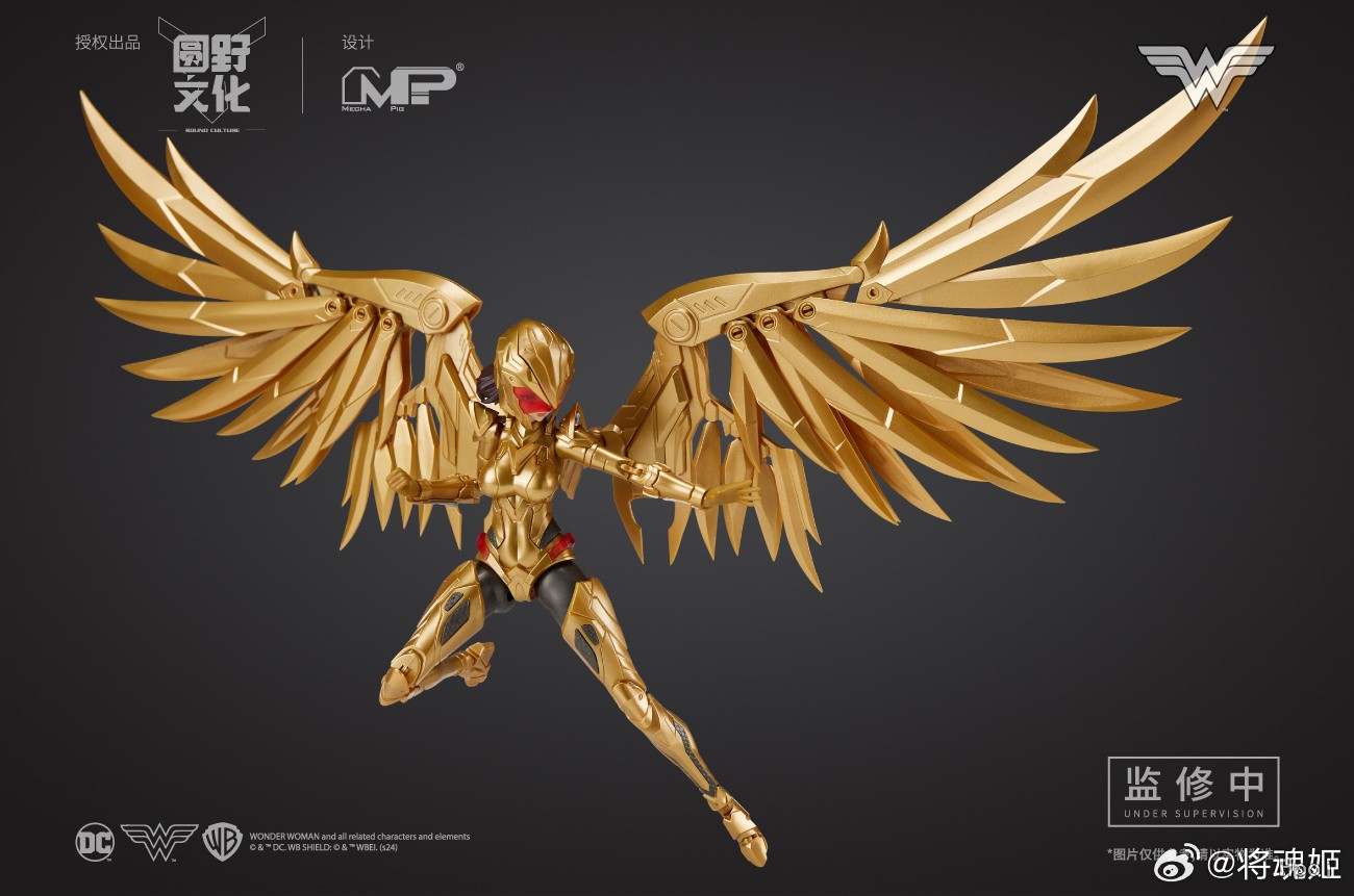 本款神奇女侠采用了经典战衣造型,在多处使用了预涂装工艺,以呈现细腻的金属质感。武器方面配备了剑与盾,标志性的真言套索也自有附赠。而更擅于战斗的金鹰战甲,金色部分根据设定采用预涂装,打造出金光闪闪的装甲