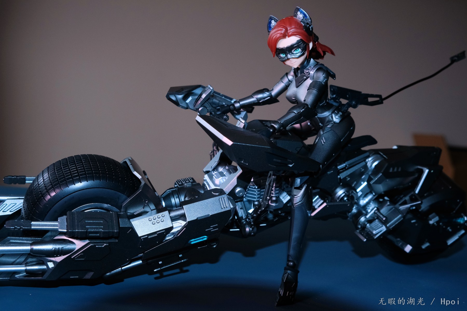 本款猫女采用了经典紧身衣造型,无论是褶皱处的细节,或是外甲上的涂装,都毫不马虎。附属的黑暗骑士蝙蝠摩托亦拥有细致刻画的机械结构,如转向系统的液压杆、可翻转的机载计算机、置中的引擎等;搭配骑乘用身体部件,可实现猫女骑乘黑暗骑士蝙蝠摩托的造型。