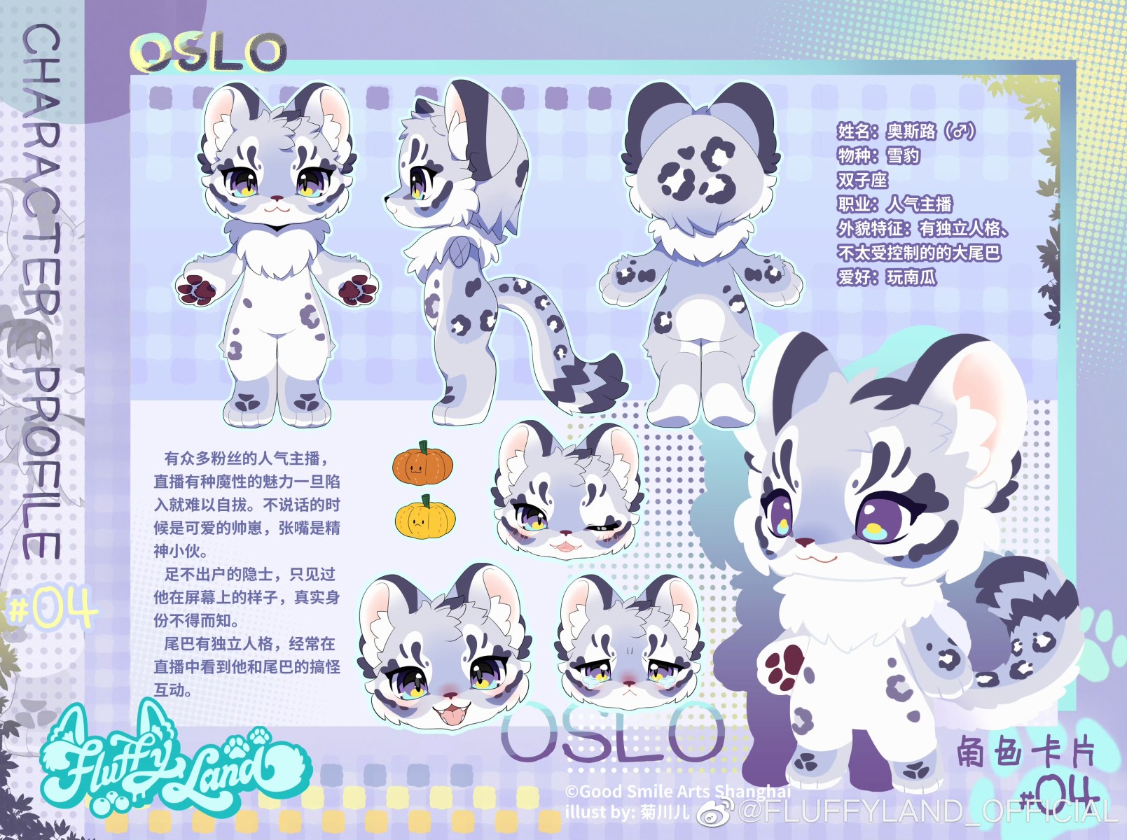 来自GoodSmile China集团原创的毛绒绒世界观IP「Fluffy Land」——新朋友小雪豹「Oslo」化身为粘土人诞生啦! 森林里的明星朋友,大家的人气主播,因为直播时无意被粉丝目睹到和自己尾巴的搞笑互动而人气激增中——在屏幕里活力四射的Oslo,最爱的是窝在暖烘烘的家中睡大觉。神秘的Oslo独自居住在深林雪原中,只有当秋天到来时,早起的鸟儿们会常常目击到南瓜地中撅着一个毛绒绒的花屁股和一条毛绒绒的大尾巴......