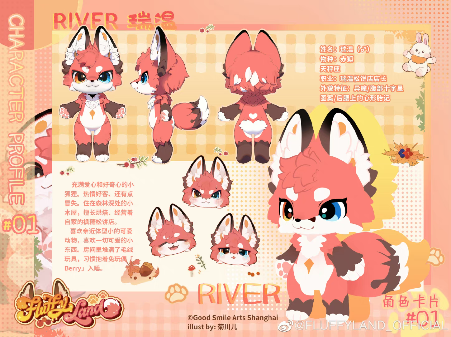 替换用表情有开心的「笑脸」、营业中的「wink脸」和委屈的「哭哭脸」三种。配件则附有南瓜玩偶「Julliet」、可以抱在怀里的替换毛绒大尾巴以及一对替换下垂耳朵,请带这只可爱宝贝回家和River一起愉快玩耍吧!