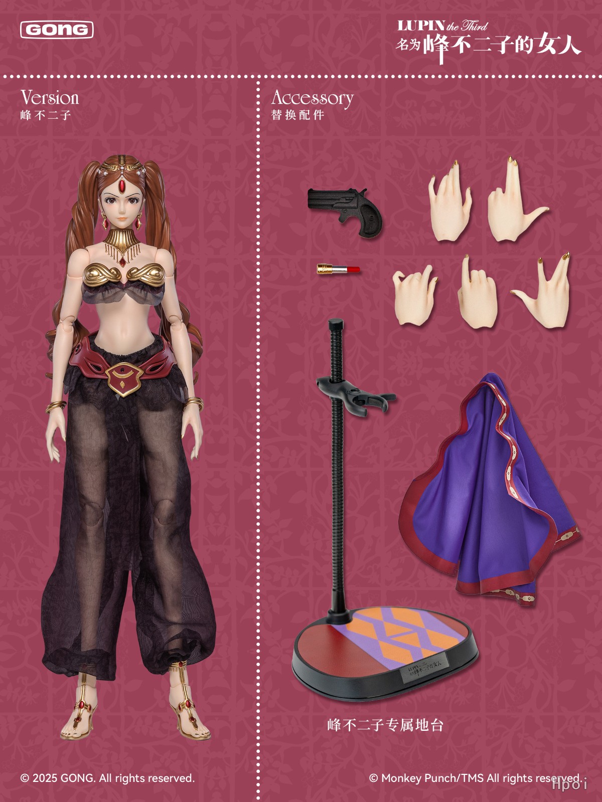 《鲁邦三世:名为峰不二子的女人》峰不二子 1/6 可动人偶,产品内含:本体*1个(含头雕*1颗、放松手型*1对、布衣套装*1套),替换手型*5只,配件手枪*1把,口红*2支,头巾*1个,底座支架*1个。产品售价729元/款。