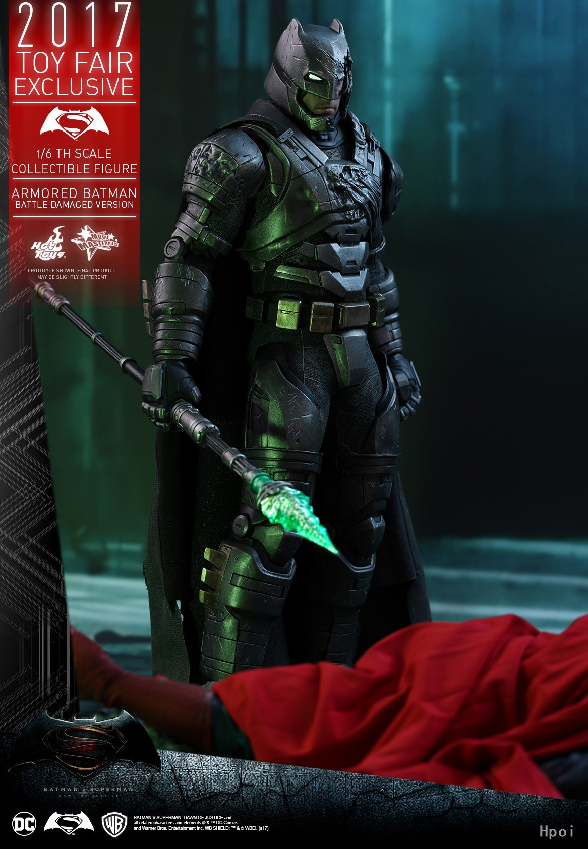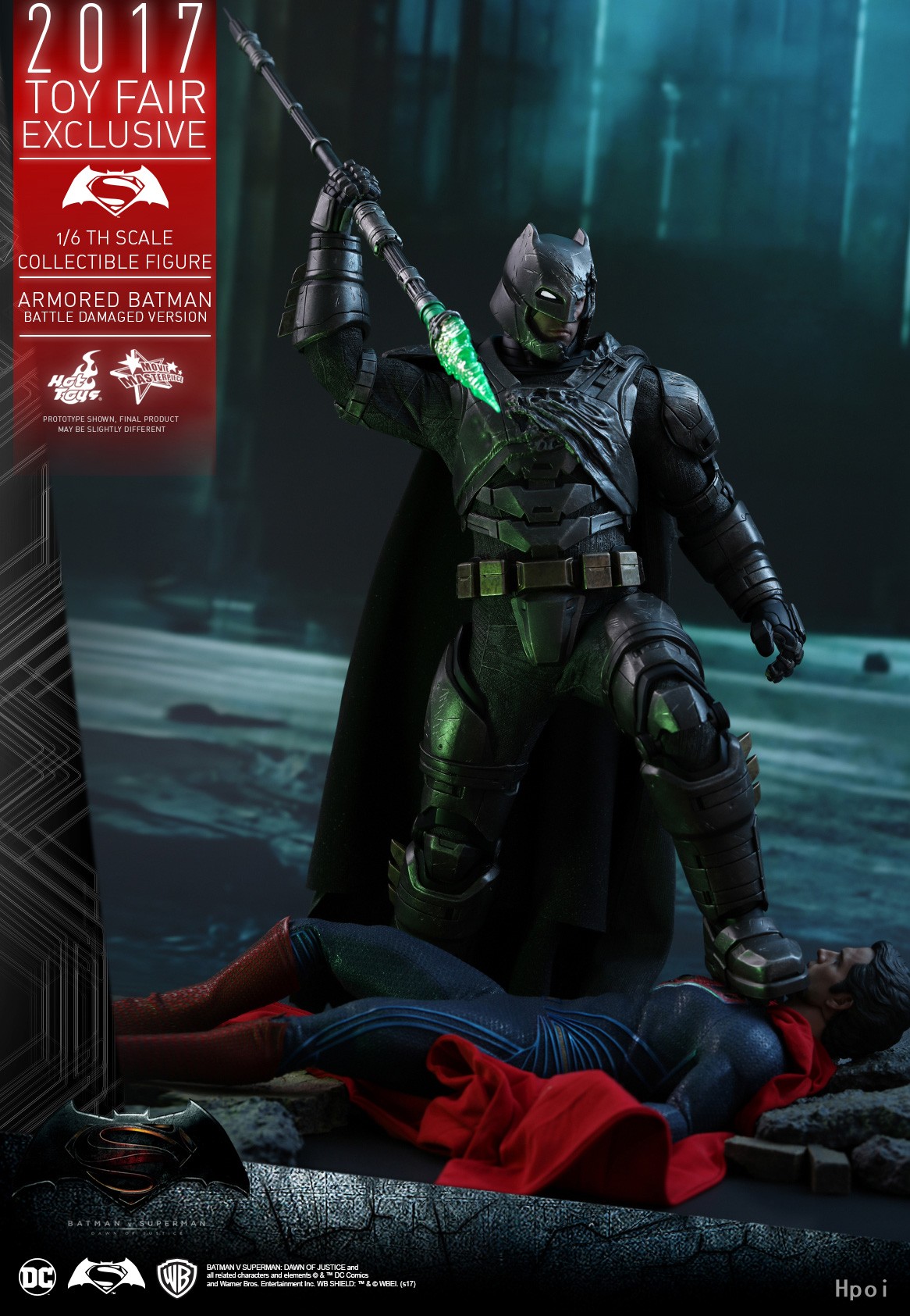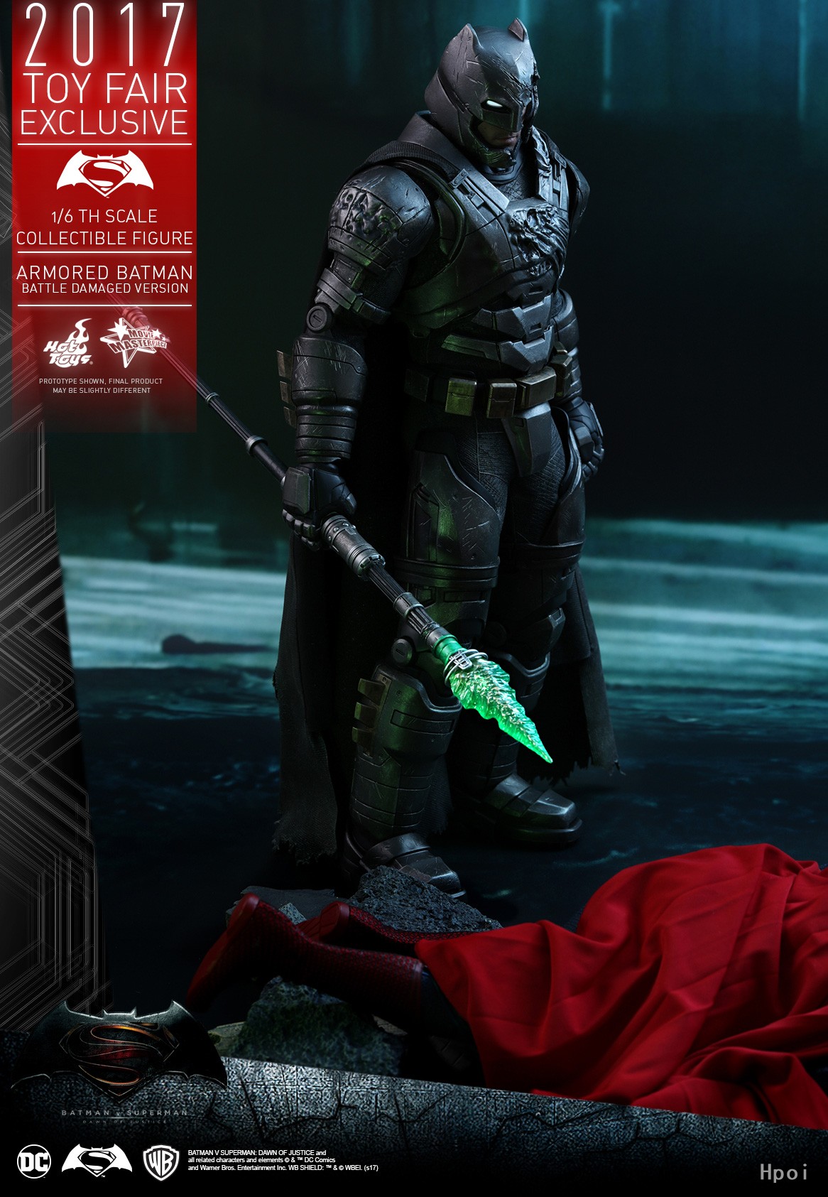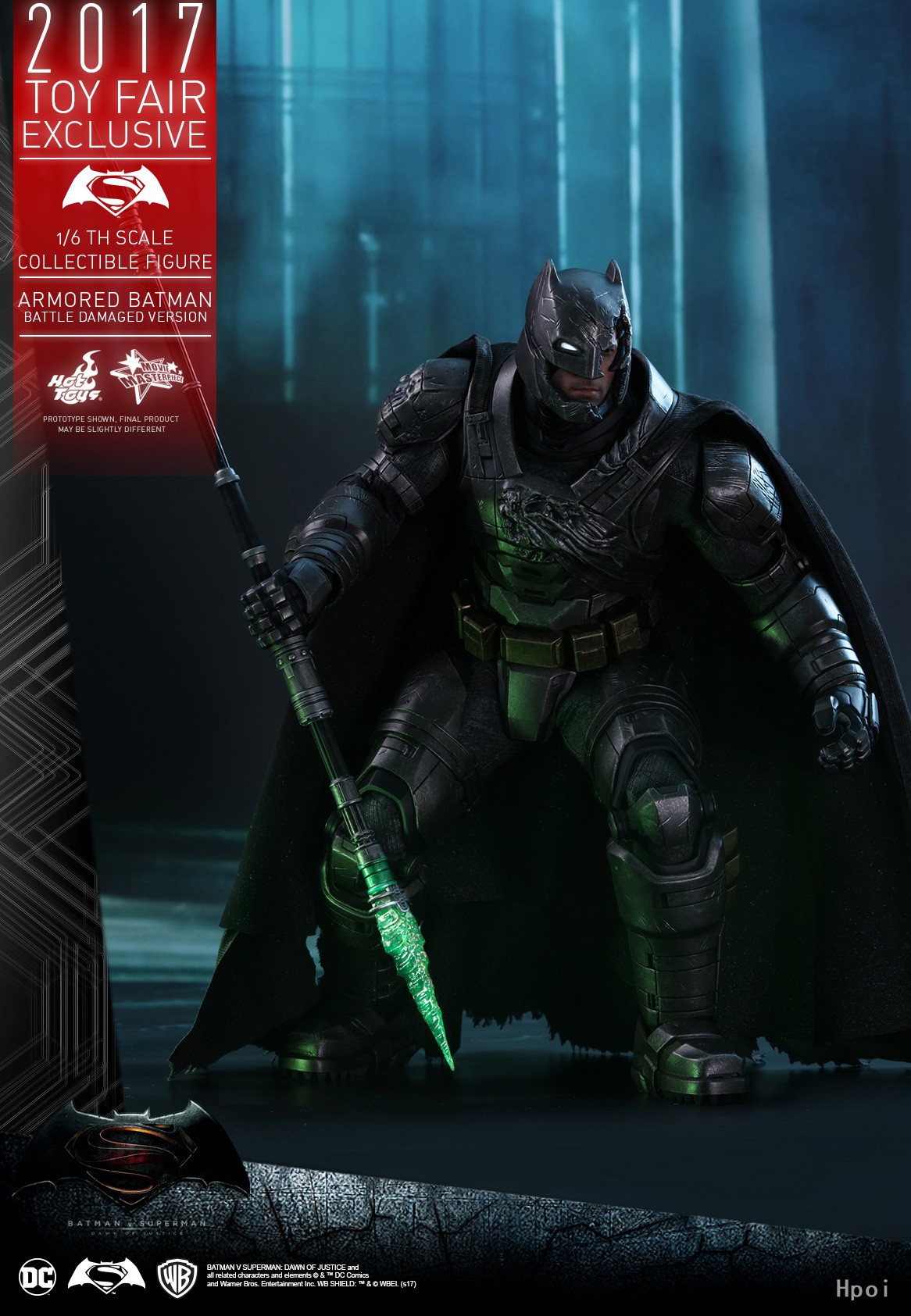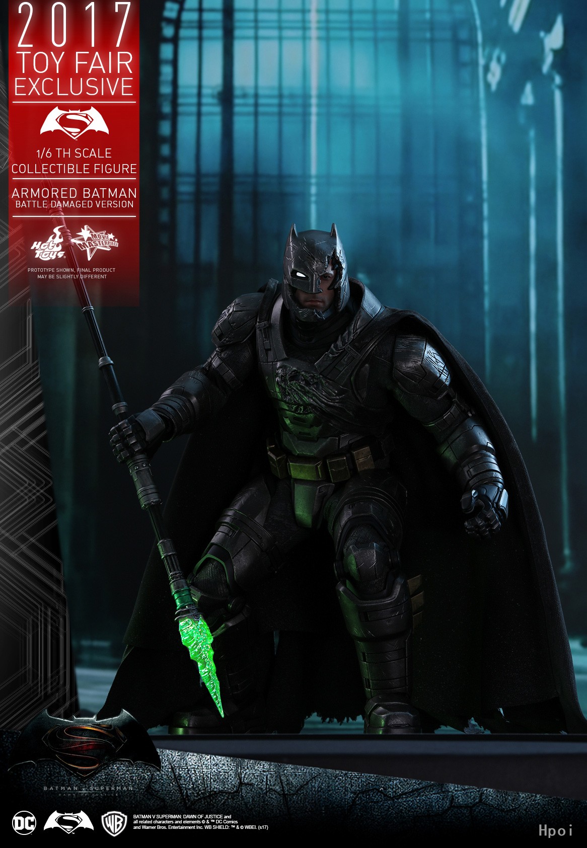 Hot Toys凭着一贯高度细致的巧手工艺,根据《蝙蝠侠大战超人:正义黎明》电影中装甲蝙蝠侠与超人的人神之战一幕,精心打造出具细腻战损效果的装甲蝙蝠侠(战损版)1:6比例珍藏人偶。Hot Toys如实按照演员Ben Affleck的壮实魁梧体型,塑造了一个高约33cm丶具有逾30个活动关节的1:6比例专用素体,当中的可动能力比上一款装甲蝙蝠侠是有所提升,更能表达到穿上造型强悍的蝙蝠装甲後的可动能力。此外,整套蝙蝠装甲强烈地呈现出他与超人决斗时所造成的严重损耗,涂装师运用匠心独运的涂装工艺,在整套重型装甲扫上备超强金属质感的炭黑色,并高度突显出装甲表层的战损旧化效果,其左前臂丶胸甲丶肩甲和斗篷上的刮痕和破损效果更为立体。此外,眼部内置LED 亮灯装置的蝙蝠头盔上的爆裂造型更突显出设计师的创意与工艺,头盔的左面被打破,露出如像真人般皮肤纹理与表情的Ben Affleck面相,同时头盔上的右眼部分则保留了LED 亮灯功能。武器配件方面,除了附有装甲蝙蝠侠独有的索勾枪丶蝙蝠榴弹炮和两款不同形态榴弹之外,更特别配备一把备有LED亮灯功能的氪石矛,加强装备以还原电影中与超人决战时的情景!