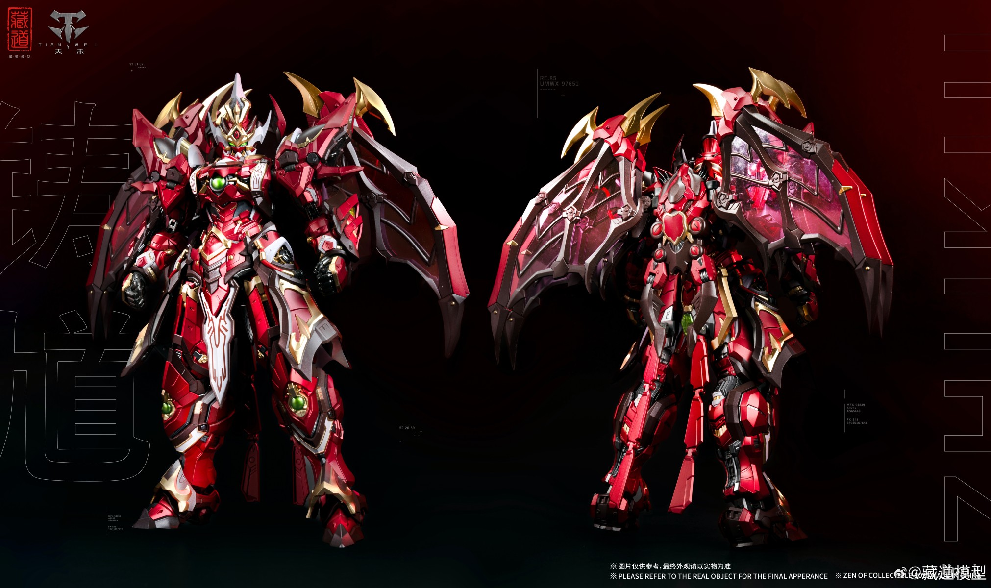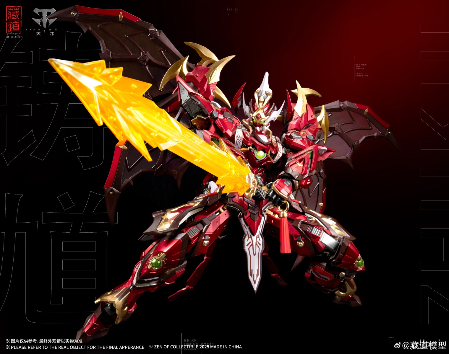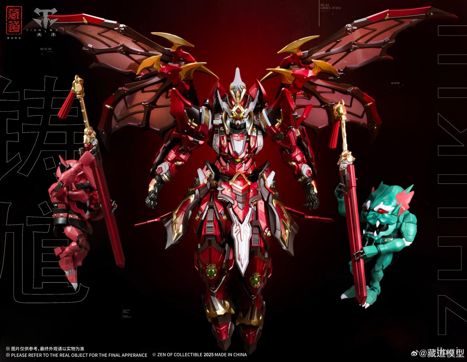 源自钟馗驱邪之典故,机甲面部保留原型豹头环眼,铁面虬鬓特点;结合传统钟馗像中‘福’象征的蝙蝠形象再设计,设置高机动助力机甲背包;搭配专属武器配件,再度演绎驱魔逐邪之神的风采!配件详情:主体x1「拘魂」x1「虚耗」x1神霄雷符x1特效大剑x1天罡真铳x1七曜星辰剑x2主体背包x1造型手x6对