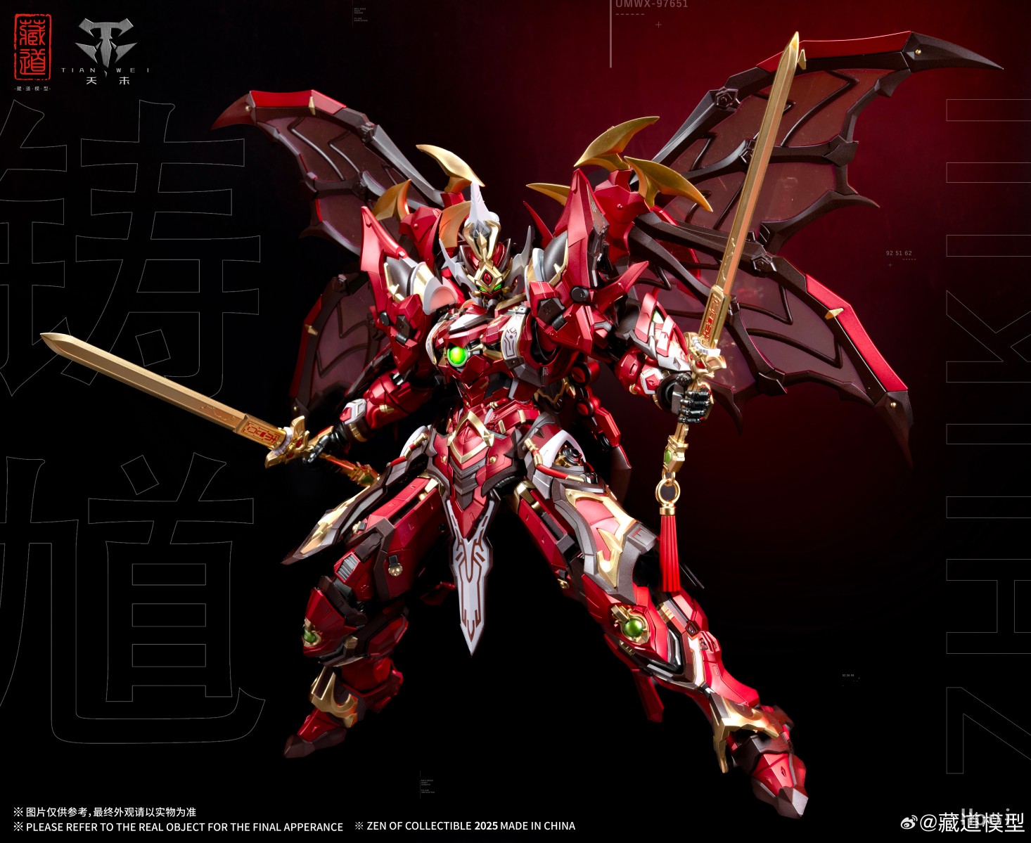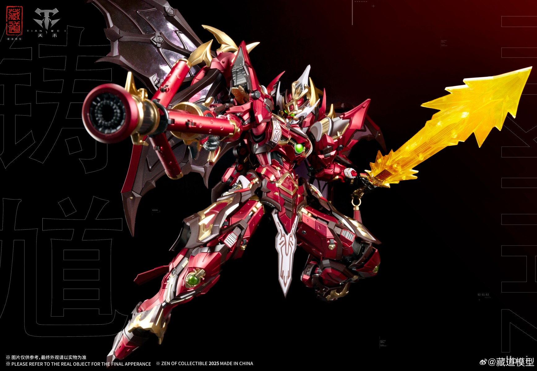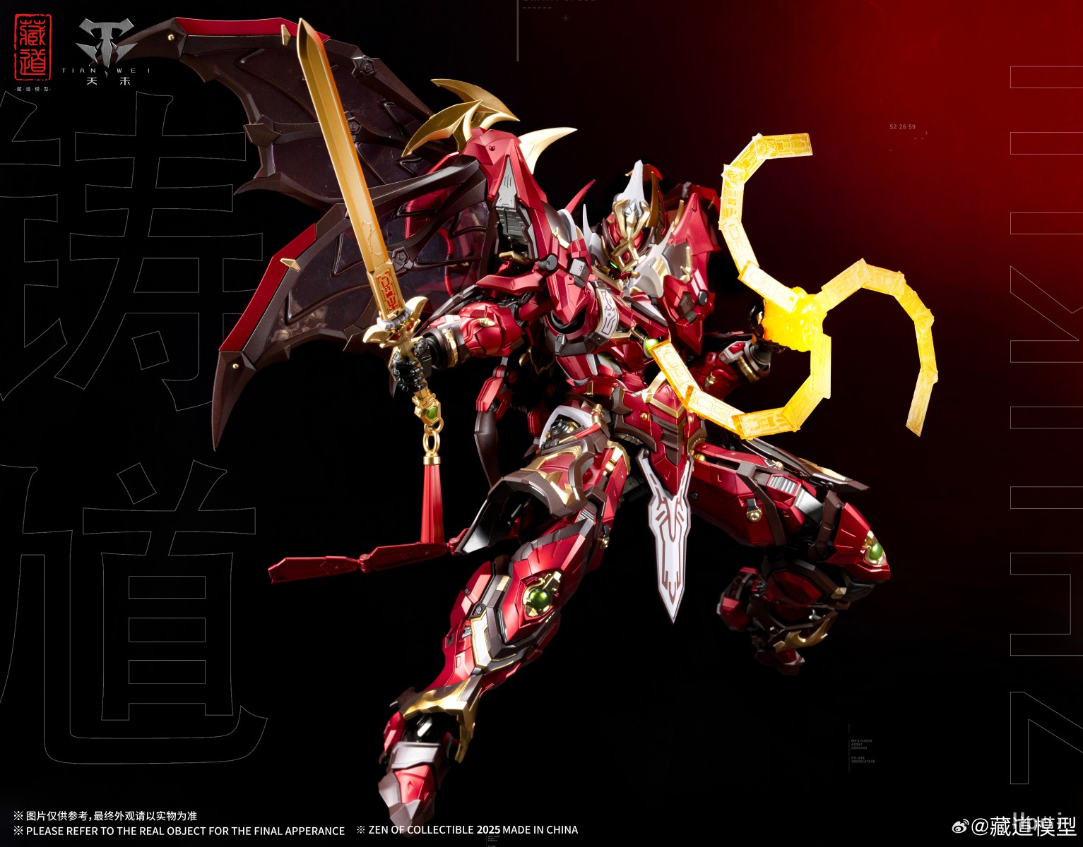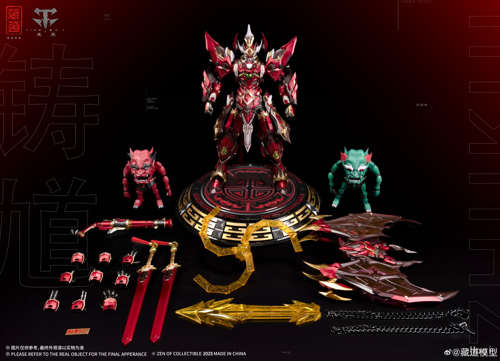 源自钟馗驱邪之典故,机甲面部保留原型豹头环眼,铁面虬鬓特点;结合传统钟馗像中‘福’象征的蝙蝠形象再设计,设置高机动助力机甲背包;搭配专属武器配件,再度演绎驱魔逐邪之神的风采!配件详情:主体x1「拘魂」x1「虚耗」x1神霄雷符x1特效大剑x1天罡真铳x1七曜星辰剑x2主体背包x1造型手x6对