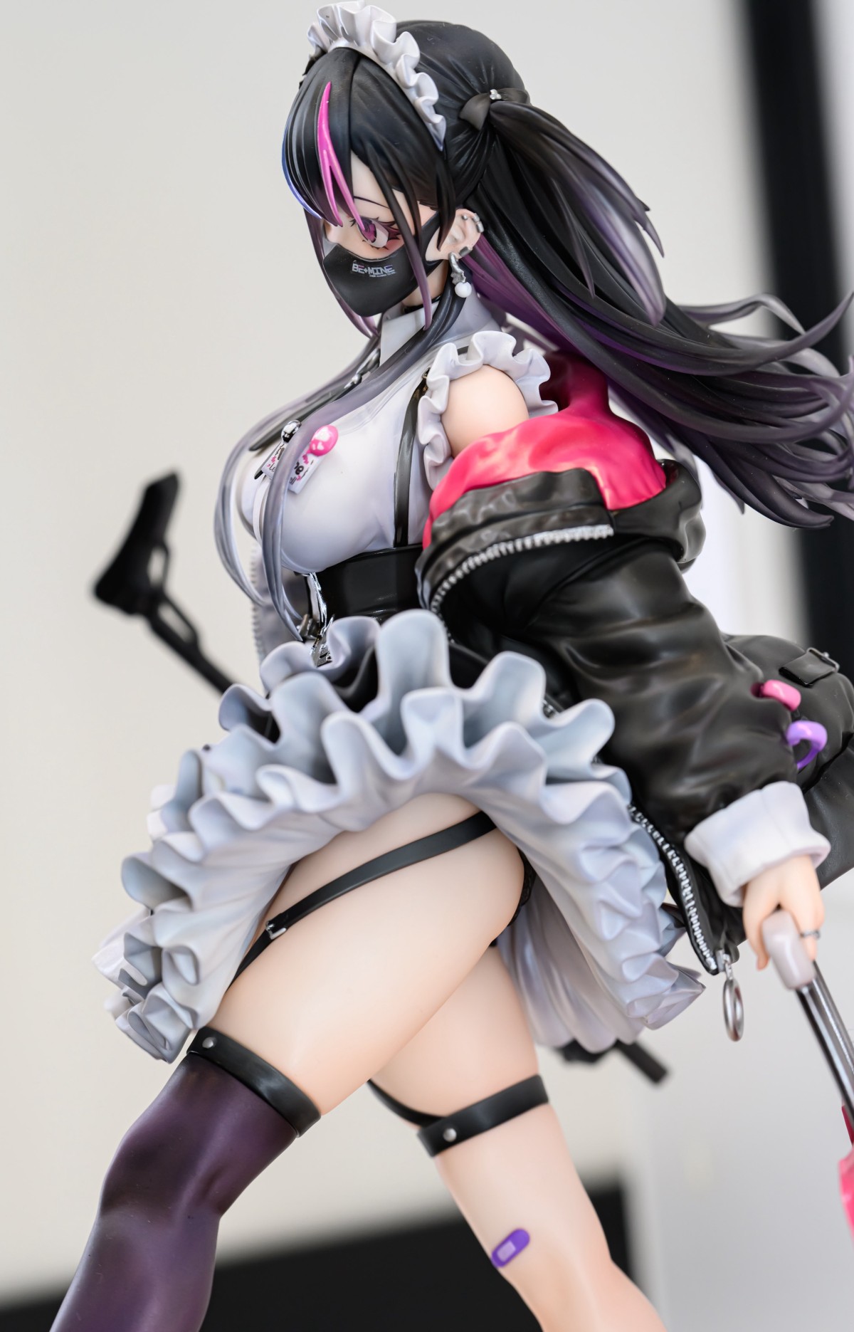 出自插畫家深井涼介展開的《ARMS NOTE》,「地雷少女」以1/7比例模型登場。身穿愛用品牌的咖啡廳制服,右手持衝鋒槍,左手持兼具防彈盾牌功能的手提箱,腳邊展開地雷群——將擁有地雷系女子時尚與危險性濃縮於一身的造型製成模型。輕柔飄起的裙子荷葉邊、具有厚重感的夾克、精緻的頭髮和各種武裝等,剛柔並濟的造型、細節部分也都徹底打造完成。光澤塗裝突顯質感的唇部與瞳孔的透明感,利用透明零件展現透明感的頭髮,光澤與霧面交錯使用的女僕服裝的質感對比等色彩也非常講究。特別是女僕服裝的荷葉邊等部位施以精緻陰影,呈現立體感與輕盈感。 夾克內裡的粉紅色施以珠光塗裝,色彩鮮艷,整體印象以華麗收尾。另外,附露出虎牙的閃亮眨眼笑臉的替換用零件,能賞玩與平常透過口罩的冷酷表情之間的反差。甜美、毒辣、可愛又有點恐怖——敬請將全新「地雷系少女」帶回家鑑賞她獨一無二的存在。