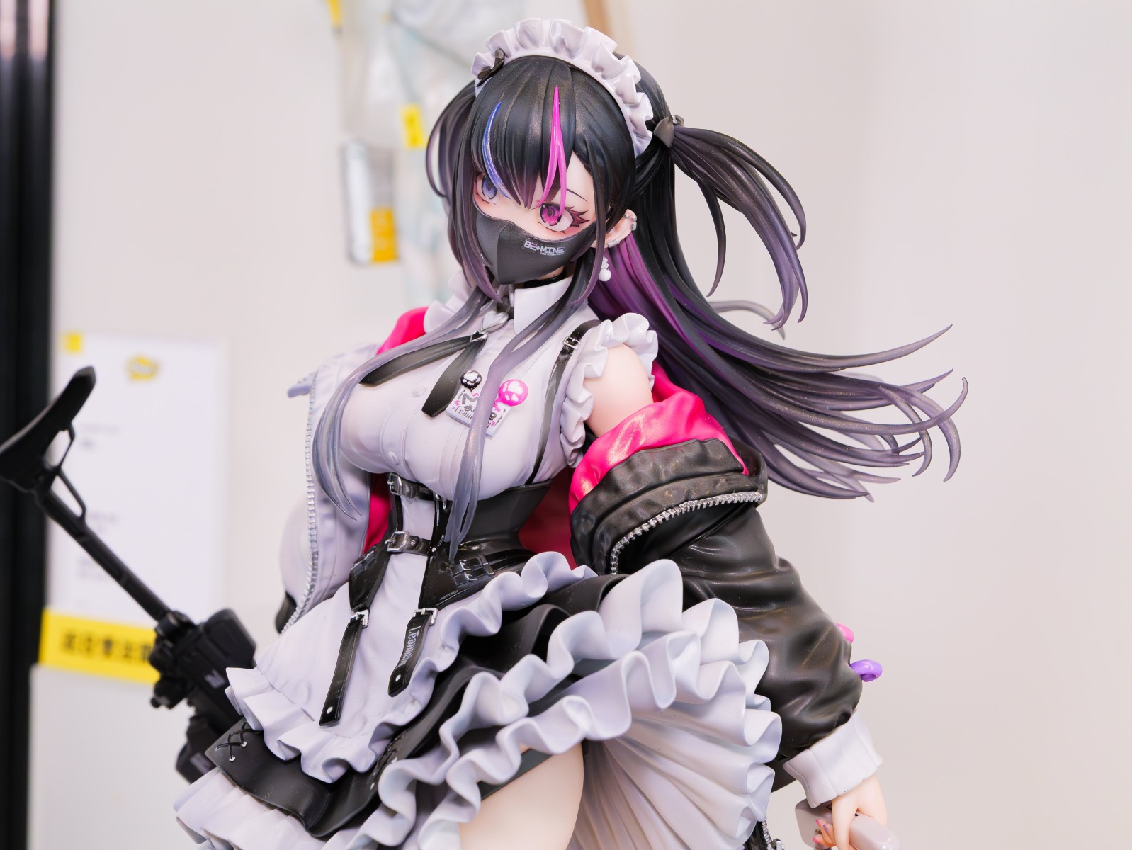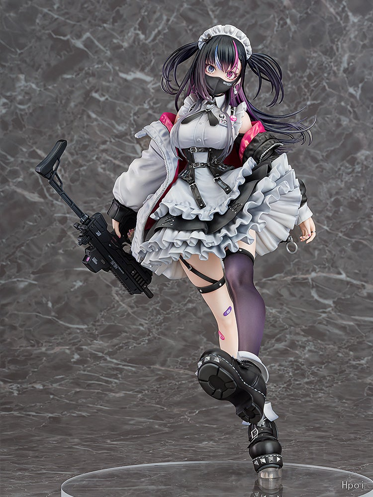 出自插畫家深井涼介展開的《ARMS NOTE》,「地雷少女」以1/7比例模型登場。 身穿愛用品牌的咖啡廳制服,右手持衝鋒槍的造型製成模型。輕柔飄起的裙子荷葉邊、具有厚重感的夾克、精緻的頭髮和武裝等,剛柔並濟的造型、細節部分也都徹底打造完成。光澤塗裝突顯質感的唇部與瞳孔的透明感,利用透明零件展現透明感的頭髮,光澤與霧面交錯使用的女僕服裝的質感對比等色彩也非常講究。特別是女僕服裝的荷葉邊等部位施以精緻陰影,呈現立體感與輕盈感。 夾克內裡的粉紅色施以珠光塗裝,色彩鮮艷,整體印象以華麗收尾。 另外,附露出虎牙的閃亮眨眼笑臉的替換用零件,能賞玩與平常透過口罩的冷酷表情之間的反差。甜美、毒辣、可愛又有點恐怖——敬請將全新「地雷系少女」帶回家鑑賞她獨一無二的存在。
