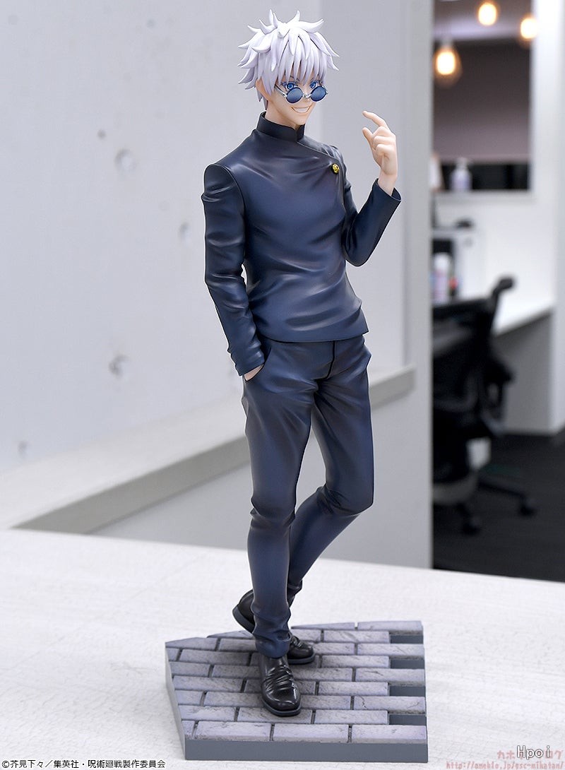 出自電視動畫《咒術迴戰》第二季「懷玉‧玉折篇」,以任務前的情景為主視覺,將身穿高專制服姿態的「五條悟」製成1/7比例模型。拆下墨鏡的六眼和嘴角帶著調皮的笑容。在高專時期才會感受到的傲慢表情,呈現出強而有力但又顯得可愛的模樣。每根頭髮、制服的皺褶、指尖細部也講究製作的造型,以及簡單但輪廓清晰且精緻的塗裝表現,處處為看點。重現混凝土質感的台座可與「夏油傑 高專Ver.」(另售)一起擺飾。敬請帶回家鑑賞吧。