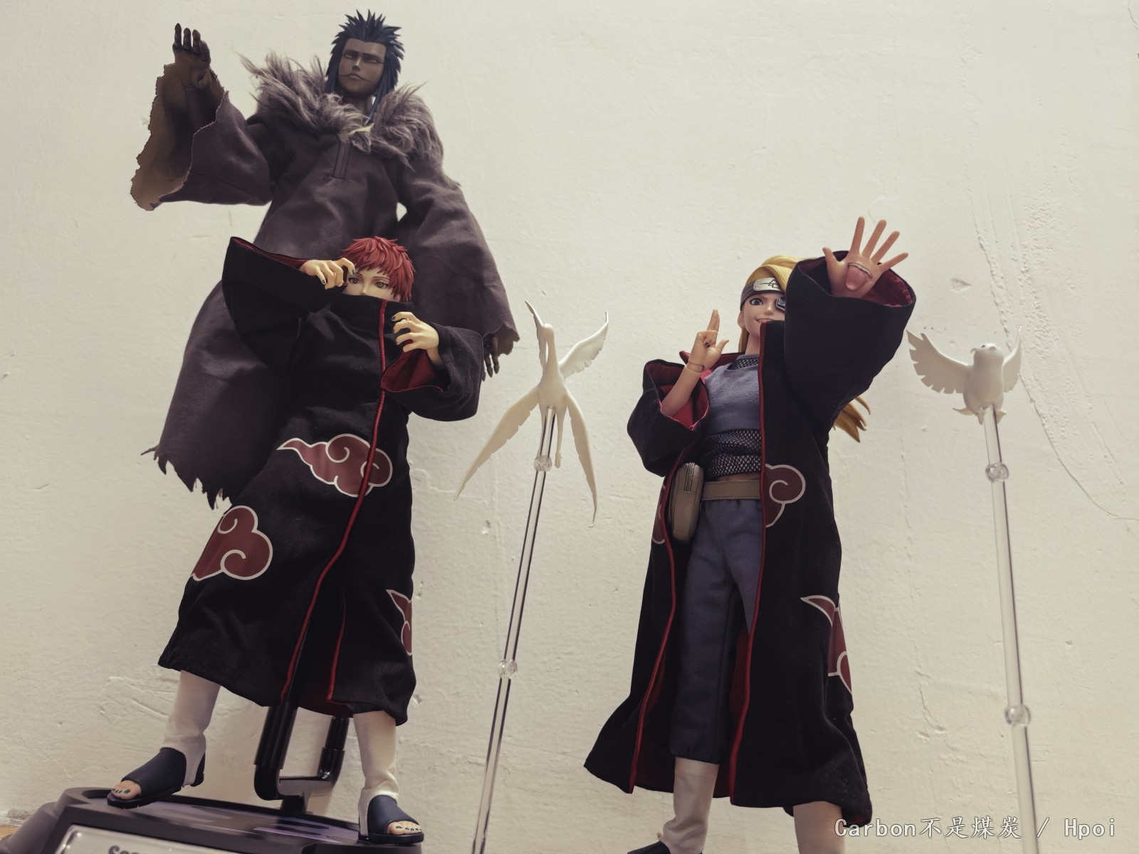产品配置单:-二次元比例男素体*1 (带纹身图案)-头雕*1 (微笑表情)-替换面*1(龇牙表情)-可动眼球*6(小直径虹膜x4、大直径虹膜x2)-可动眼球调节棒*1-替换手型*8-斗笠*1-眼罩*1-硅胶手臂*1-鞋子*2-人偶展示地台*1服饰:-晓外袍*1(红云图案印刷,领子及衣身均镶嵌金属线可造型,衣服门襟内含磁铁开合)-网内衣*1-上衣*1-长裤*1-挎包*1武器配件:-起爆黏土*6-起爆黏土支架*4特典:-头雕*1(吐舌表情,配飘逸发型)