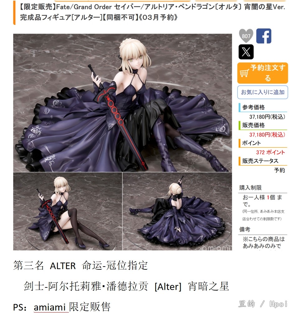 中文名称:命运-冠位指定 剑士-阿尔托莉雅・潘德拉贡 [Alter] 宵暗之星