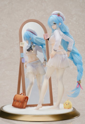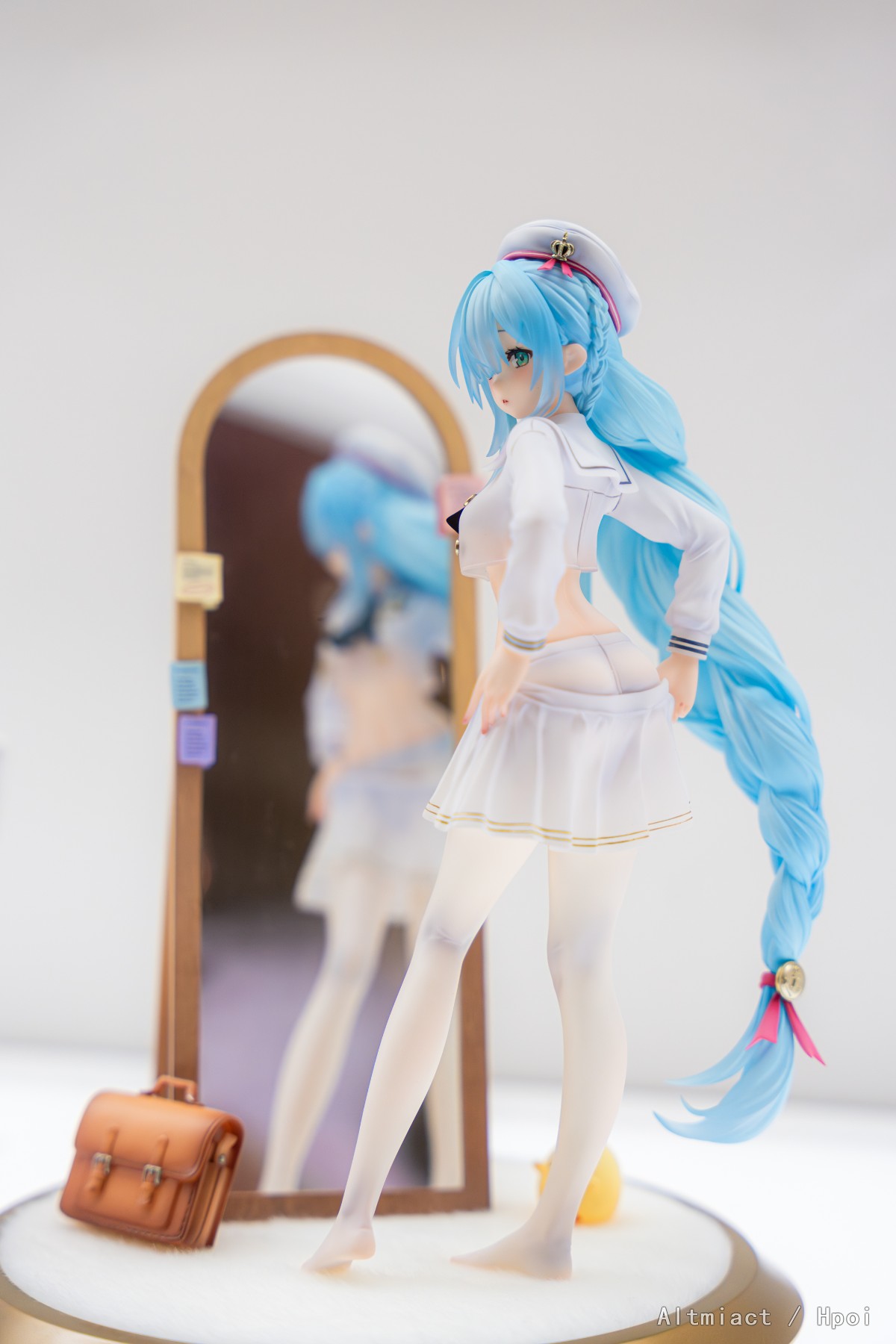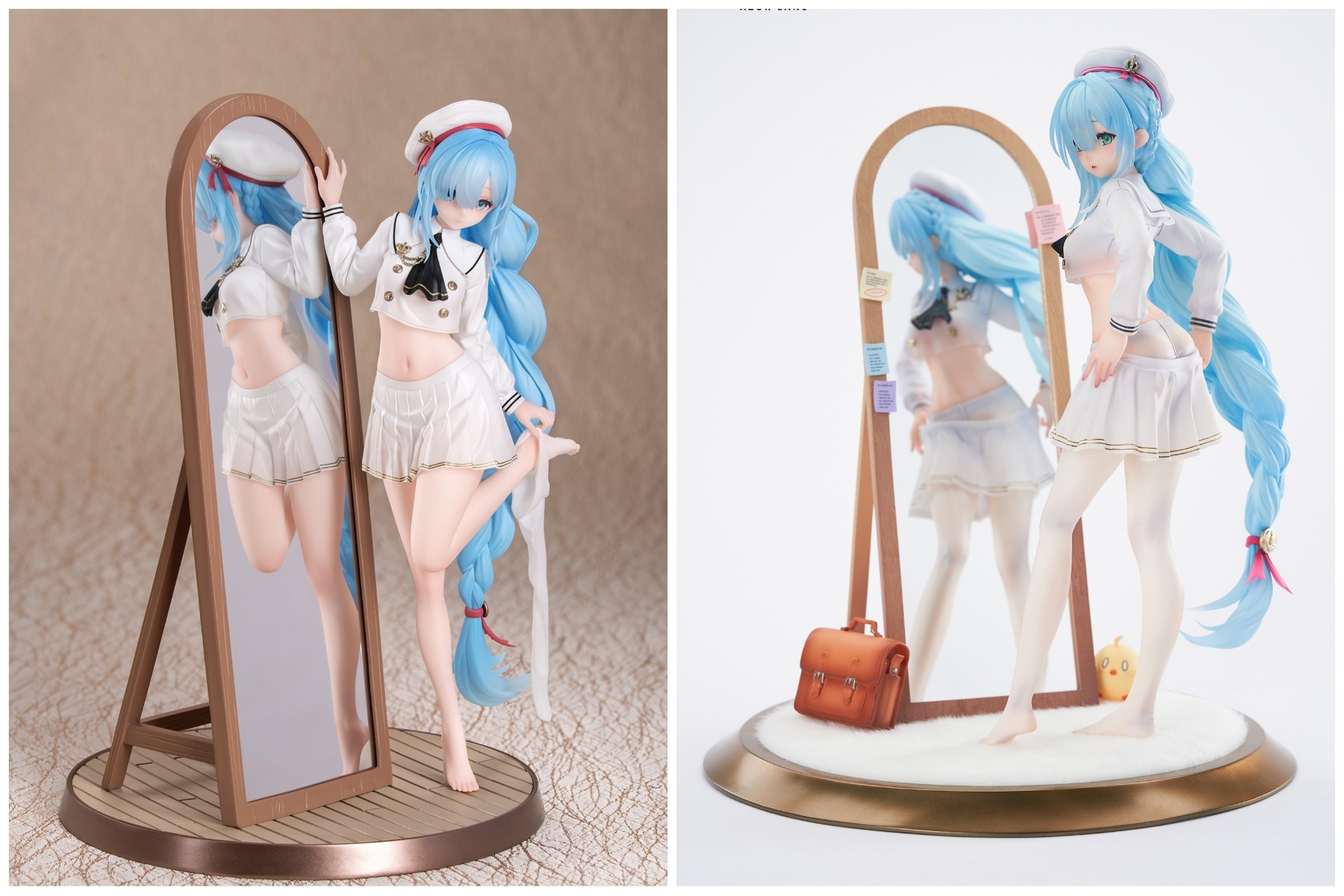 弥漫少女芬芳的房间内,「雅努斯」正独自对镜更衣,等身长镜倒映出她柔软的身姿。蝉翼般轻薄的衣裙、流水般垂落的淡蓝色长辫,皆以透明材质打造。白色裤袜的褶皱阴影,纽扣配饰的金属光泽,也均被细腻呈现。地台采用真实绒毛植绒处理,搭配精美的全身镜、可爱的书包以及不知所措的啾啾,可自由组合还原这温馨一刻。