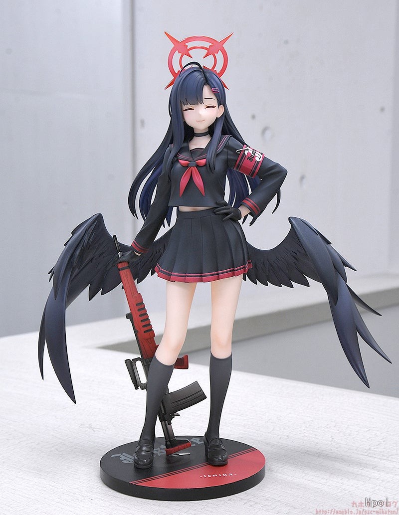 出自人氣遊戲《蔚藍檔案 Blue Archive》,所屬於三一綜合學園,正義實現委員會的一員「一花」化身為比例模型。忠實地重現一貫穩重細長的特色表情,以及修長的站姿。一花愛用的突擊步槍(Red Dragon)的質感,還有擁有存在感的翅膀細節,於造型與色彩上細處都講究地處理。敬請將擅長交際且擁有可靠前輩個性的一花帶回家吧。