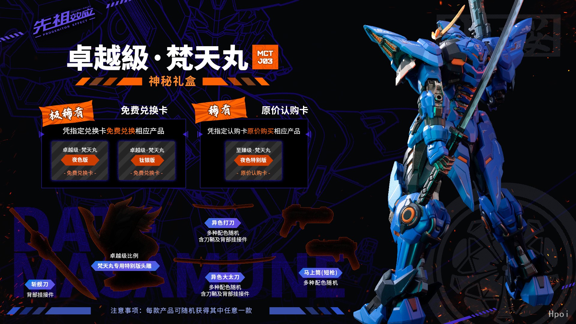 本体 x 1太刀·大俱利伽罗 x 1 打刀·大俱利伽罗之影 x 1 能量弹型射击步枪 x 1 马上筒(短枪) x 2 短枪连接件 x 2 后裙甲武装挂接件 x 1臂刃连接件 x 2手型 x 5手型收纳组件 x 1金属地台及支架 x 1磁吸铭牌 x 1神秘礼盒 x 1说明书 x 1保修卡 x 1 (内含产品注册S/N 码,通过微信公众号注册,可获得积分,用于兑换积分商品)注:S/N 码为产品售后凭证,请注意保存不要丢弃!
