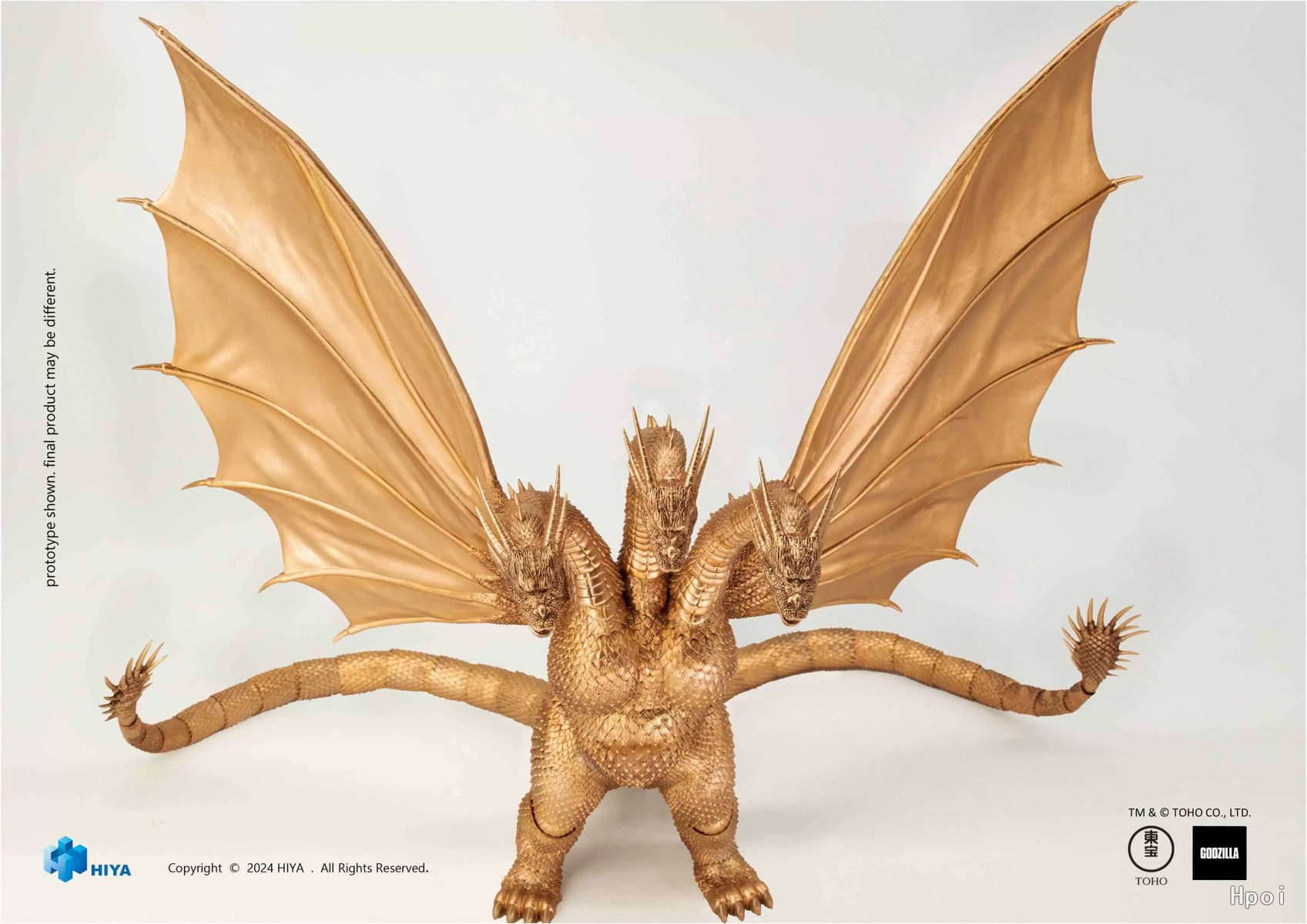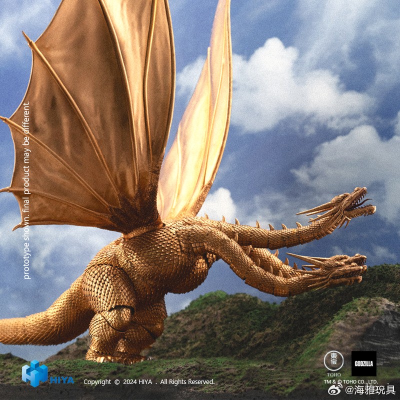 王者基多拉本体高约33cm,翼展约47cm,全身赋予多个关节,翅膀部分更得益于采用软胶材料与内置铁丝的组合在提供大范围可动范围同时更可精细调整翅膀角度,搭配附赠的3个支架让您随心还原剧中站立展翼威吓等多种姿态。