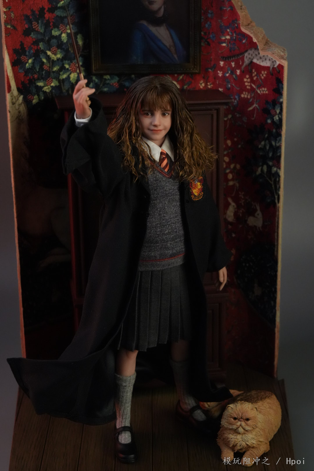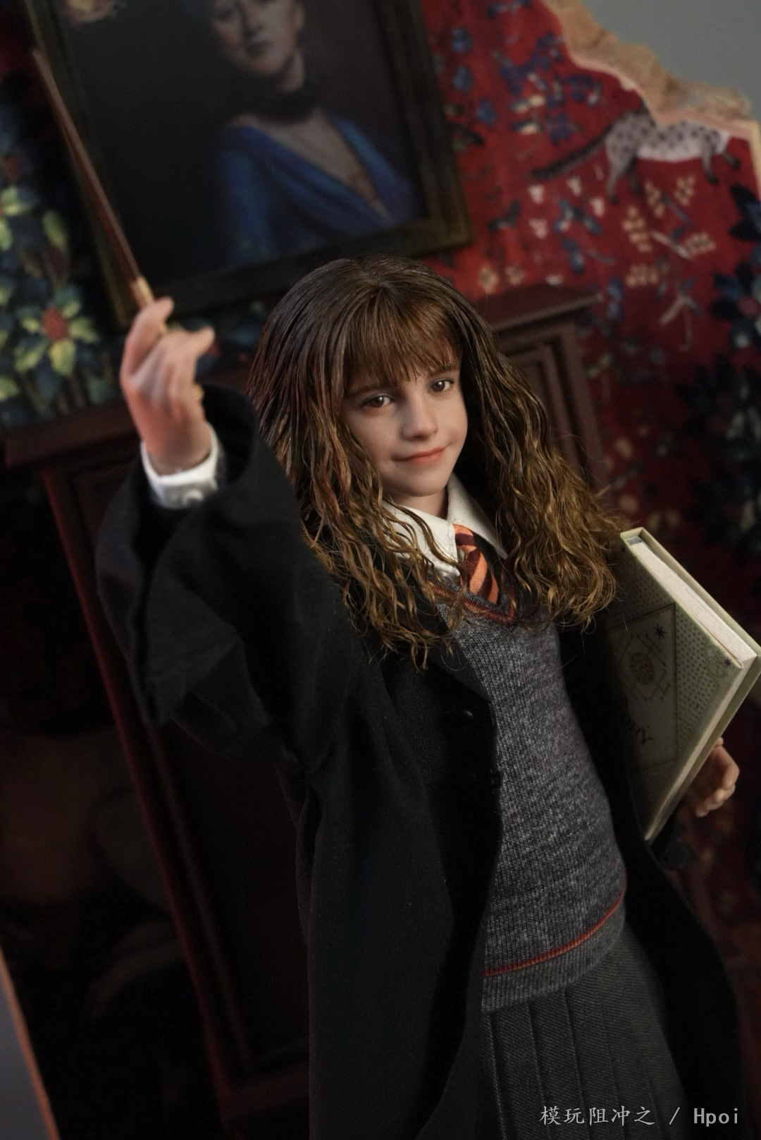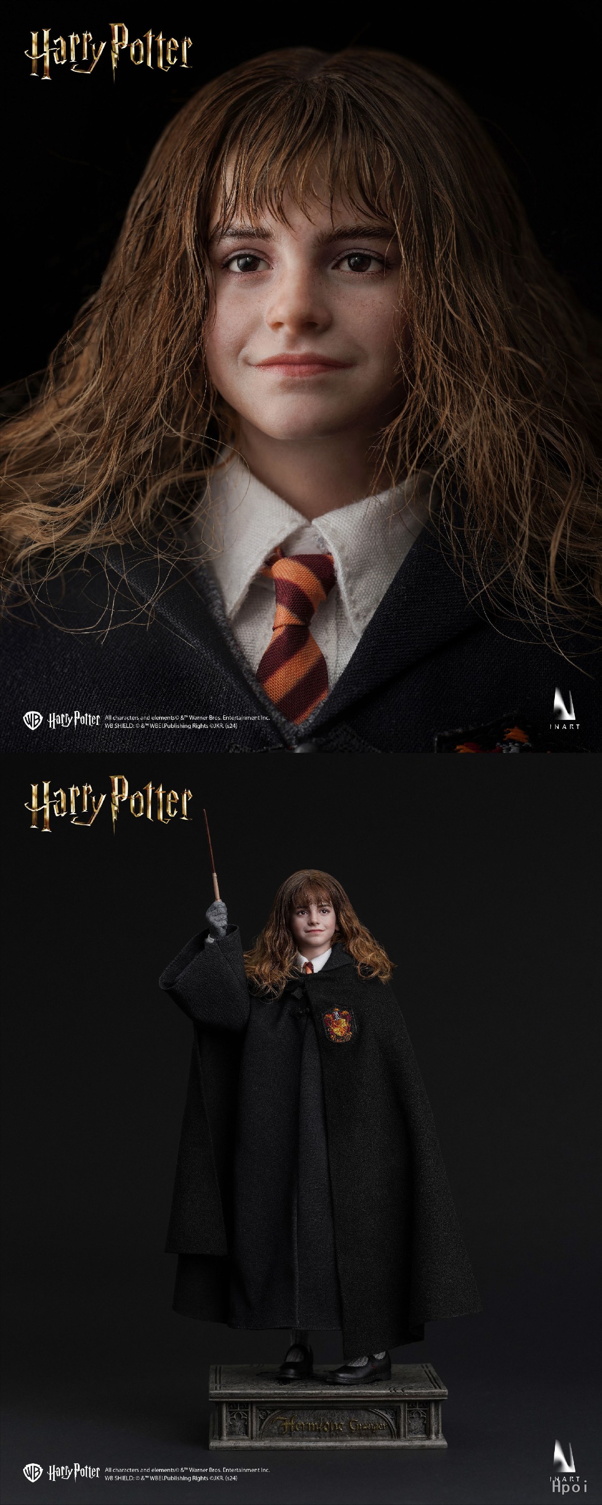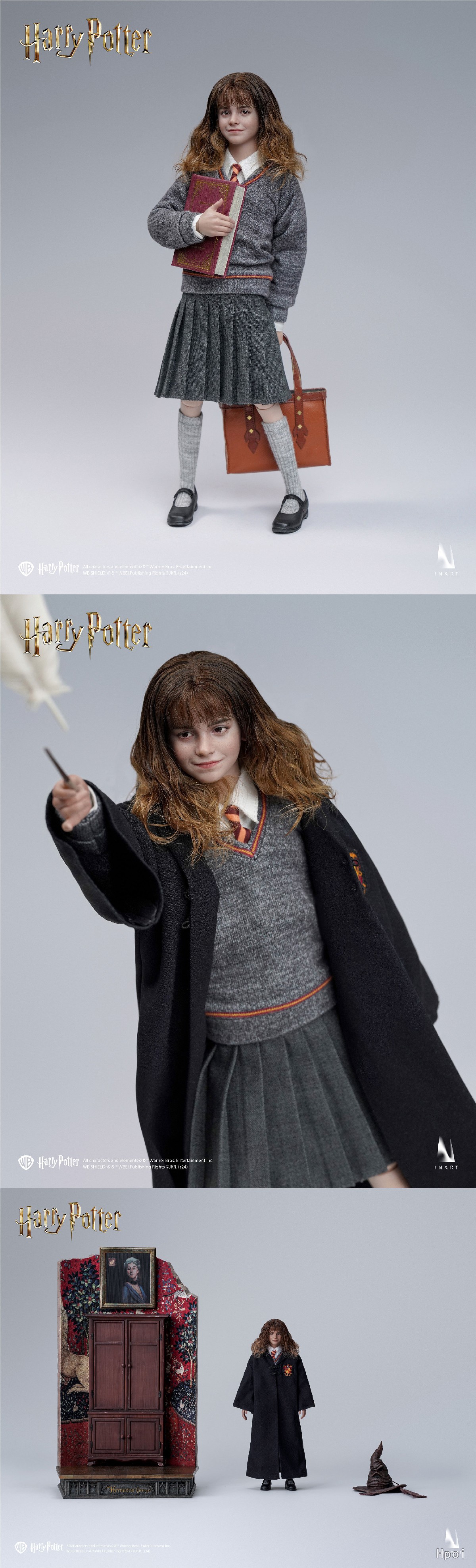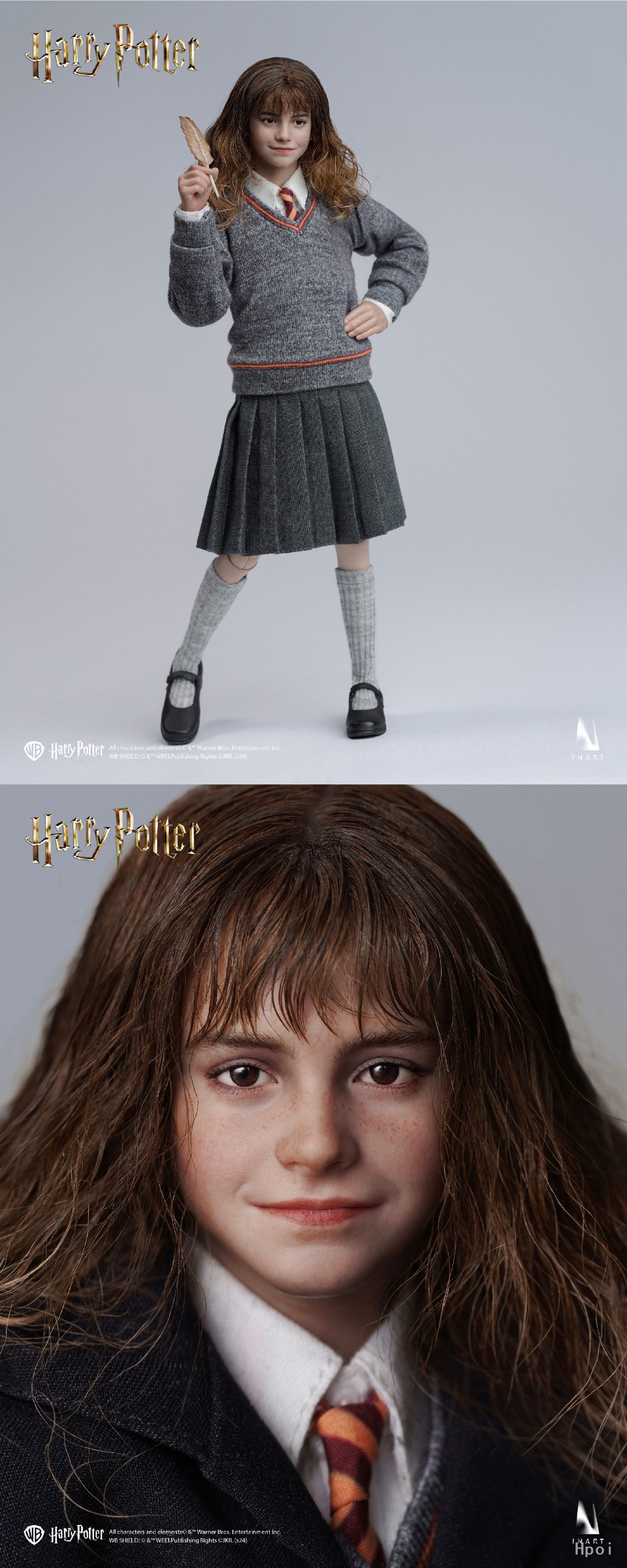 作品配件:INART可动素体*1,可动眼植发头雕*1,学院服衬衫*1,格兰芬多领带*1,学院服毛衣*1,格兰芬多围巾*1,学院服裙子*1,学院服巫师袍*1,学院服冬季斗篷*1,黑皮鞋*1双,袜子*1双,放松手手型*1对,持握法杖右手手型*1,持握法杖右手兰花指手型*1,捧书右手手型*1,握笔右手手型*1,举手右手手型*1,放松手套手型*1对,握持法杖右手手套手型*1,霍格沃茨分院帽*1,法杖*1,羽毛*1,羽毛笔*1,墨水瓶*1,包*1,克鲁克山*1,霍格沃茨教科书*2,霍格沃茨校史*1,魔法史*1,诗翁彼豆故事集*1,高级场景式磁吸地台(内含标准地台)*1,INART植发头雕盒*1