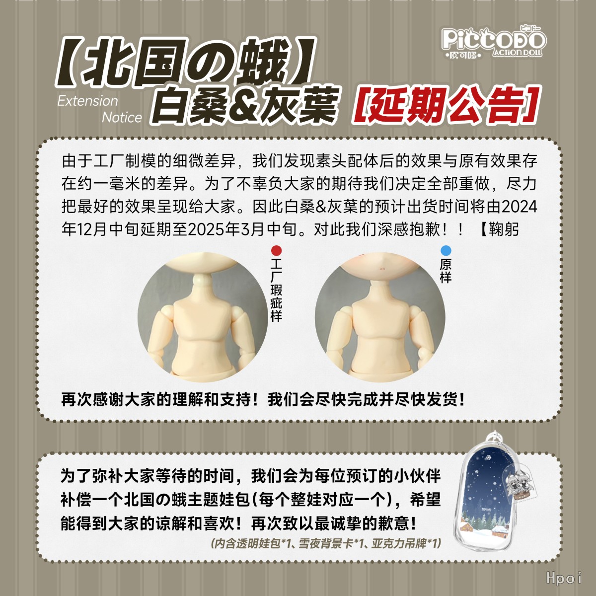为了弥补大家等待的时间,我们会为每位预订的小伙伴补偿一个北国の蛾主题娃包(每个整娃对应一个),希望能得到大家的谅解和喜欢!再次致以最诚挚的歉意!(内含透明娃包*1、雪夜背景卡*1、亚克力吊牌*1)