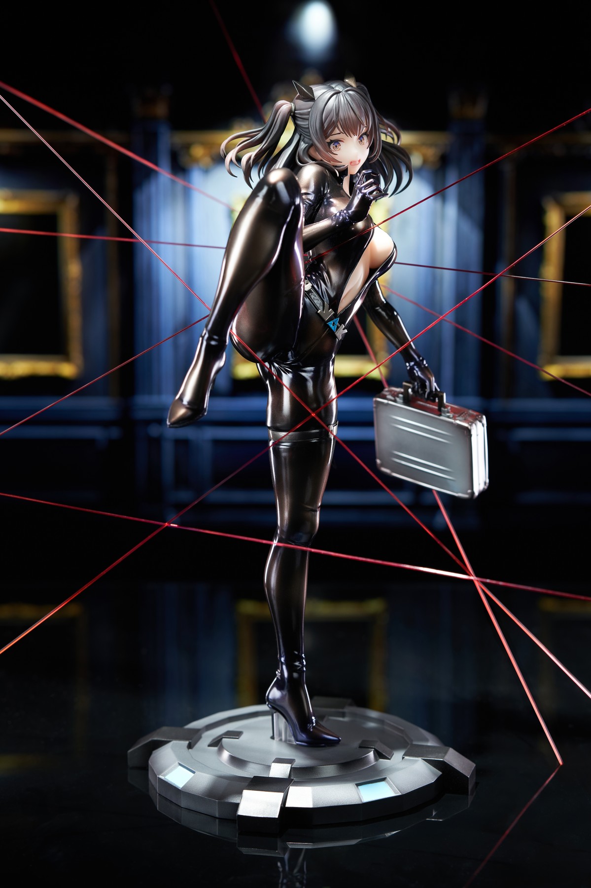 “代号S,准备完毕! ”身着黑色紧身服,手提银色公文箱,搭配专属展示地台,手办造型生动呈现了莎赫拉查德穿越红外安防系统的紧张姿态。黑色紧身服采用大量珠光漆面涂装,使得她的身形曲线在灯光折射下更加立体迷人,极大增强了视觉的层次丰富度。