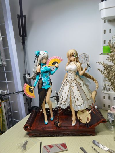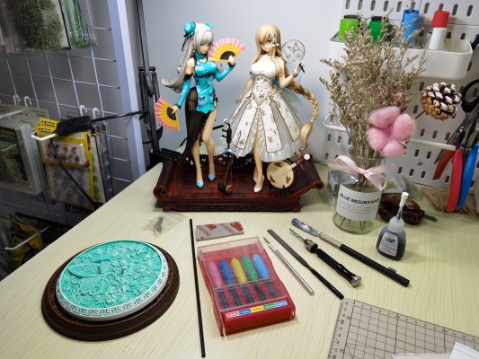 早在宝钗开定的时候我就想象过,把她和黛玉摆放在一起肯定十分有意思。可是今天收到货后发现宝钗的底座直径比黛玉稍大,导致两人摆在一起时的距离过宽,失去了那种联系紧密的互动感。在稍微搜索了一下工作室中的素材储备后,发现有一个去年买的微型红木美人榻正好可以用来做一个双人底座,凭借着这股兴致,我马上开始了制作~