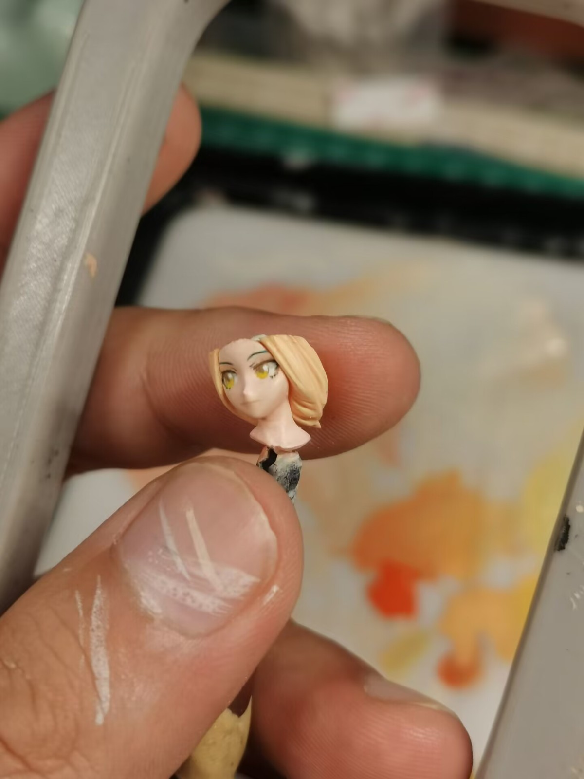 肤色和脸涂好了,正思考衣服往什么方向去润色,然后瞅到已经被我拿去吃灰很久的魔镜粉(本来是想代替部分金色丙烯颜料,但很难涂满就弃之不用)