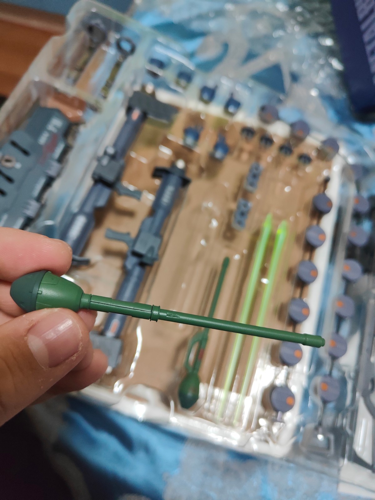 造型手很难拔,先拍两张站姿,等周末再好好品鉴。主体做工非常优秀,武器的做工就差强人意了,甲拳弹握把上的巨大缺肉水口让你知道你玩的真的是万代。