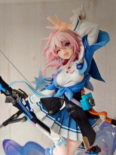 心心念念的三月七终于到了,这次APEX做得非常好没有让我失望。头发的锐度、面相、衣服饰品和弓箭的细节都做得很好,最后胖次没改大好评。在地台特效件和弓箭的加持下也是一个柜霸了,就是单腿站立让我有点担心久了会不会歪。小缺点一个是刚开时胸上沾了点胶我自己拿纸巾擦干净了不知是个例还是普遍情况,还有地台摸着油乎乎的。