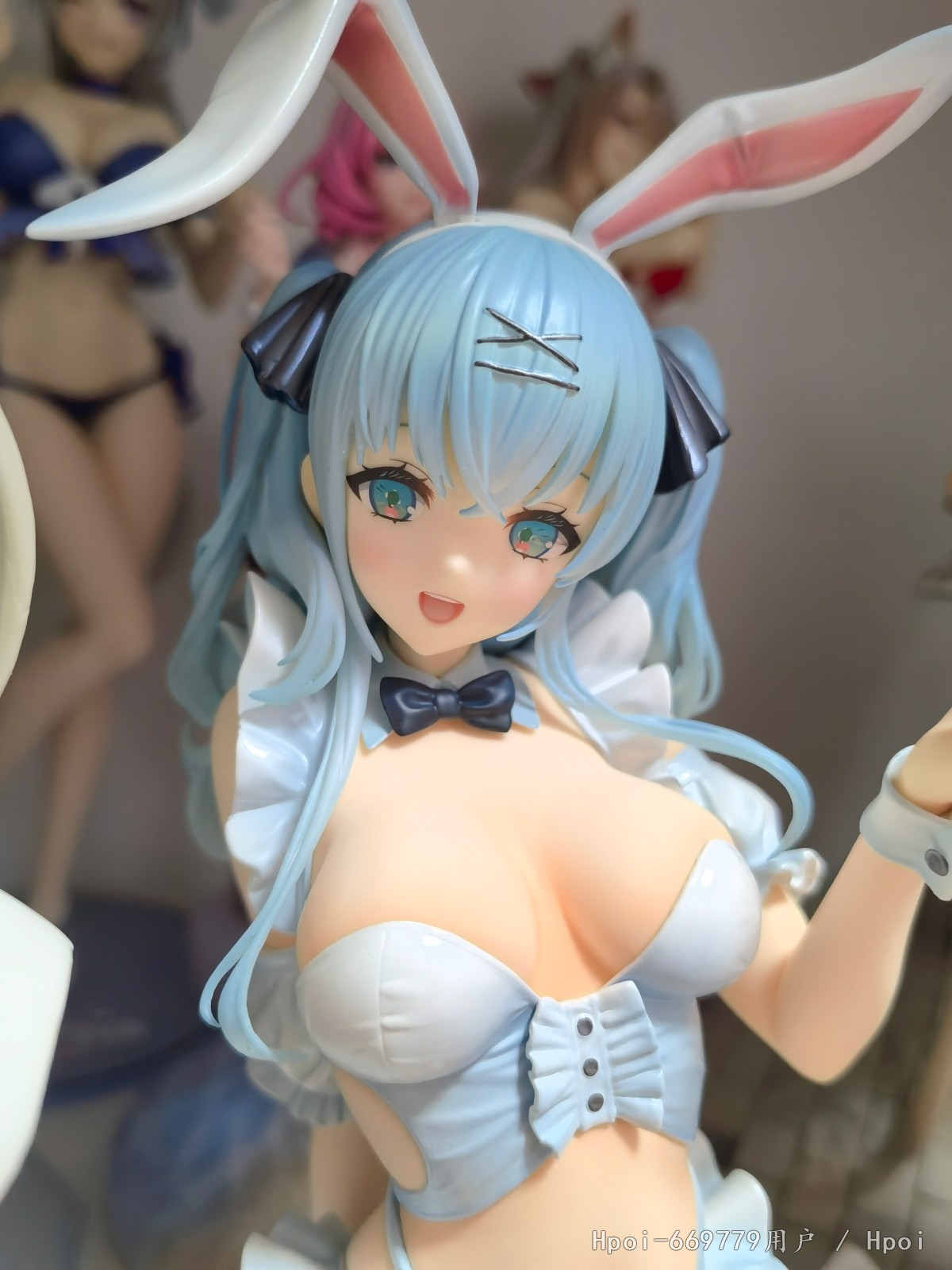 到货随手拍记录,清纯系面相+双马尾+水蓝色头发,简直是在xp上蹦迪,虽然对兔女郎已经审美疲劳了,还是普露,漆面瑕疵以及接缝什么的都用爱包容了,原价感觉不值当,这款比例不大,瑕疵也不少,但是打个七八折合眼缘入还是可以的。 这个小屁墩感觉做矮了,不垫东西有点后仰,虽然也比较稳当,但还是垫了三包卡,正坐要好看一些。